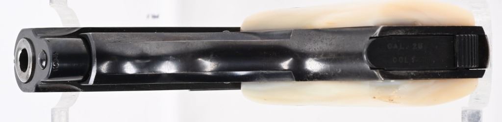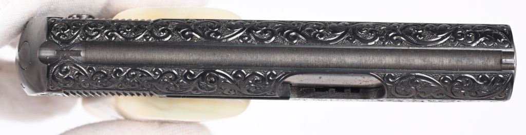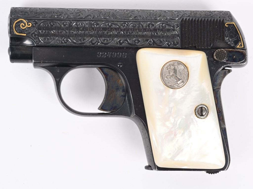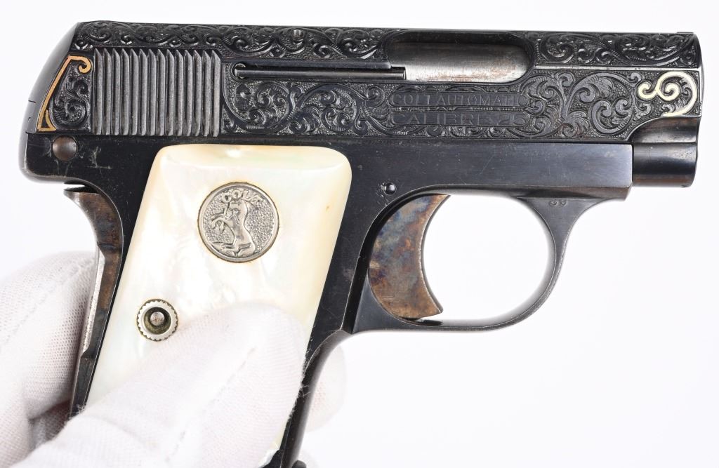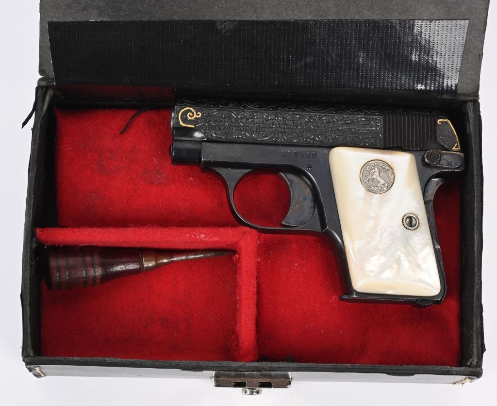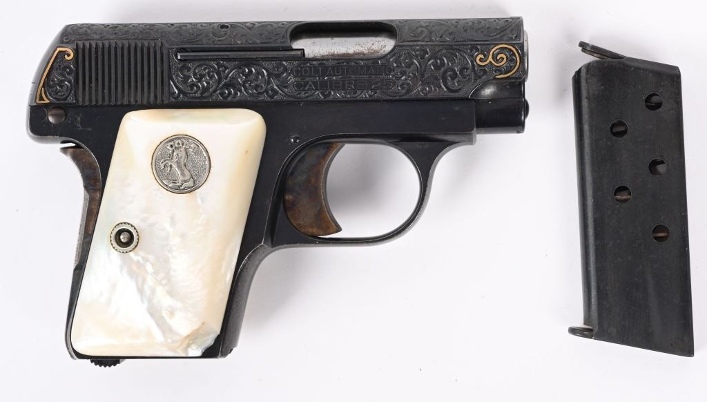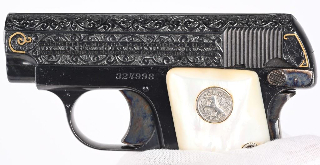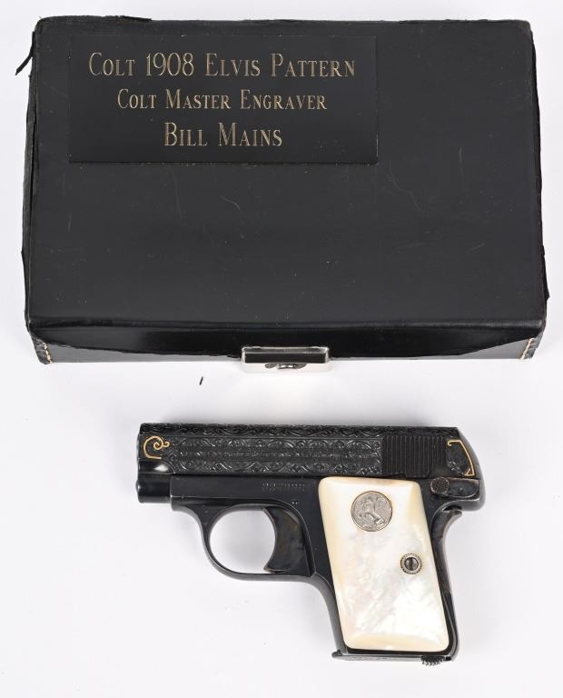 SERIAL 324998 BARREL 2". CALIBER .25 ACP. MADE IN 1923. "One of the Last of the Old School Hammer and Chisel Engravers in America." Bill passed away in 1913. He was the primary Colt factory engraver from 1967 to 1972, and is attributed in the books with having engraved more second generation Single Actions, by far, than anyone else. Gun is signed MAINS on forward bottom of slide. Although Colt frowned on signing the engraving, most of Bill’s factory engraved colts are stamped. Box states Elvis Pattern . Slide is completely engraved with American scroll with gold inlay at front and rear of slide on both sides. Finish is blue with case color grip safety and trigger. Grips are thick MOP with silver medallion. Blue magazine is stamped Cal 25 Colt. Gun appears in as new condition with small chip at right front toe of pearl. Comes in black case. C&R