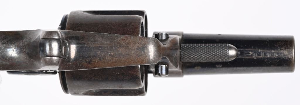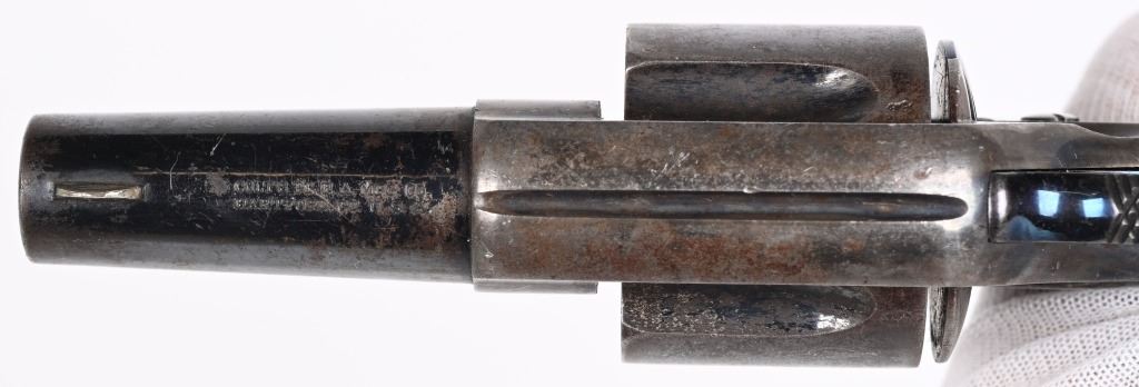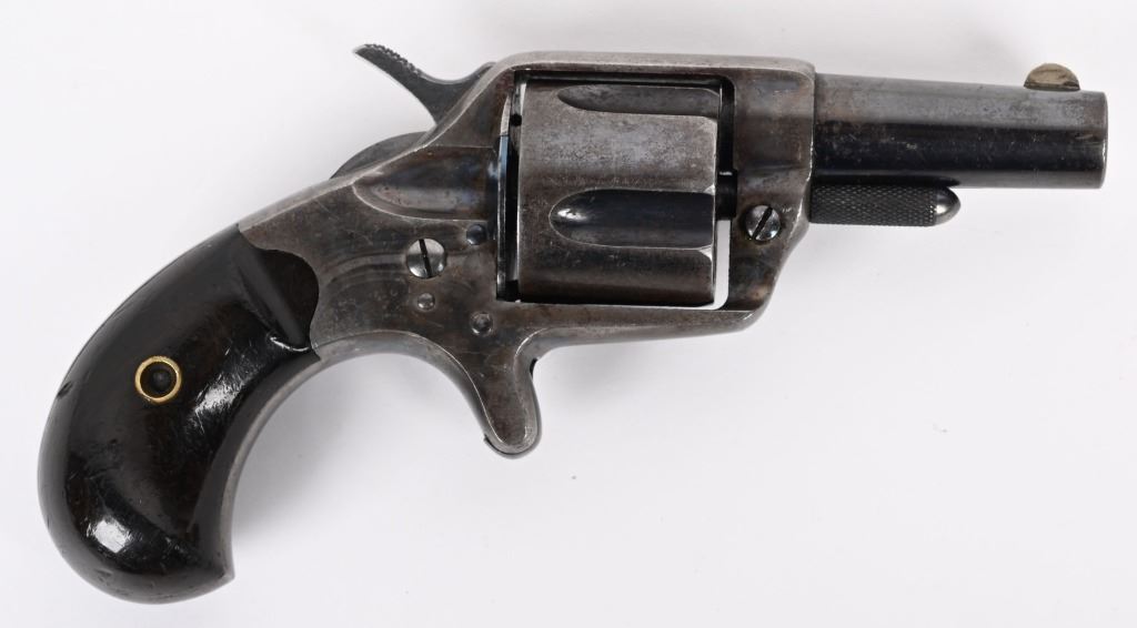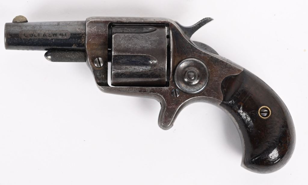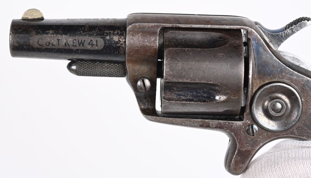 SERIAL NUMBER 6504. BARREL 2 1/4". CALIBER .41CF. MANUFACTURED 1876. Scarce blue and case color finish, five shot, single action, spur trigger, birds head grips. Etched panel reads "COLT NEW 41". CONDITION. 60-70% bright blue on barrel. Smooth blue brown patina with flashes of blue in the flutes. About 40% case color remains on frame. Etched panel is perfectly visible. Grips are excellent. Bore is excellent. Action advances perfectly, Nice grips. ANTIQUE
