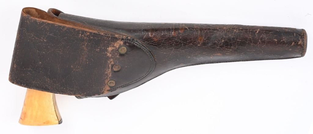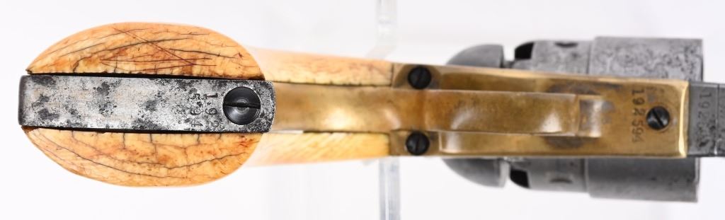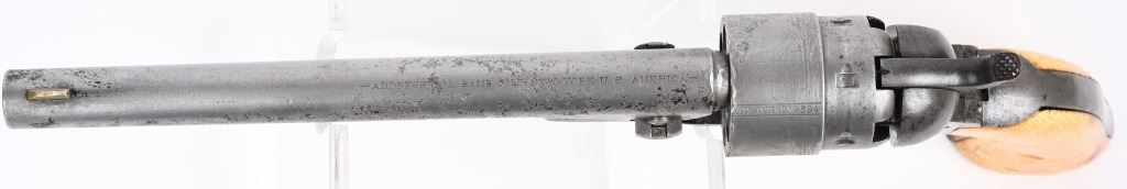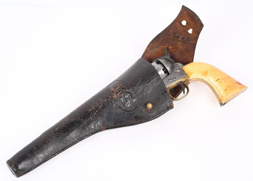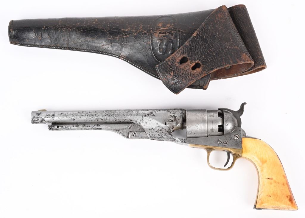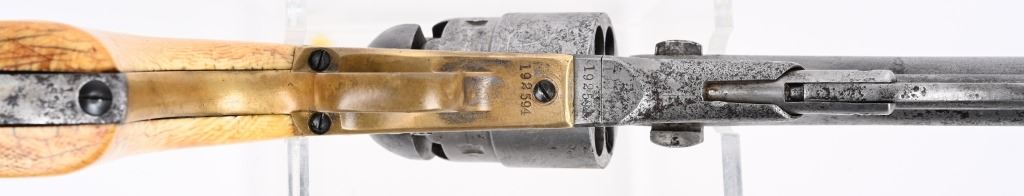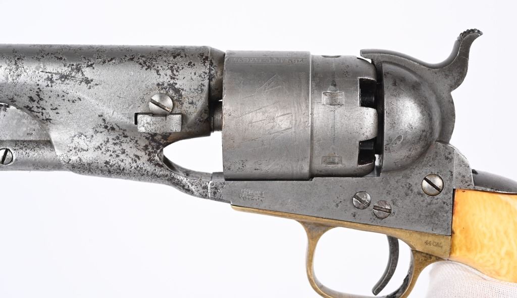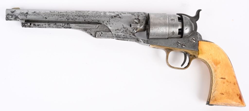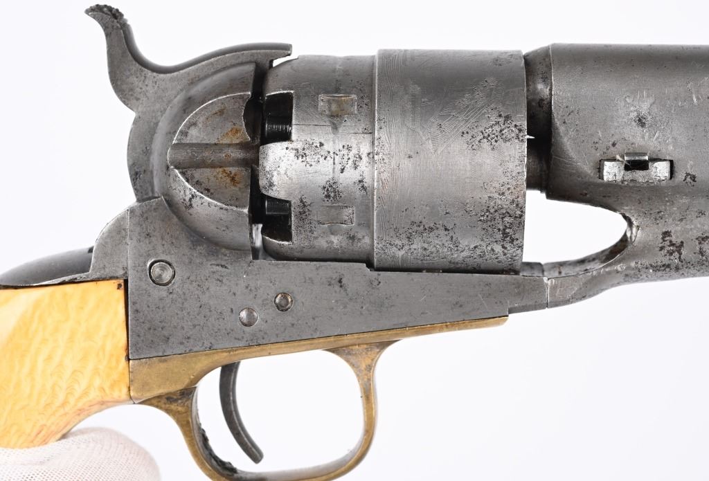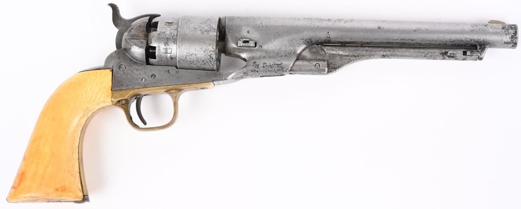 SERIAL 192594. BARREL 8". CALIBER .44. MADE IN 1871. Post war matching serial number civilian Colt made at very end of production of percussion guns. Every number but wedge matches. Grips are vintage period ivory with great aging and color. The naval cylinder scene is about 70-85%. Comes with an Indian Wars US holster. Condition. Cleaned to the white with scattered black salt & pepper textures basically centered on left side of gun. 70% visible naval scene. Action locks up tight..Strong clean bore. Grips are worth the price of admission. Antique