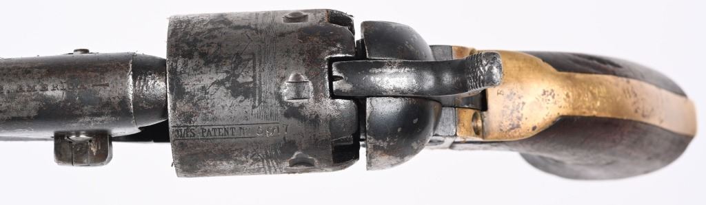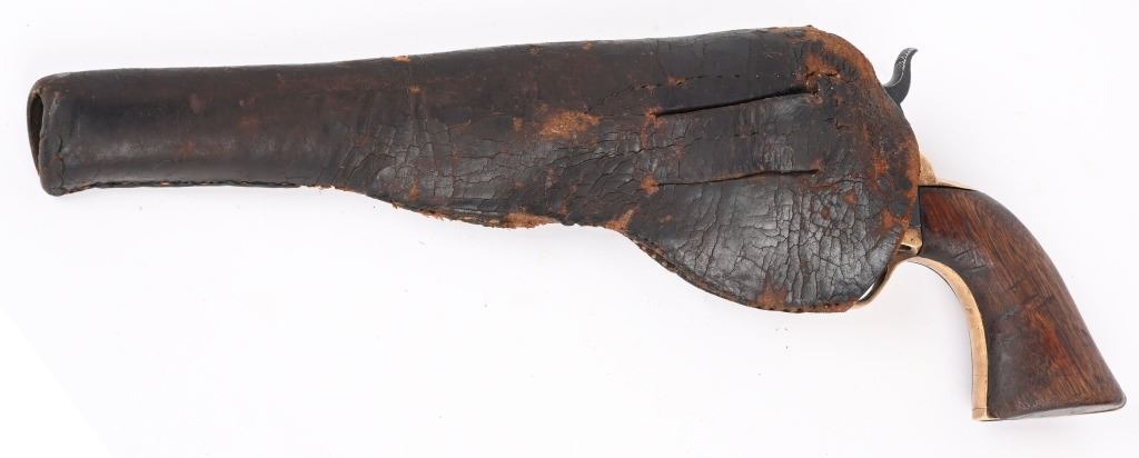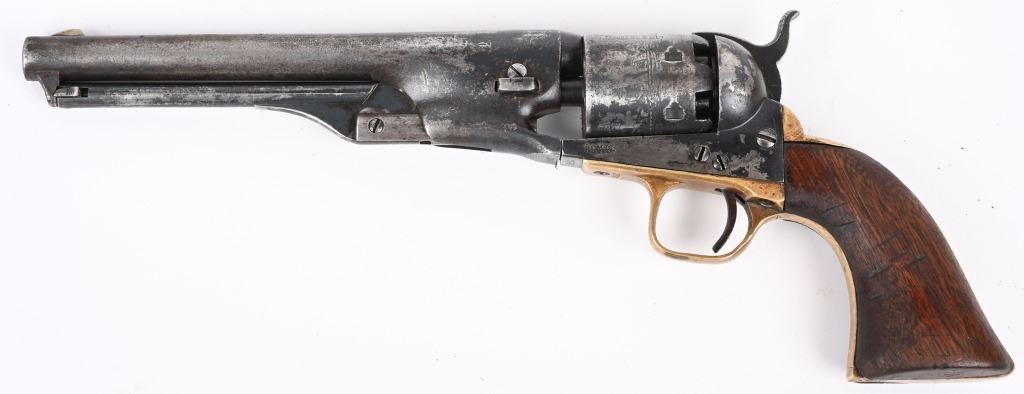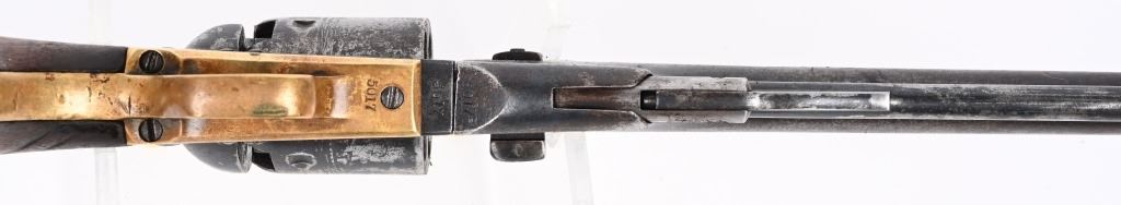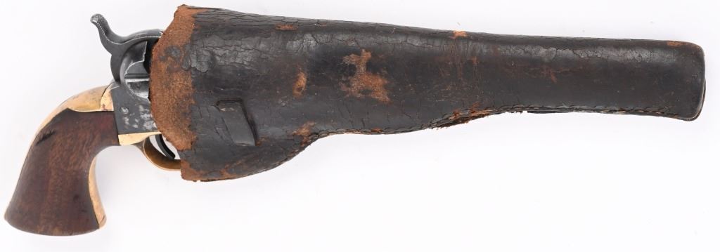 SERIAL 5017. BARREL 7.5. CALIBER .36. MADE IN 1862. Matching numbers on barrel, frame, trigger guard, back strap and cylinder. Wedge not marked. Brass straps. One piece walnut grips. Numerous martial inspection marks. Standard naval scene on cylinder. Comes with an altered flap holster of the period. Condition. Gun is basically gray patina with some wiped on protective black coating. Strong cylinder scene. Grips are very good. Excellent bore. Fine action. Antique