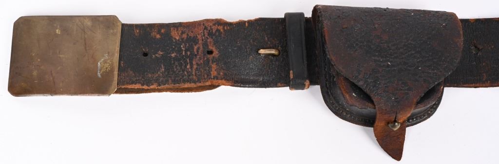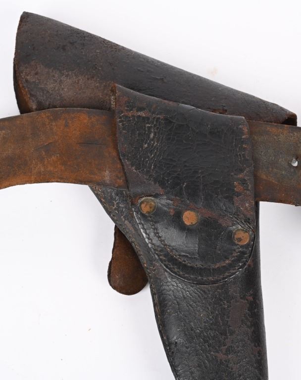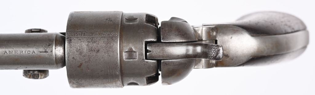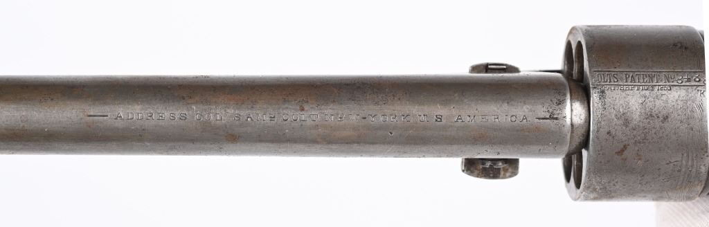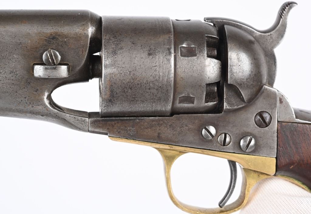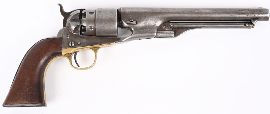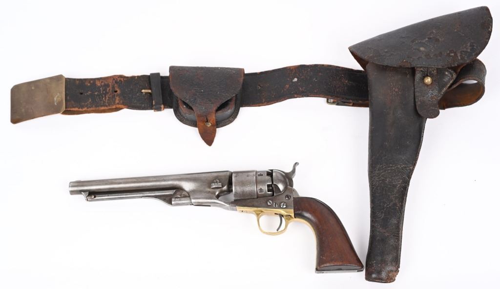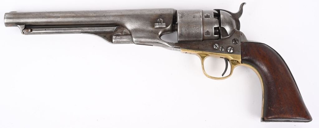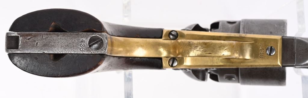 SERIAL 8438. BARREL 8". CALIBER 44. MADE IN 1861. ALL MATCHING NUMBERS INC WEDGE. Has visible cartouche on both sides of walnut grips. Steel back strap & recoil shield cut for shoulder stock. Rebated cylinder with naval scene. Brass trigger guard. Numerous inspector stamps on metal. Comes with Civil War flap holster, belt and ammo pouch. Condition. Metal is smooth gray patina with sharp legends, nice clean bore, fine action, excellent grips a bit shy. ANTIQUE
