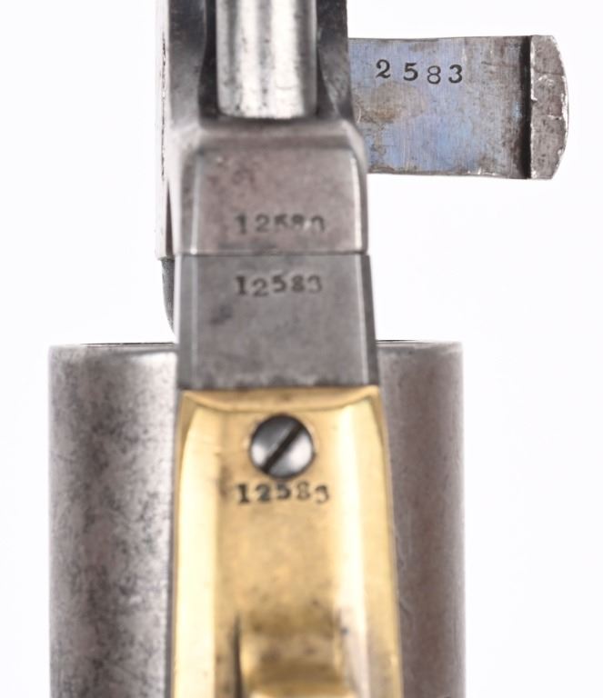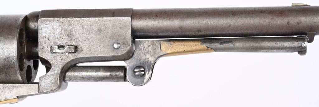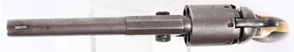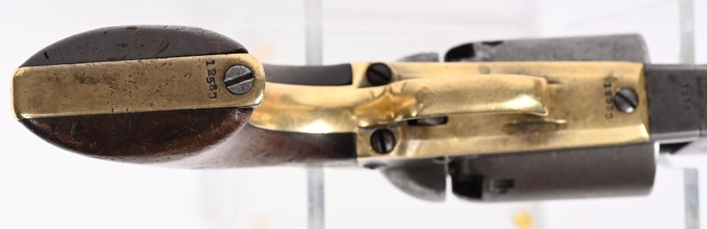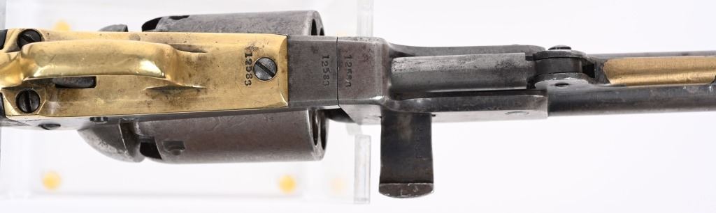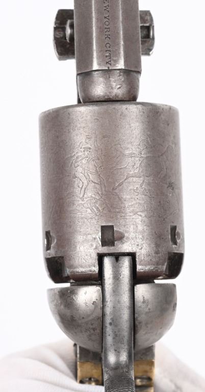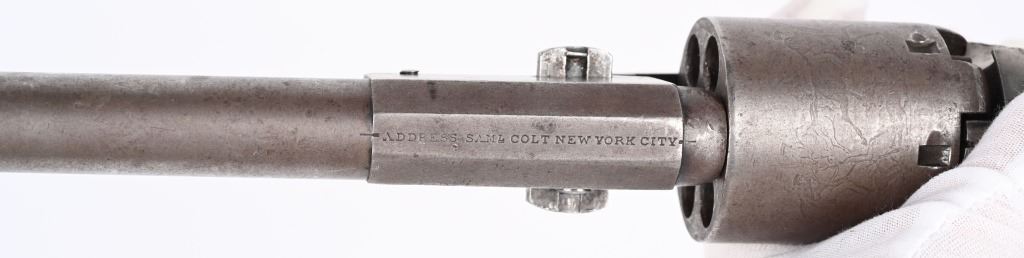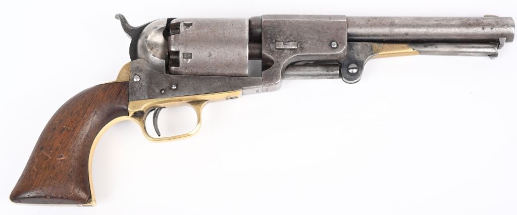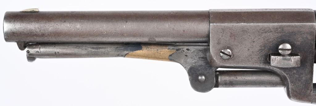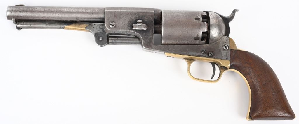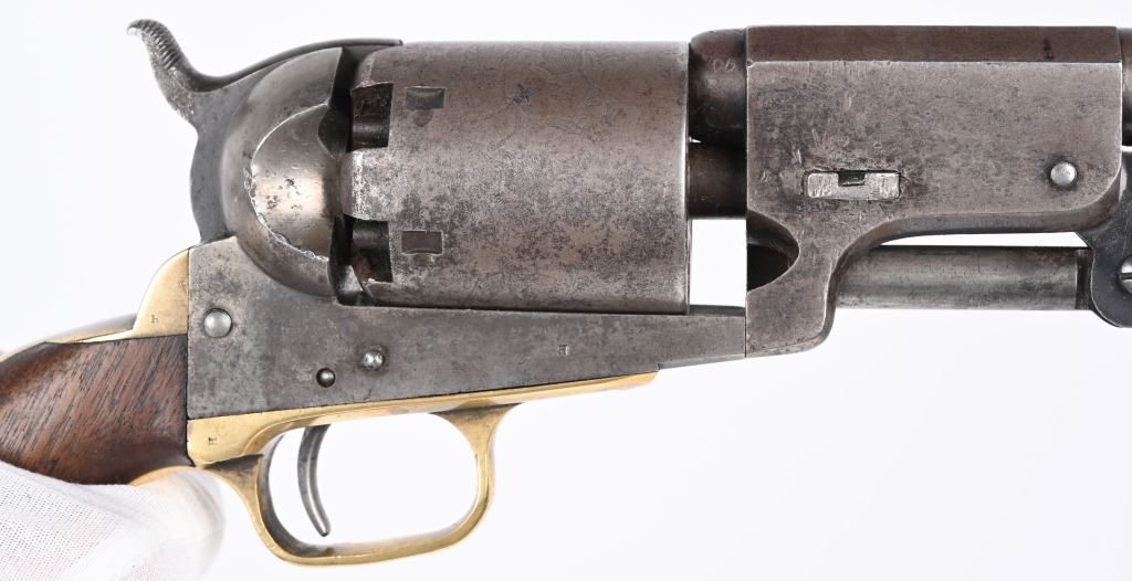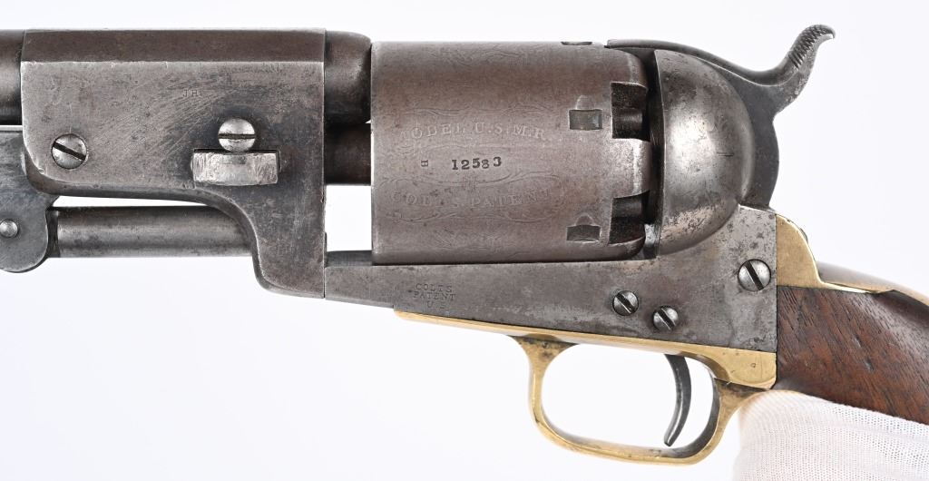 SERIAL NUMBER 12583 BARREL 7 1/2" CALIBER .44 BLACK POWDER MANUFACTURED 1853. Finished with blue and case color finishes with oil finished one piece walnut grips. Part round barrel is marked with Colt single line New York address. with Colt sub-inspector "JH" on left flat. Brilliant gain twist rifled bore and small nickel silver front blade sight. Cylinder is roll engraved with Ranger & Indian" battle scene and has rectangular cylinder slots and is marked "MODEL U.S.M.R. COLT'S PATENT" with small Colt sub-inspector "H" Frame is marked on left side with "COLTS PATENT" and small "U.S." on left side and brass round trigger guard is marked with Colt sub-inspection "H". One piece walnut grips with serial number on rear grip strap mortise. All serial numbers are matching including wedge. CONDITION. Good with revolver having toned to dove grey with traces of blue in protected areas of barrel. Loading lever has a period brazed repair. Grips are good with slight material loss at toe. Action operates properly. Cylinder scene remains visible and bore is excellent. This revolver is from the 1853 US Gov't contract of 1000 revolvers. ANTIQUE