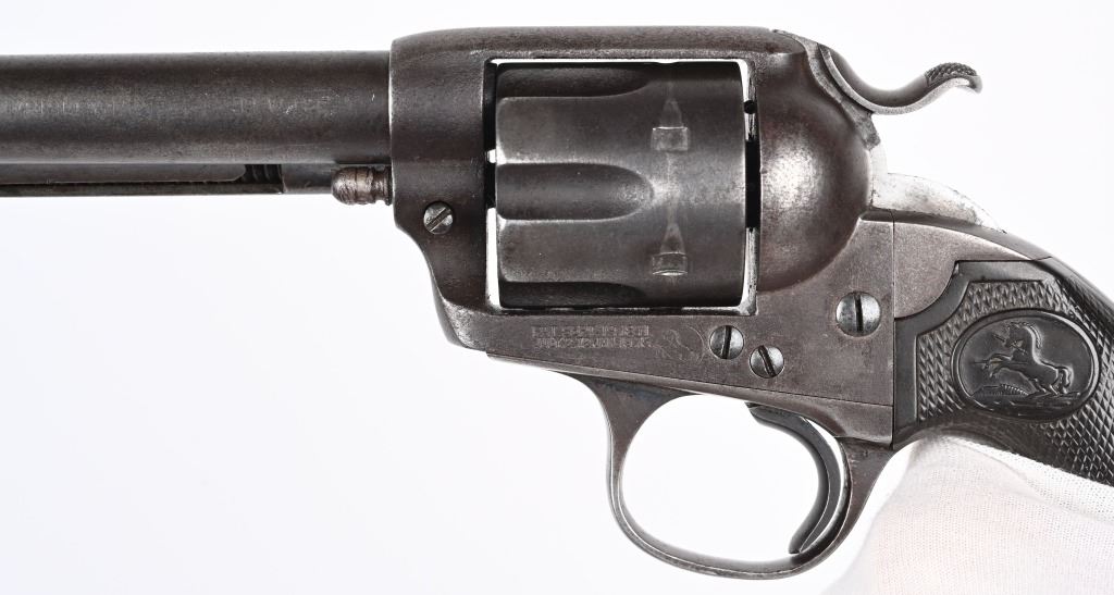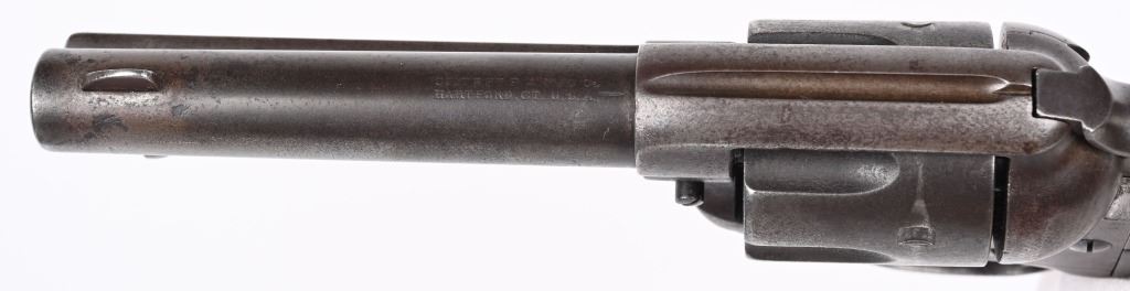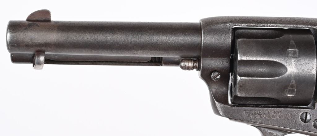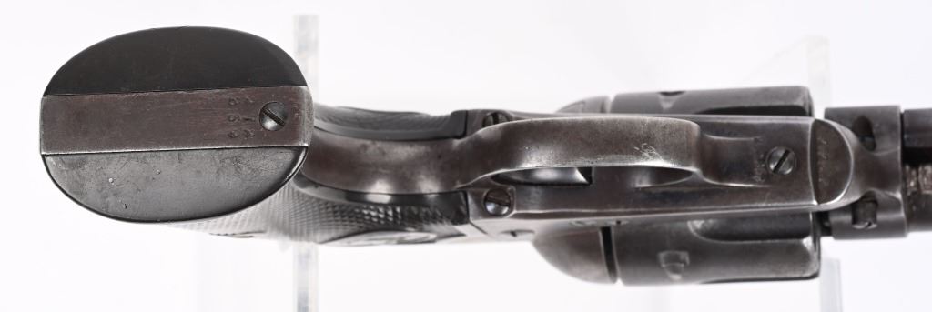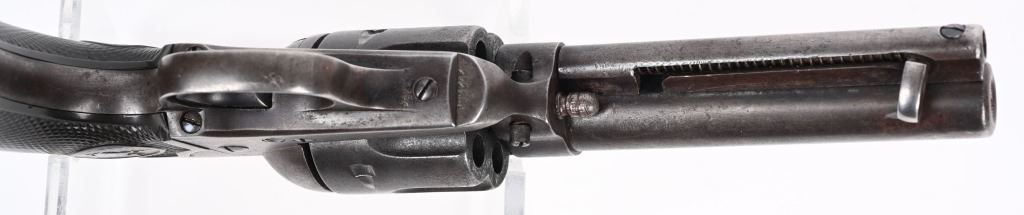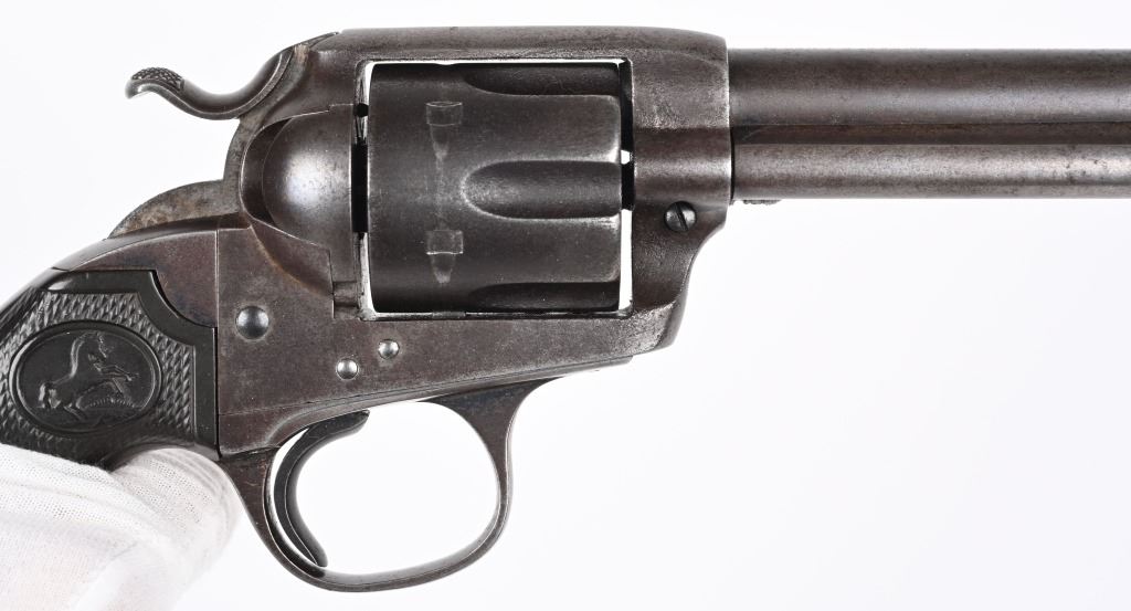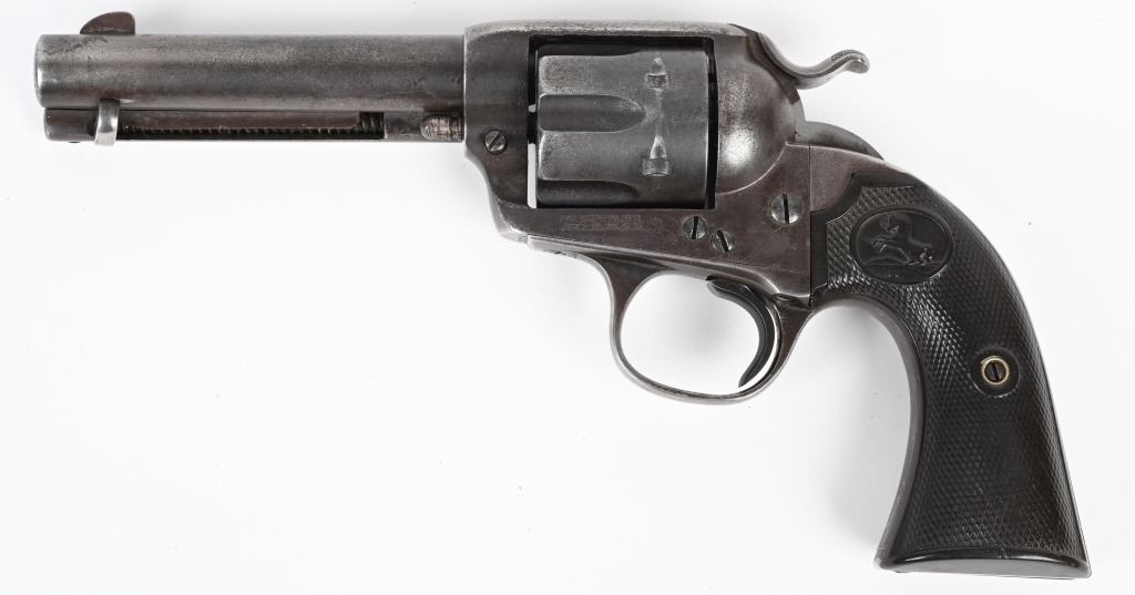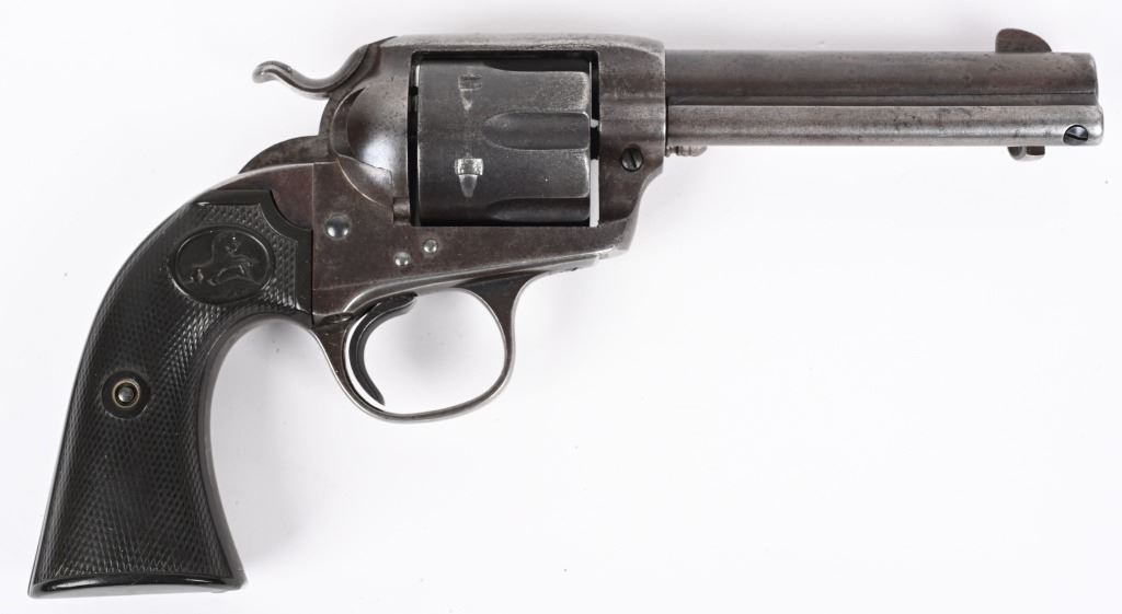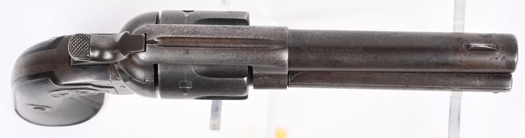 SERIAL NUMBER 272359 BARREL 4 3.4" CALIBER 32-20 W.C.F. MANUFACTURED 1905. Produced with blue and case color finishes with checkered gutta percha grips with Rampant Colt monograms. 2 line barrel address with side marked 32 W.C.F.. 2 line patent marking on left side of frame with Rampant Colt to rear. Matching serial numbers. CONDITION. Good with revolver having toned to a even chocolate patina with good strong bore with some light oxidation in grooves. Action operates properly with solid lock-up. Grips are full sized and without cracks. C&R