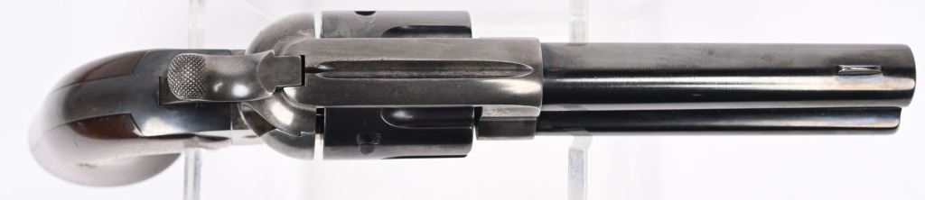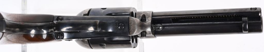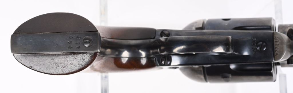 SERIAL NUMBER 311684 BARREL 4 3/4" CALIBER 32-20 W.C.F. MANUFACTURED 1909. Produced with blue and case color finishes and fitted with custom smooth walnut grips with brass escutcheons. 2 line barrel address. Left side of frame has 2 line patent marking with Rampant Colt. Matching numbers. CONDITION, Very fine as custom finished with deft case color frame and blue barrel, cylinder and grips straps. Action operates properly with solid lock-up. C&R