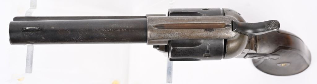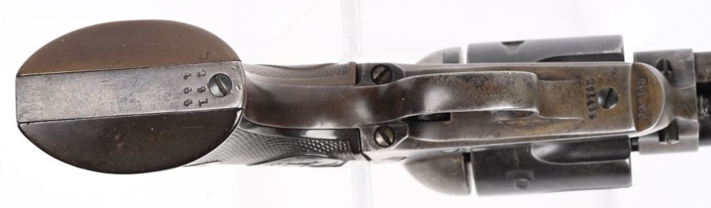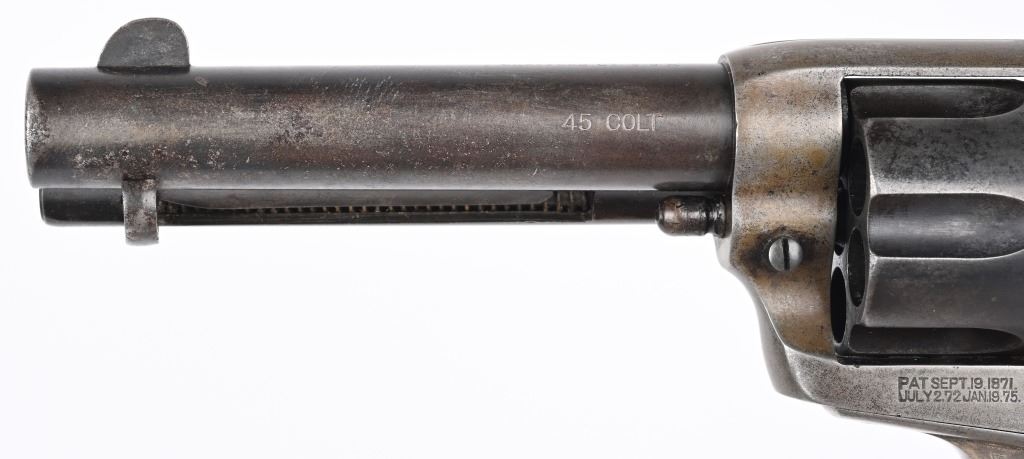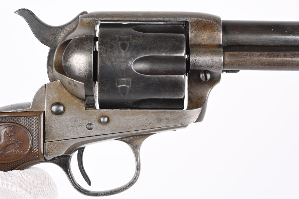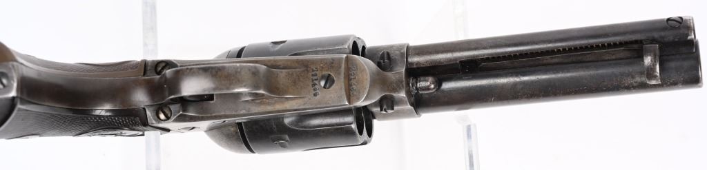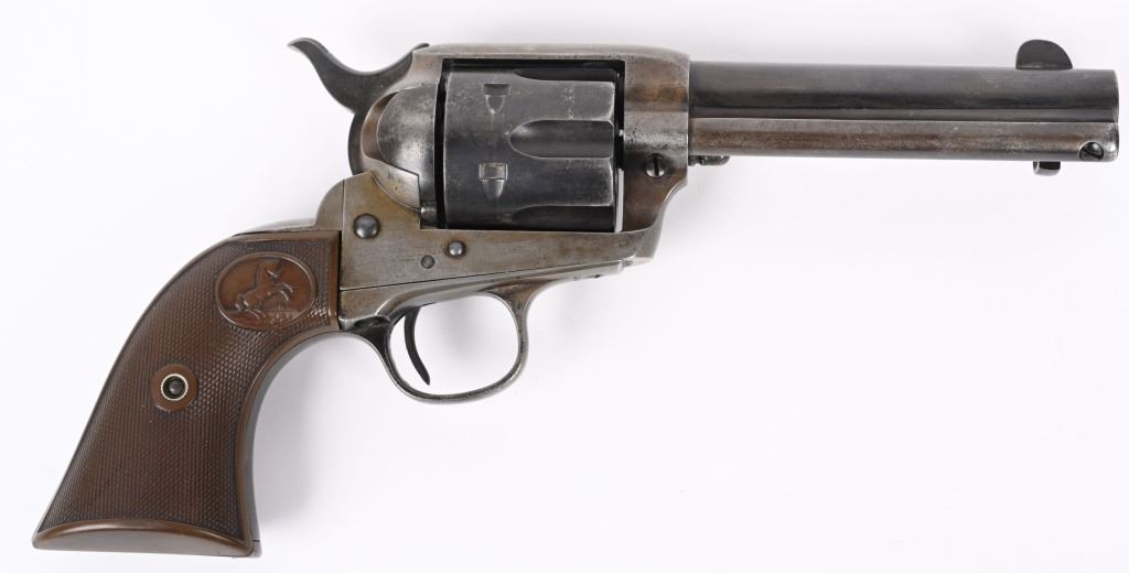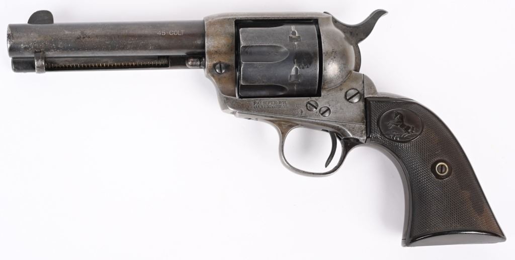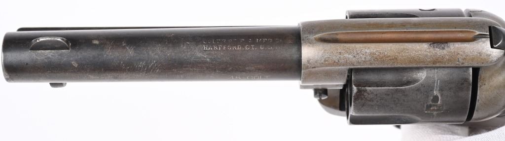 SERIAL NUMBER 291466 BARREL 4 3/4" CALIBER 45 COLT MANUFACTURED 1907. Produced with blue and case color finishes and fitted with checkered gutta percha grips with Rampant Colt monograms. 2 line barrel address with 2 line patent markings on left side of frame with rampant Colt to rear. Matching serial numbers. CONDITION. Good with blue finish having faded to a mottled brown. Case colors are a dove grey . Action operates properly with solid lock-up. Bore is strong with oxidation in grooves. Grips are full sized and without cracks. C&R