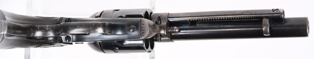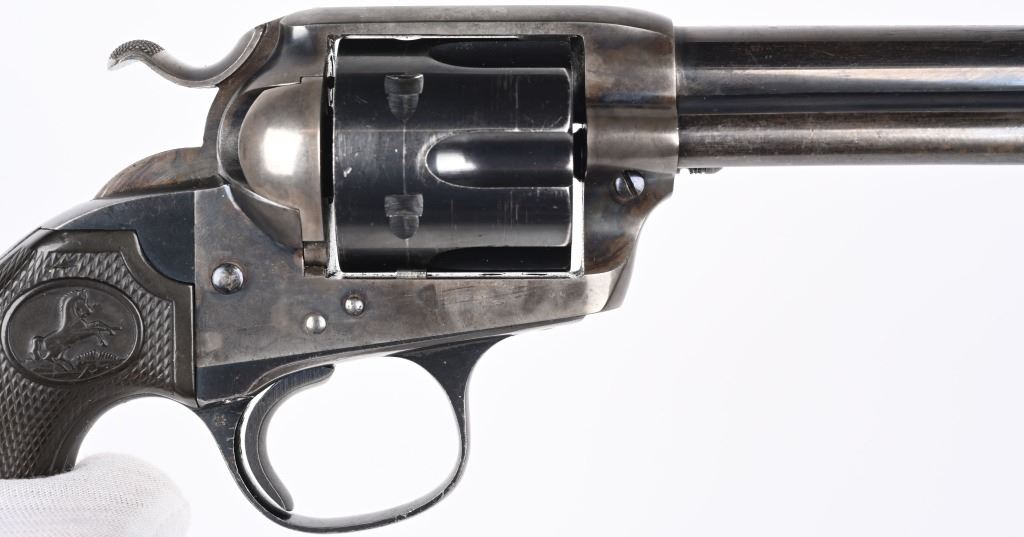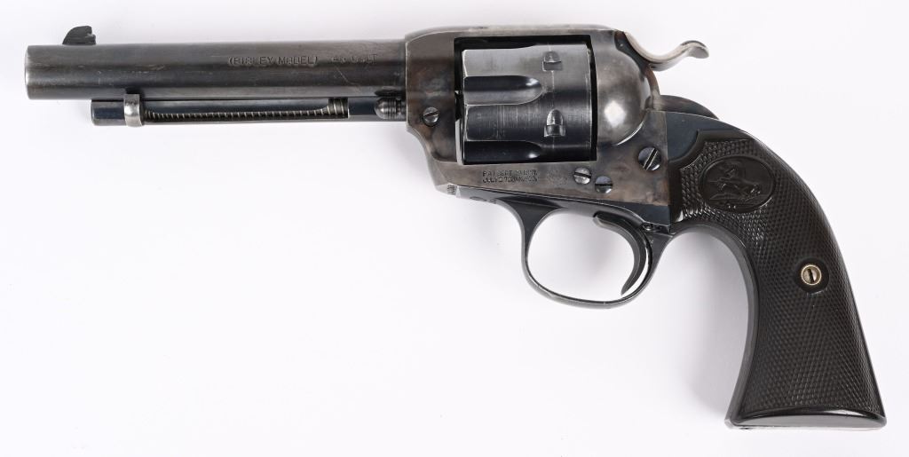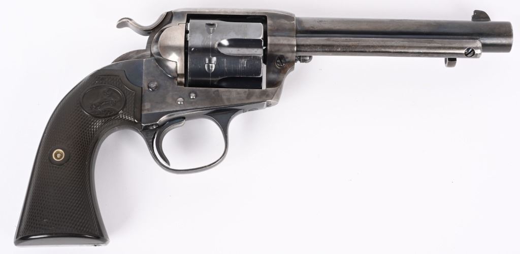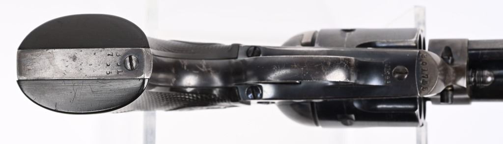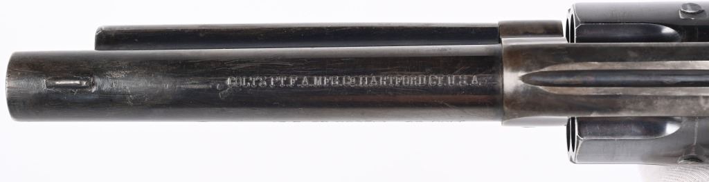SERIAL NUMBER 301755 BARREL 5 1/2" CALIBER 45 COLT MANUFACTURED 1907. Blue and case color finishes with checkered gutta percha grips with rampant Colt monograms. Matching numbers with single line barrel address and 2 line patent markings with Rampant Colt to rear. CONDITION, Very good with excellent bore and revolver retains over 85% case colors on frame 95% blue on cylinder and 90% blue finish on barrel and ejector rod housing. Front sight modified and action operates properly. C&R