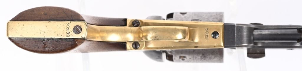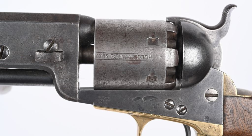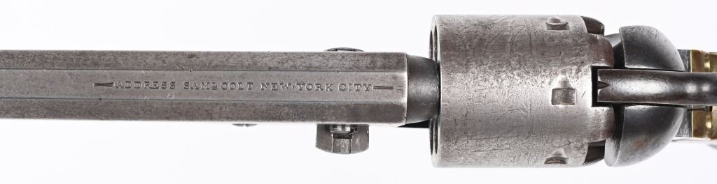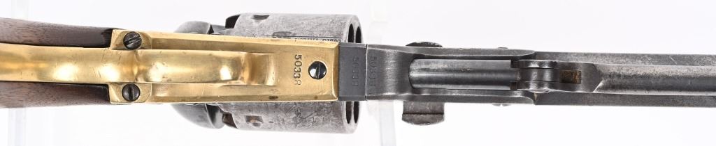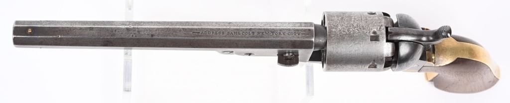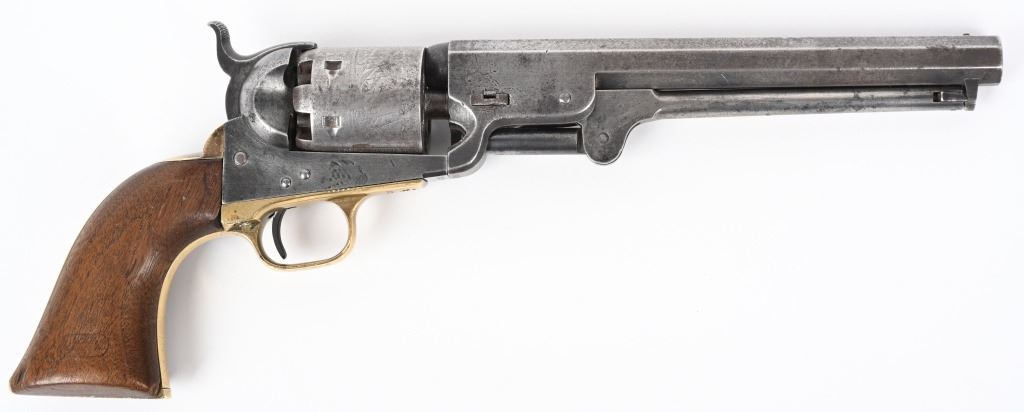 SERIAL NUMBER 50338 BARREL 7 1/2" CALIBER .36 BLACK POWDER MANUFACTURED 1856. Produced by Colt with octagon barrel with New York address. Brass trigger guard and back strap and non fluted cylinder with Ormsby Naval engagement cylinder scene. US Martial inspections on frame and both sides of grips. Matching serial numbers. CONDITION. Good with revolver having toned to a mottled dove grey mixed with patina. Action operates properly. Brass has turned a mellow mustard patina. Grips are good with small chip at toe. Gain twist bore is good. ANTIQUE