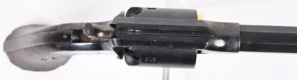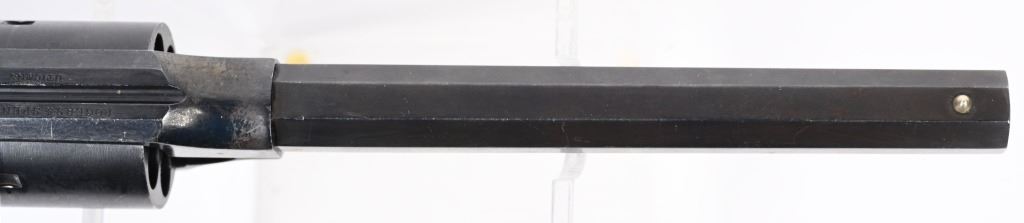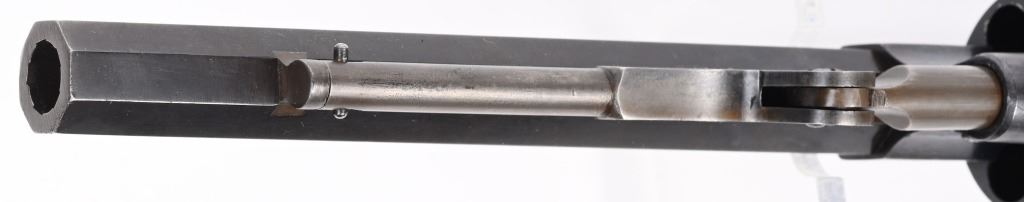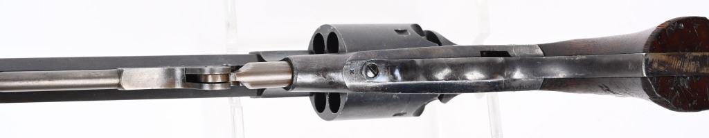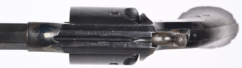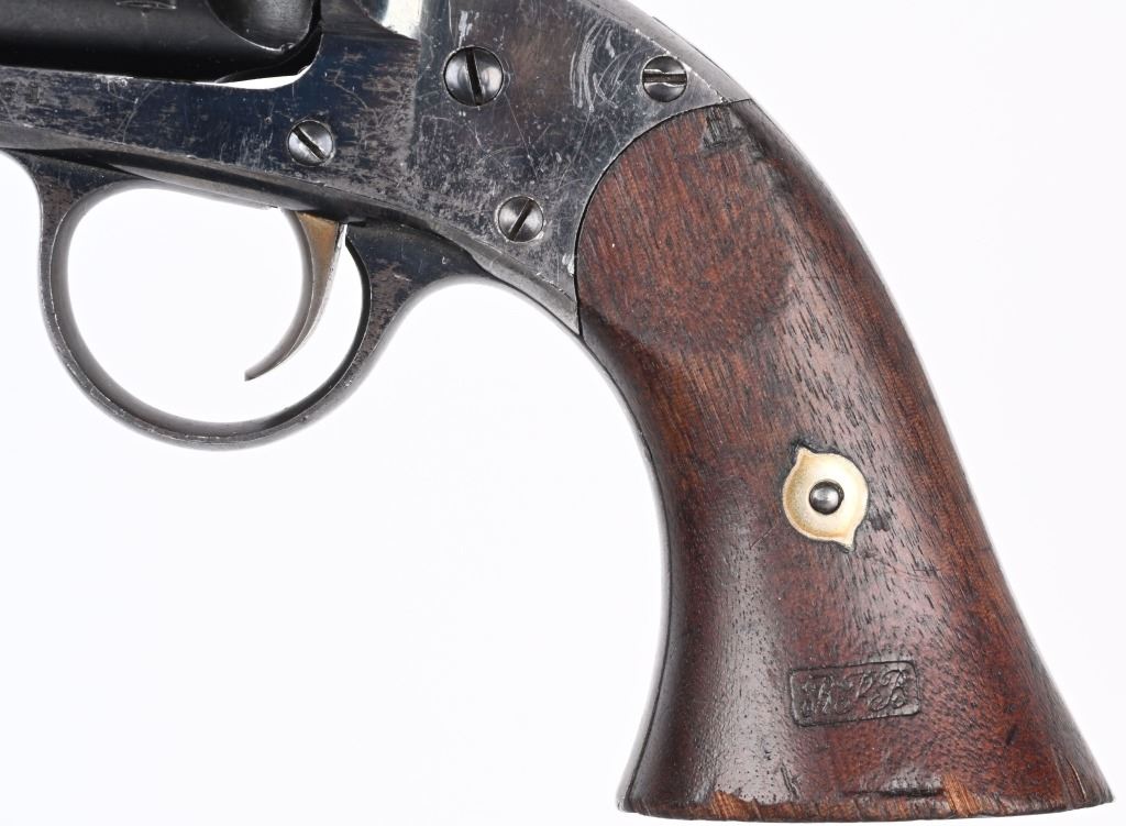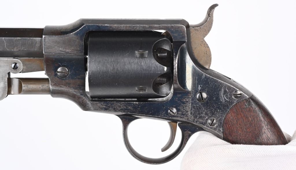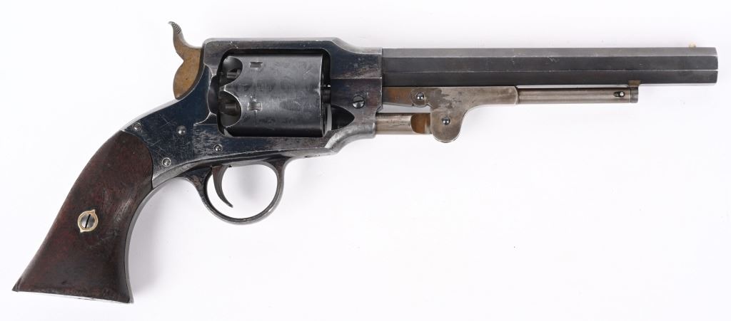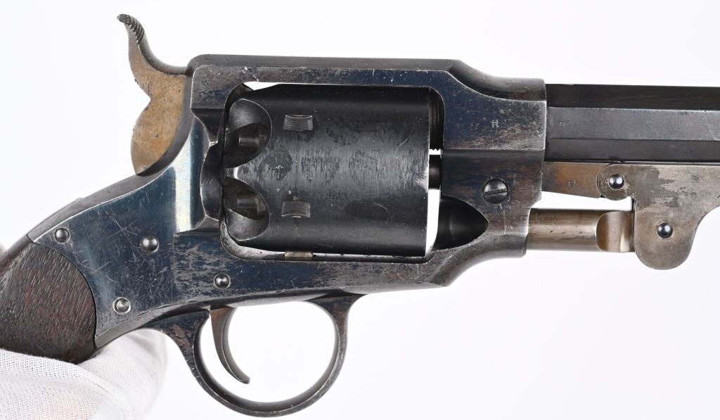SERIAL NUMBER 51 BARREL 7 1/2" CALIBER 44 BLACK POWDER MANUFACTURED 1865. Produced outside of Ithaca New York for the United States Gov't in 1865. Total production was 5000 revolvers with blue finish , octagon barrel case colored hammer , loading lever and trigger. 2 piece oil finished walnut grips. Marked on top strap of frame "ROGERS & SPENCER UTICA N.Y." Matching serial numbers found on most primary parts including grips. Martial inspections on most primary parts including grips. CONDITION, Very fine with revolver retaining over 95% blue finish with case colors toning to plum with age. Grips are very fine and action operates properly/ ANTIQUE