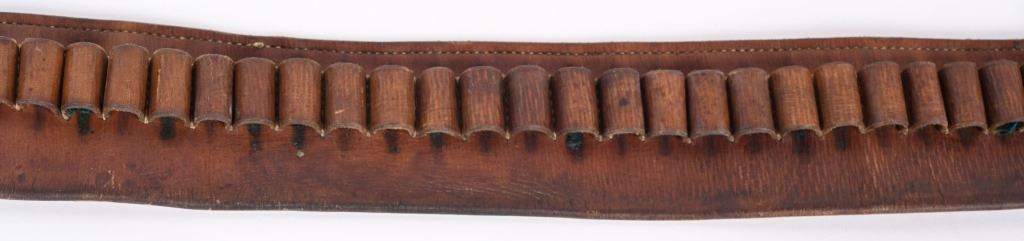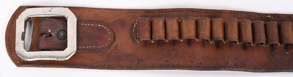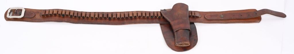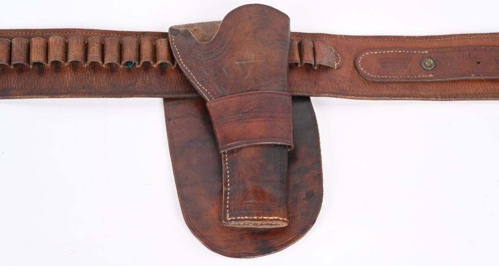 The Moran brothers built top of the line leather beginning in 1879 through 1894 only in Miles City Montana. This very high condition holster is for a 4 3/4 or 5 1/2" Colt SAA revolvers. Holster is border tooled single loop with deep MORAN BROS MILES CITY MT Territory stamp The flap is extremely unusual in its over size. The cartridge money belt features the California clip point buckle and wears the same maker cartouche. Loops are 44/45 caliber. An extremely fine and rare territory holster from a top maker and dating to the 1880's. Belt measures 38" from buckle post to middle hole in billet