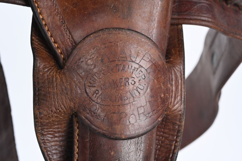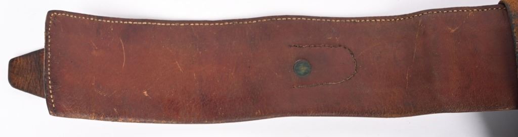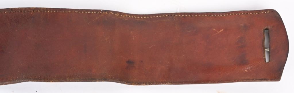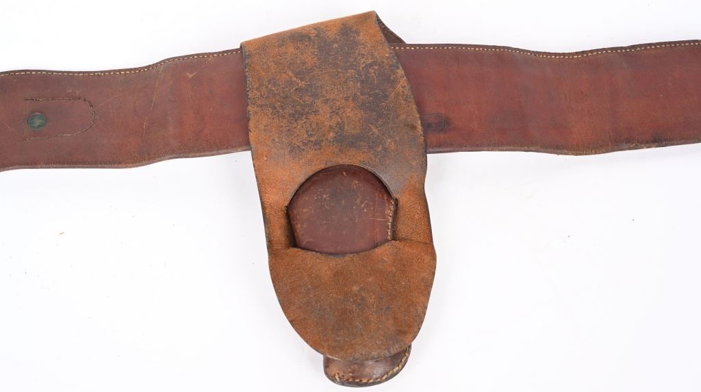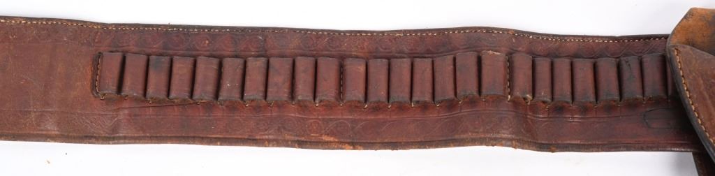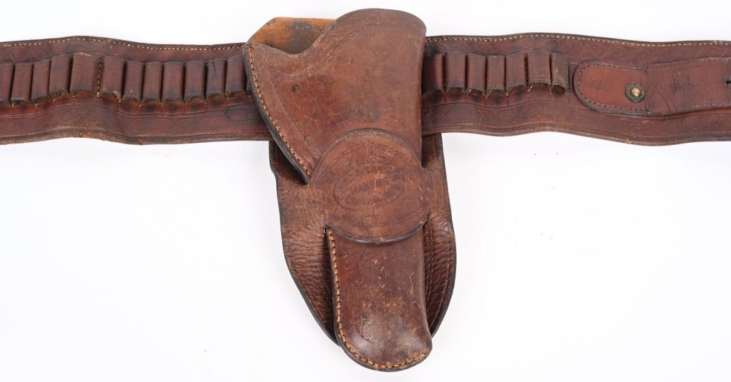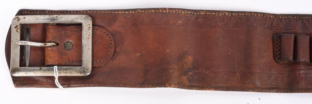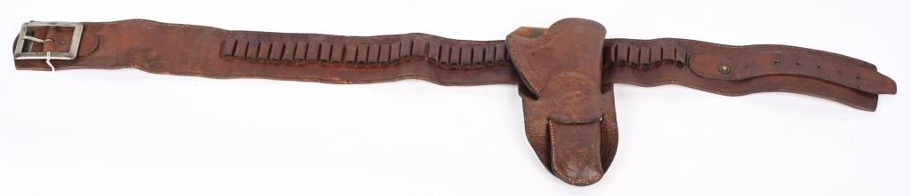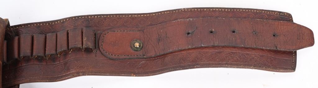 Well known and talented maker from 1920-30 operating out of Rawlins Wy. This top of the line holster is a single loop with large decorative center that is stamped KNOW & TANNER RAWLINGS WYO. The cartridge money belt is border tooled and made for the 41 Colt round so this rig would be perfect for a Wyoming shipped 1920's 4 3/ or 5 1/2" SAA. Overall nice condition but a previous owner has lightly etched his name and Rock Port Mo on loop Belt measures 35" from buckle post to middle hole in billet.