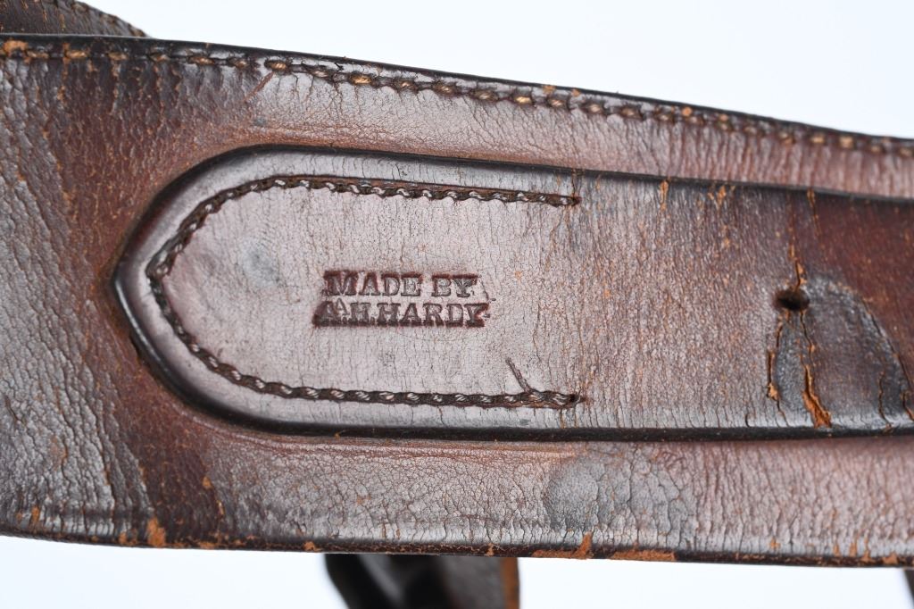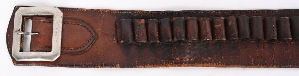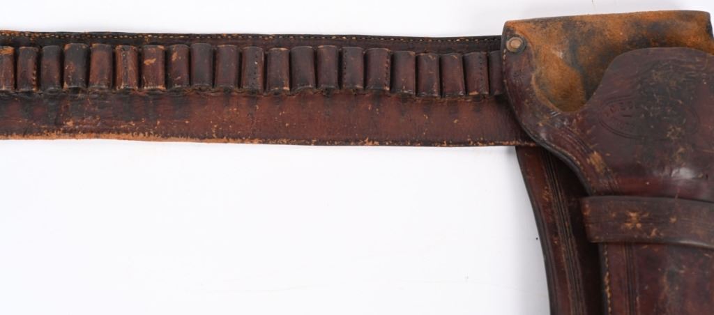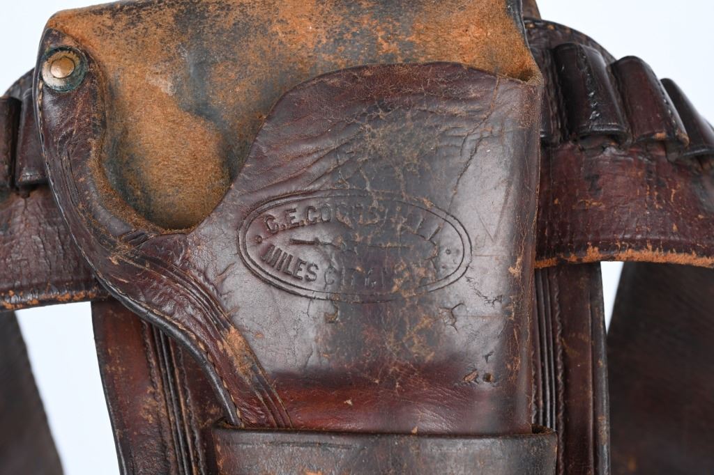 Charles Coggshall opened his ship in Miles City in 1895 before going into partnership with Al Furstnow in 1897 . The high quality saddle leather holster is a double loop, full skirt, border tooled with large maker stamp C.E.COGGSHALL MILES CITY MONT. The toe has a period brass rivet reinforcement similar to a Jock Strap style. The cartridge money belt is for a .41 caliber. Holster is for a 4 3/4 Colt SAA. California clip point belt buckle. Excellent condition overall. Trigger guard opened up a bit for an 1878 Colt as well. Belt is stamped MADE BY H. HARDY. Hardy made leather work in Denver beginning in 1910. Belt measures 37" from buckle post to middle hole in billet