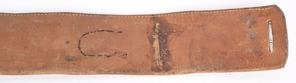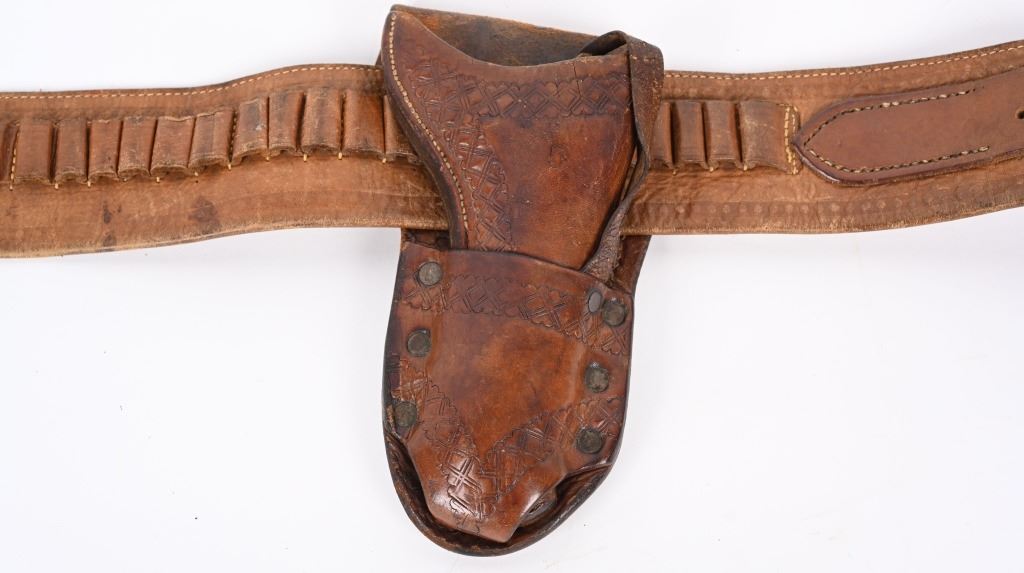 Nordhaus of Demming NM is credited with designing the so called "Jock Strap" holster with its reinforced toe plate that was later updated to the modern Jock Strap holsters made popular after the turn of the century. The large stamp number 5 on body was a catalog number 5 Nordhaus model and stamp but maker not found. The saddle leather top of the line holster is border tooled, has brass rivets. The unmarked cartridge money belt is also border tooled and in .41 caliber. Holster has early hammer tie down. Excellent condition with altered billet Belt measures 42" from buckle post to middle hole in billet.