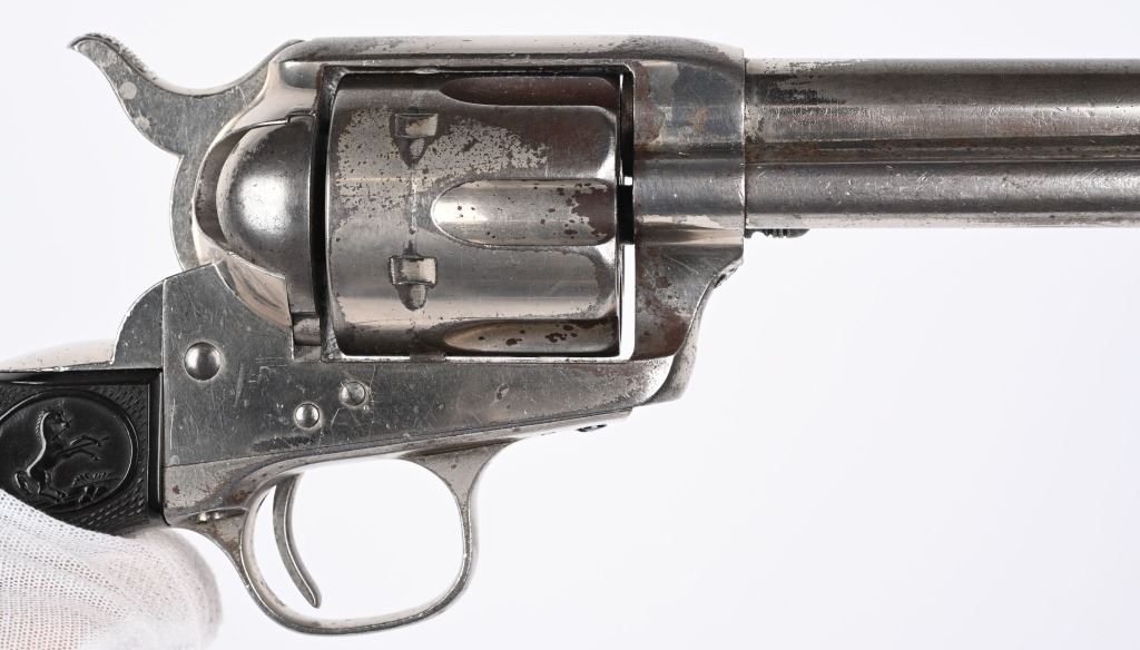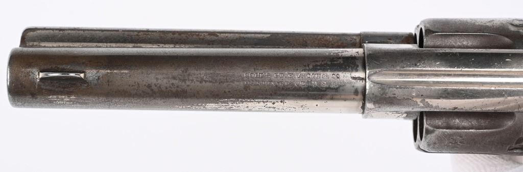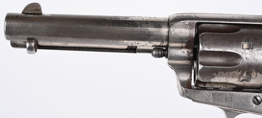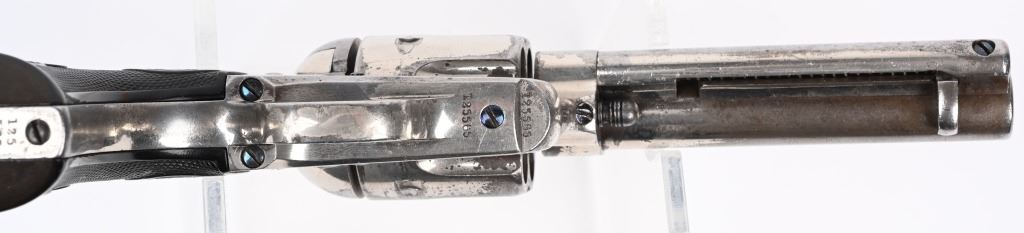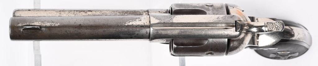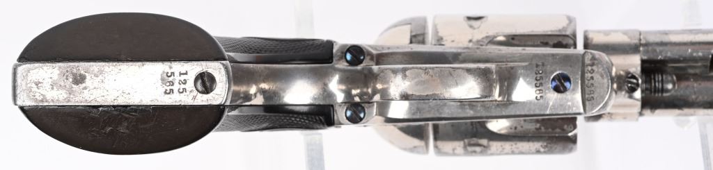SERIAL 125565. BARREL 4 3/4". CALIBER 44-40. Factory letter states this gun was shipped on June 13th, 1888 to E.C.Meacham Arms Co. St. Louis Mo, letters as 4 3/4 nickel with rubber grips. This was the last year for the etched panel barrels. Very few etched panels are seen with this barrel length. Other features are the blue screws and the gutta percha eagle grips. Gun has all matching serial numbers. Condition. Fine overall. The etched panel is entirely visible and partially readable. Retains at least 75% of the nickel finish and generous amounts of blue on screws. The grips fit tight and are in excellent condition. The bore is clean and the action is smooth as silk. A great condition classic Frontier Six Shooter with rare short barrel. ANTIQUE