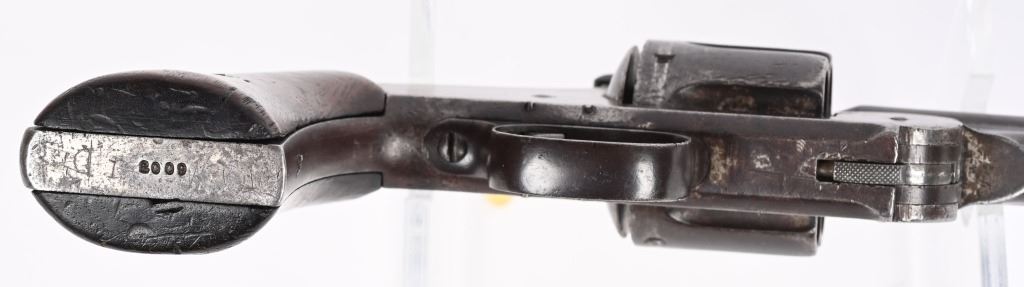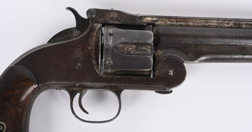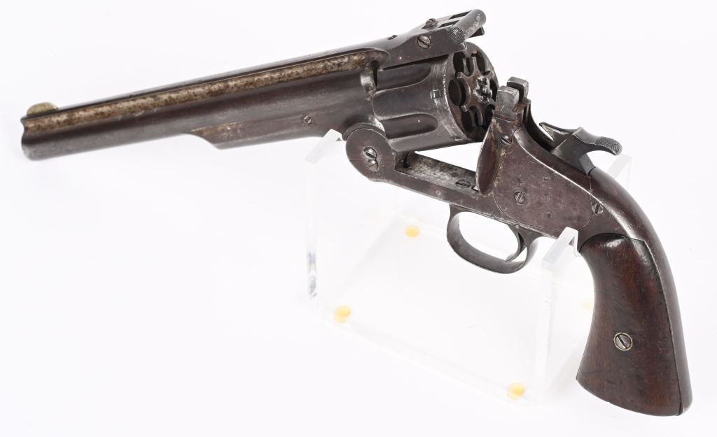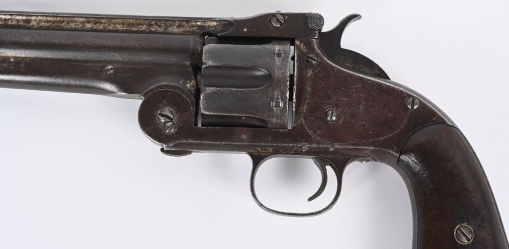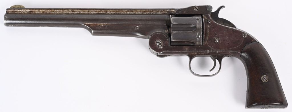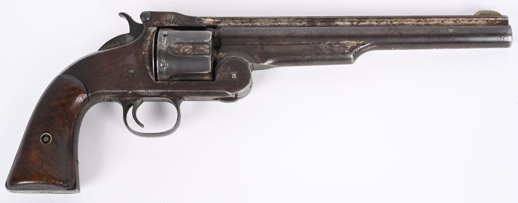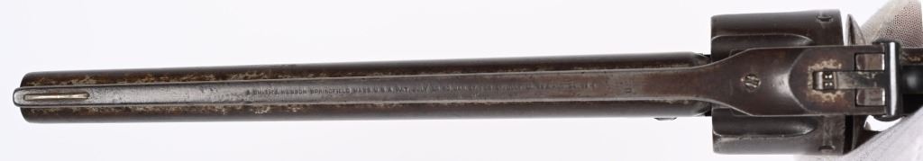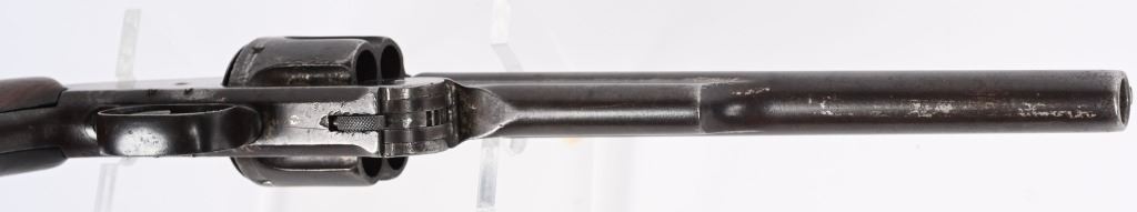SERIAL 2009. BARREL 8". CALIBER .44 AMERICAN . ISSUED MARCH 1871. Serial number 2009 is listed in list of US guns (ALSO SPRINGFIELD RESEARCH) as is number 2008 that was owned by Texas Jack Omohundro who served as a civilian scout for the US Army during the American Indian Wars. You will find the small A (AINSWORTH) inspector stamp on right side of barrel (light) , cylinder and on left side of frame. The rib is stamped US. The OWA inspector stamp on left grip is not visible but the right grip is stamped inside 2009 along with some period scratched owners name. The butt also has some indiscernible name scratched in. Grips are smooth walnut. The United States government ordered 1000 of these revolvers with only 200 being factory full nickel plated as is this example. This is considered the Walker of cartridge 19th century US issue handguns. Condition. Revolver retains about 15% original nickel, mostly in hidden areas. Grips are excellent. Rifling is strong with some abrasion. Cylinder indexes correctly and locks up fine. An extremely crisp example of one of the rarest of all 19th century US issue revolvers. Ex Joe Poyer collection. Antique.