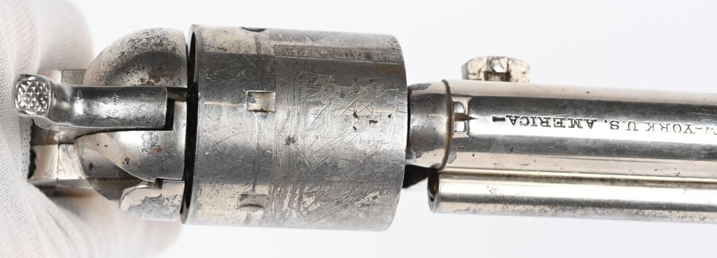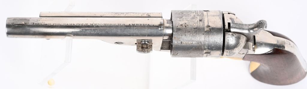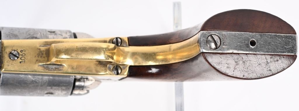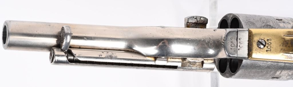 SERIAL 1063. BARREL 5 1/4". CALIBER .44CF. MADE 1872. "the most “updated” .44-cal. revolver in the Colt Patent Fire Arms stables - formed the basis for an entirely new cartridge revolver that didn’t rely on any previous Colt parts." Colt’s first revolver specifically manufactured to fire self-contained metallic cartridges. It was roll engraved with the same W.L. Ormsby 1843 Naval scene previously used on the 1851 Navy and 1860 Army cylinders. This gun features the elongated Model 1860 style walnut grip. Only 7000 were made and very few in center fire as most were chambered for the .44 Henry round This revolver features a six shot, single action with brass trigger guard, Naval scene on cylinder. Nickel plated with a shortened barrel. Most of these early Colt's have been plated. All matching numbers except cylinder which is quite common . Trigger guard is brass and has been cleaned. This gun was widely used on the Mexican border and few have remained in high condition. They are the iconic predecessor to the Colt SAA. Frame stamped Colt's patent. Barrel has one line address, Grips are one piece walnut. Classic old west gun in high condition. Condition. Retains at least 90% nickel with sharp legends Naval scene is strong and complete. Bore strong. Stocks are excellent. Indexes and locks up correctly. ANTIQUE