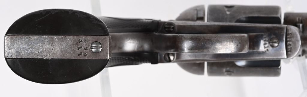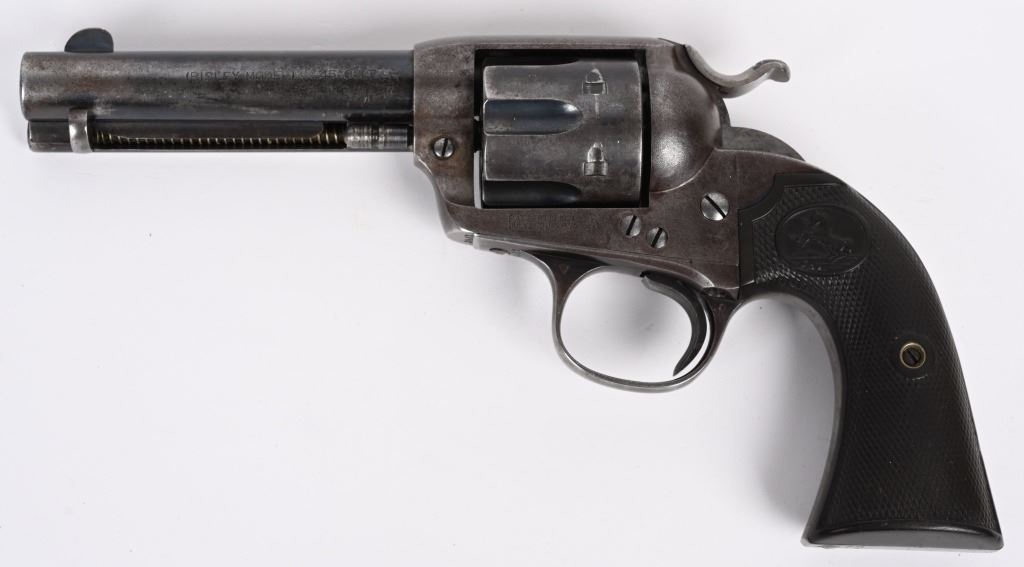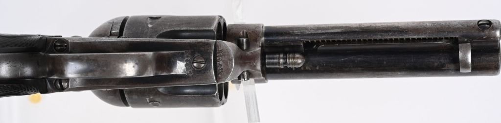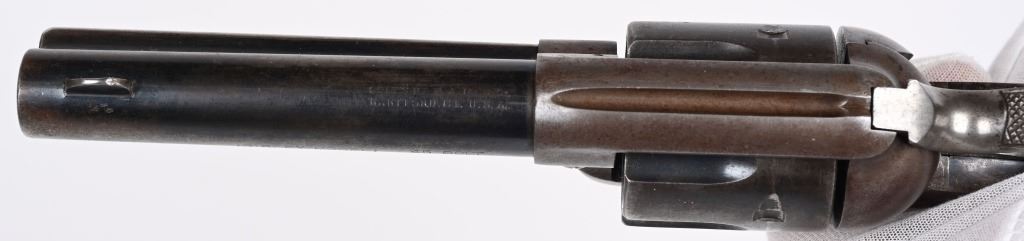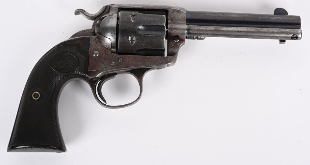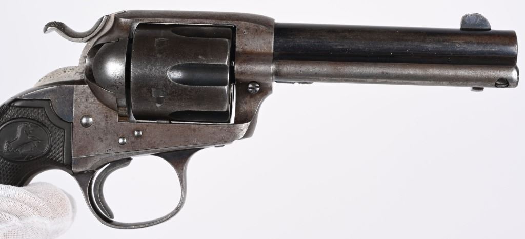 SERIAL NUMBER: 296417. BARREL: 4-3/4". CALIBER: .45 COLT. MANUFACTURED: 1907. "(BISLEY MODEL)" as marked on the barrel. Company address is marked in two lines on top. Patent dates marked on the left side of the frame, in front of a circled Rampant Colt. "VP" proof on the left side of the trigger guard. Matching serials on the butt, frame and trigger guard. Blade front sight and v-notch frame rear. Original blued/case colored finishes. Checkered brown hard rubber grips. CONDITION: Metal is good overall, with traces of blue still visible on the barrel and cylinder. Other areas have formed a solid brown patina. Grips have wear to the checkering. Bore is shiny with strong rifling. Tight hammer and cylinder. C&R