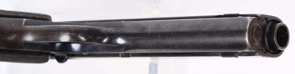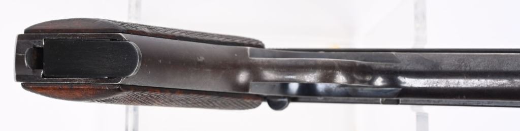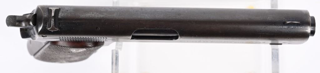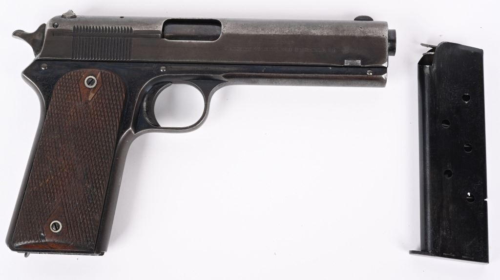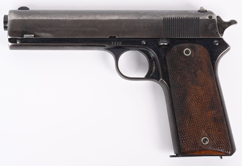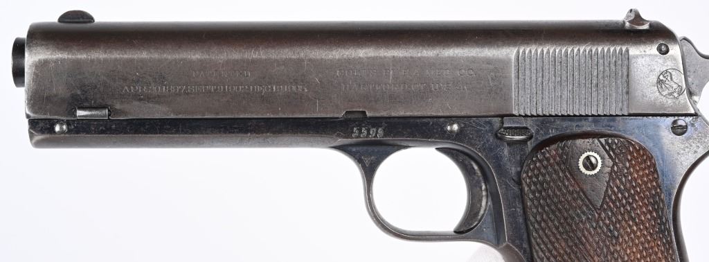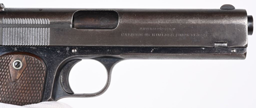 SERIAL NUMBER: 5595. BARREL: 5". CALIBER: .45 ACP. MANUFACTURED: 1911. Pivotal in the development of the M1911 semi automatic pistol. Standard markings on both sides of the slide. Circled, rampant Colt pony on the rear left side of the slide. "VP" proof on the left side of the trigger guard. Half moon front sight and u-notch rear. Original blued finish. Original diamond checkered wood grips. Blued steel magazine is later production. CONDITION: Metal is good overall, with general wear and brown patina forming in areas. Fire blue still visible on the trigger. Grips have wear to the checkering, with minor scratches and handling marks. Right grip has an "X" in the center. Bore is heavily frosted with light pitting. Fair rifling. Mechanically fine. Magazine is very good. C&R