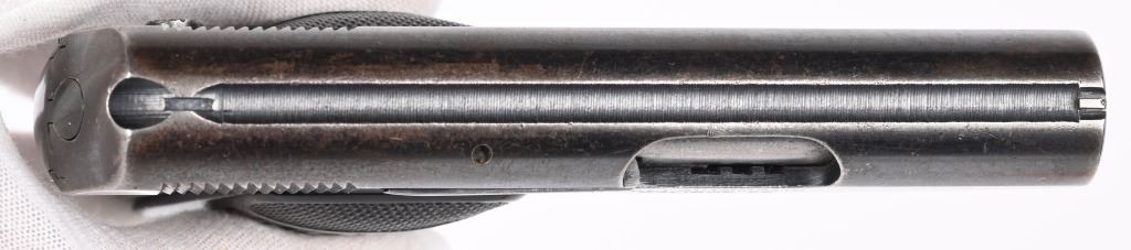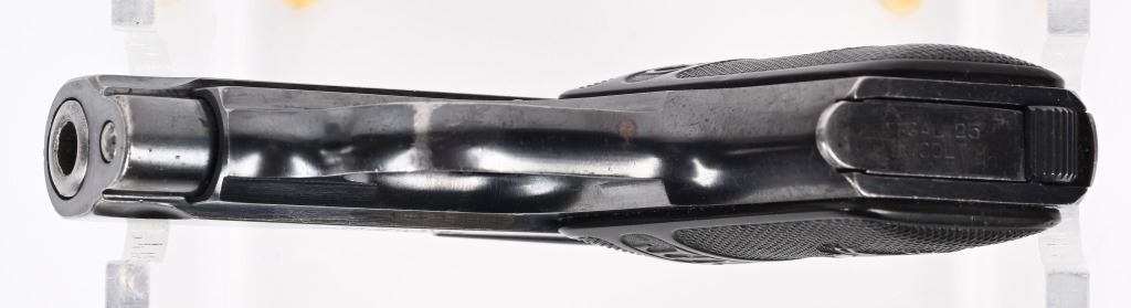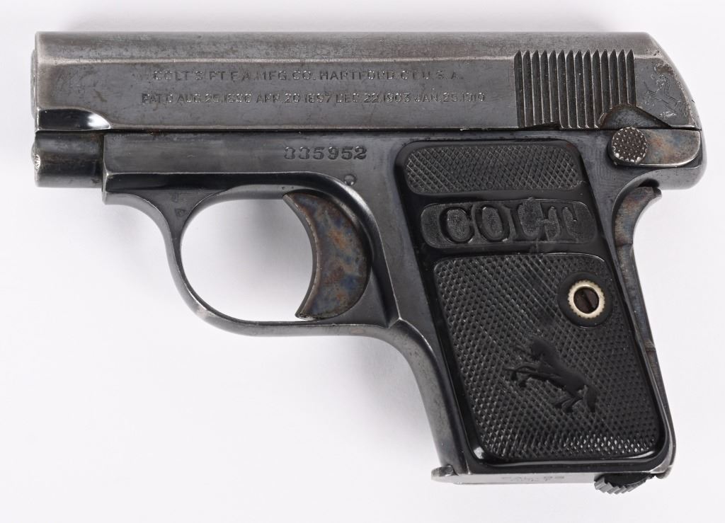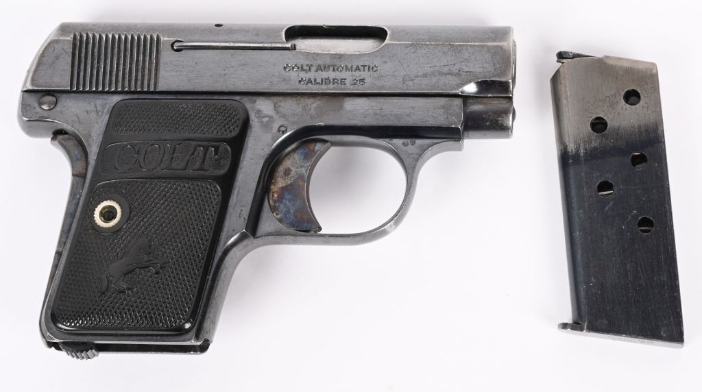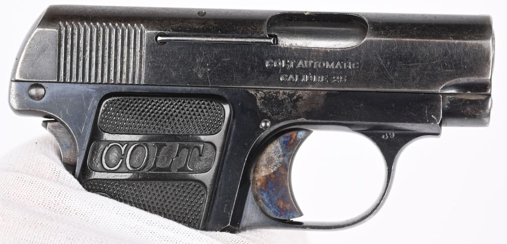 SERIAL NUMBER: 335952. BARREL: 2". CALIBER: .25 ACP. MANUFACTURED: 1923. Standard markings on both sides of the slide. Typical rampant Colt pony on the left rear of the slide. There is a "VP" proof on the left side of the trigger guard. Standard sights. Factory blued finish and case colored finishes. Original checkered hard rubber grips. Two tone blued steel magazine, being marked "CAL.25/COLT" on the bottom. CONDITION: Metal is very good overall, with a good amount of blue and case coloring visible. Grips have minor scratches and handling marks. Bore is frosted, with fair overall rifling. Magazine is very good overall. C&R