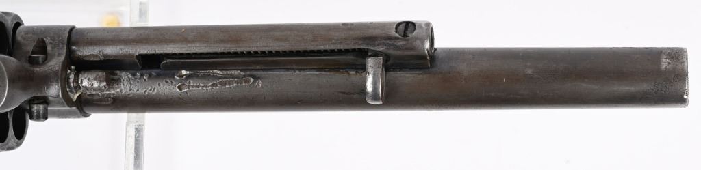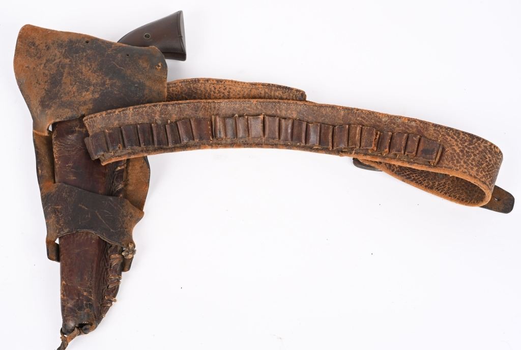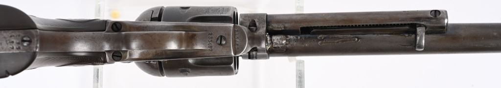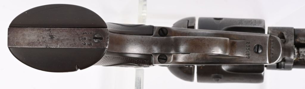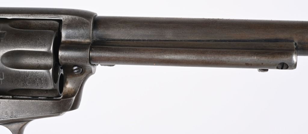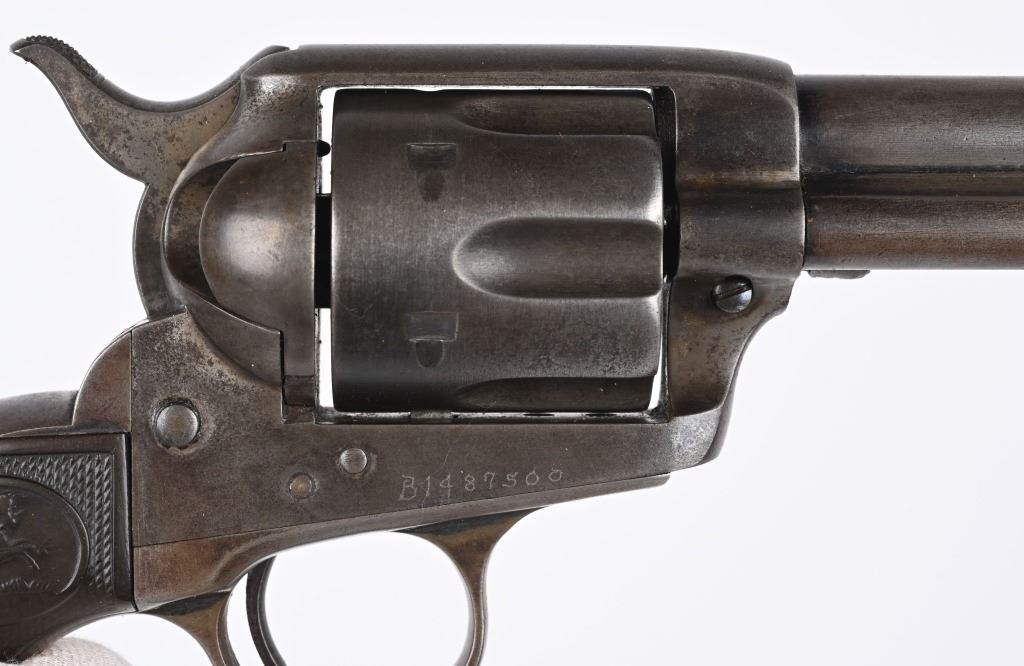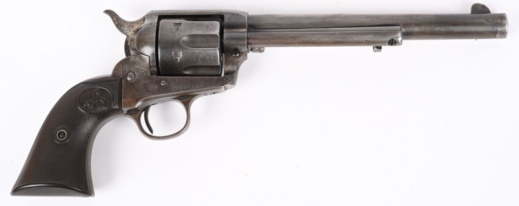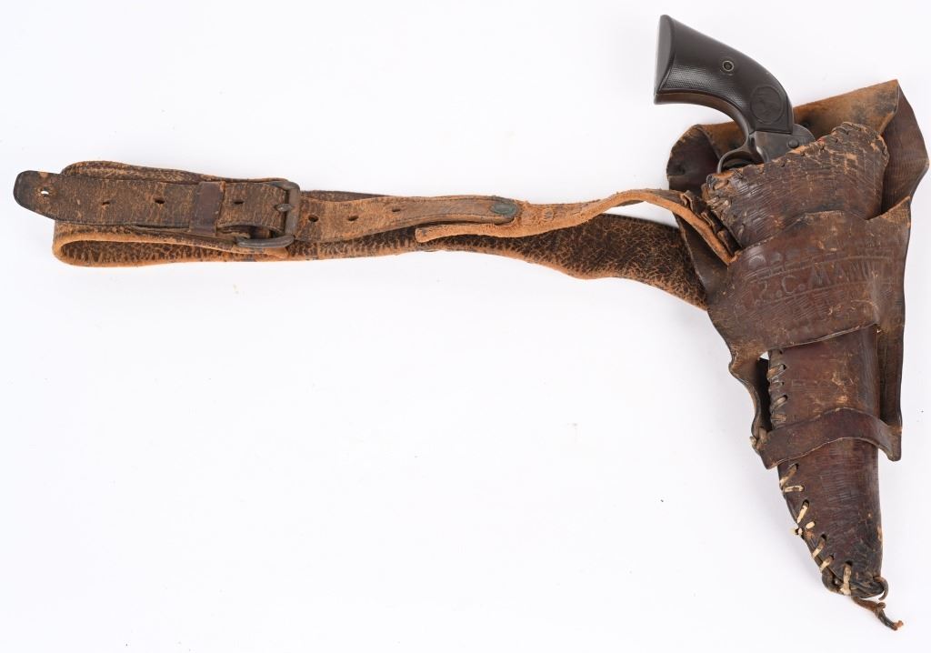 SERIAL 235487. BARREL 7.5". CALIBER 44-40. MADE IN 1902. Standard blue and case color with gutta percha grips. Barrel is stamped COLT FRONTIER SIX SHOOTER. Matching numbers on frame, trigger guard and back strap. Comes with a relic condition hand tooled holster & belt with the name S.C. MANUEL carved on upper loop. Condition. Crisp legends on frame and barrel but metal has little original finish, mostly a soft gray patina. Grips are excellent. Indexes and locks up correctly. Bore is excellent. Someone has etched an id number , lightly, on right base frame. C&R