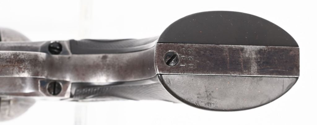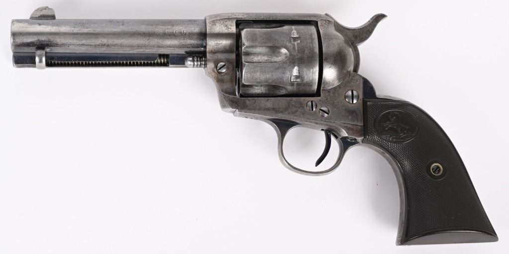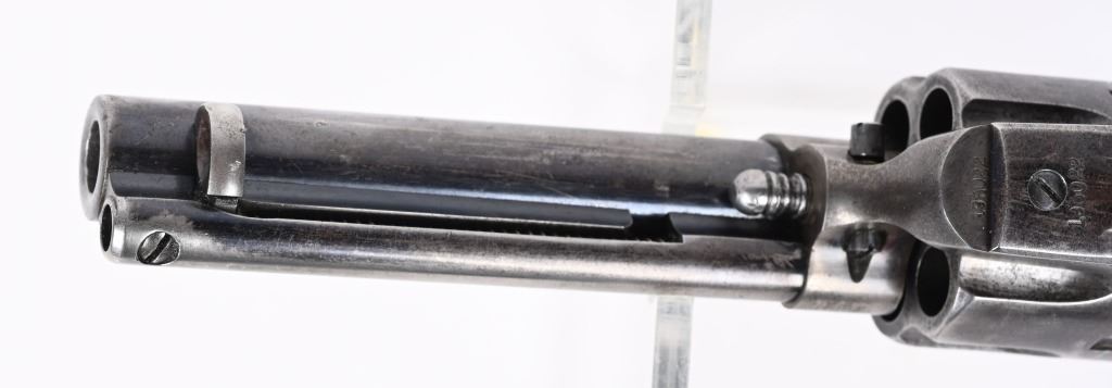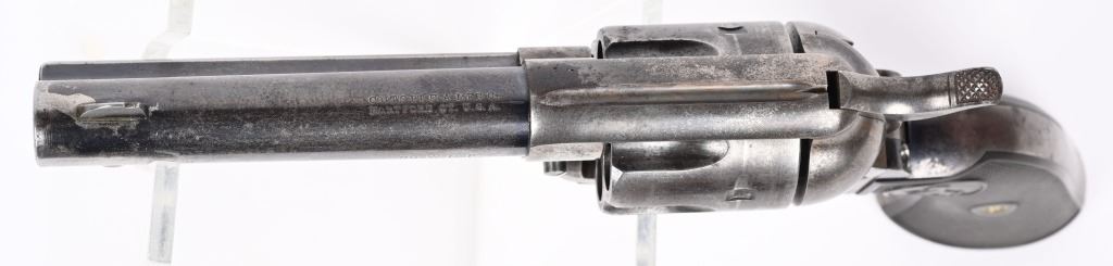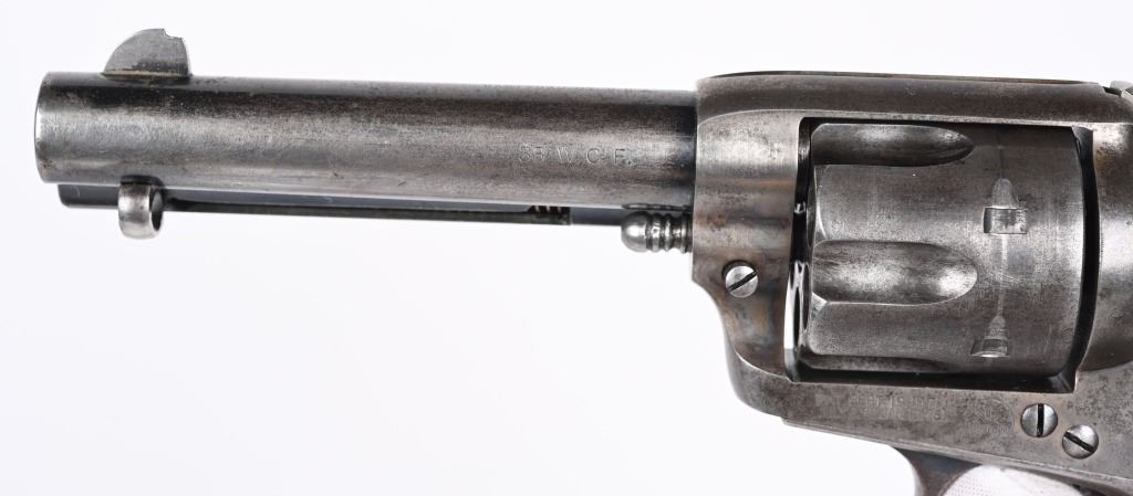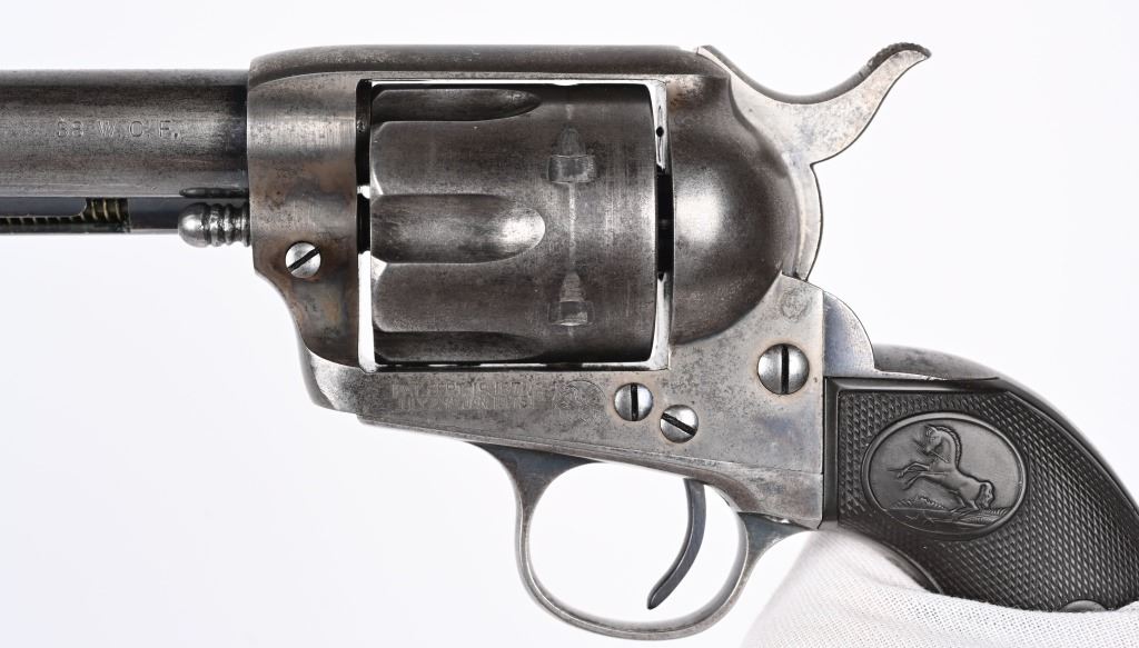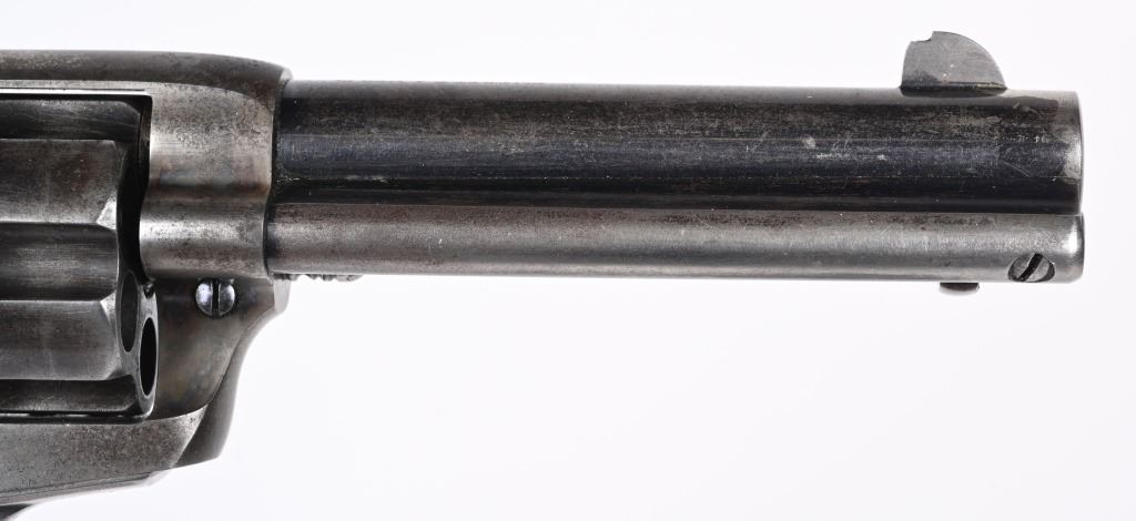 SERIAL NUMBER: 195022. BARREL: 4-3/4". CALIBER: .38 WCF. MANUFACTURED: 1900. Two line company address on the top of the barrel. Patent dates on the left side of the frame, with a rampant Colt Pony behind them. Blade front sight has a notch cut into it. Original blued and case colored finishes. Checkered brown hard rubber grips. CONDITION: Metal is good overall, with most areas forming a heavy gray/brown patina. Traces of blue can be seen on the edges. Grips have light wear. Bore has some light frosting, but remains mostly clear. Rifling remains strong. Tight hammer and cylinder. Mechanically fine. C&R