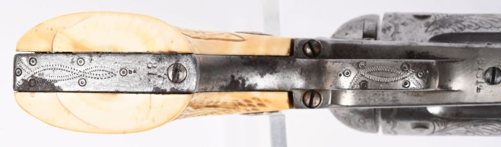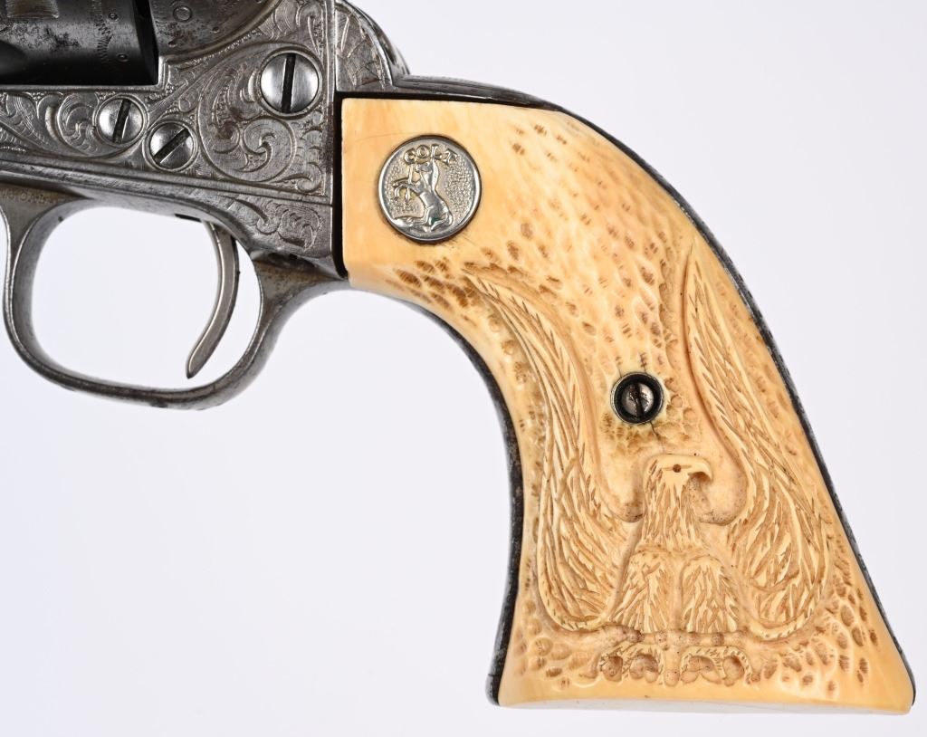 SERIAL 87314. BARREL 4 3/4". CALIBER 45. MADE IN 1883. Standard features. This gun features nearly full coverage New York style bank note engraving with carved eagle ivories on left and simple stippling on right panel. Gun is period nickel plated. Condition. Retains about 30% nickel finish blending with gray patina and a few minor areas of brown age spots, mostly on straps. Grips are finely aged with a bit of shrinkage. All matching numbers on frame, trigger guard and back strap. Action is fine. Bore is strong with just a couple spots. ANTIQUE