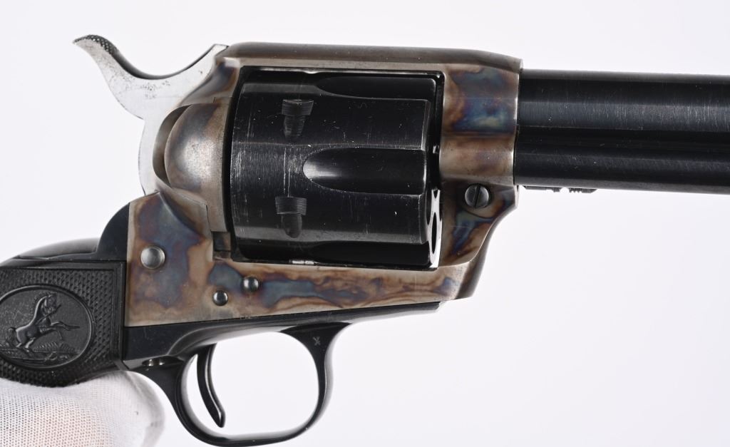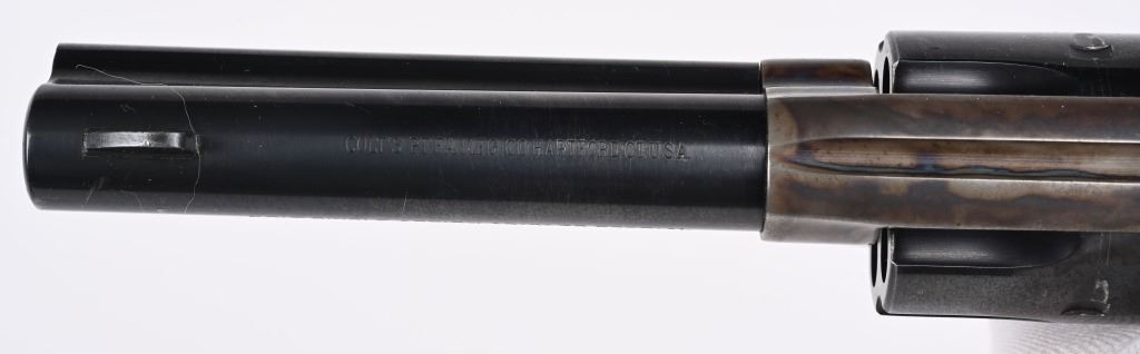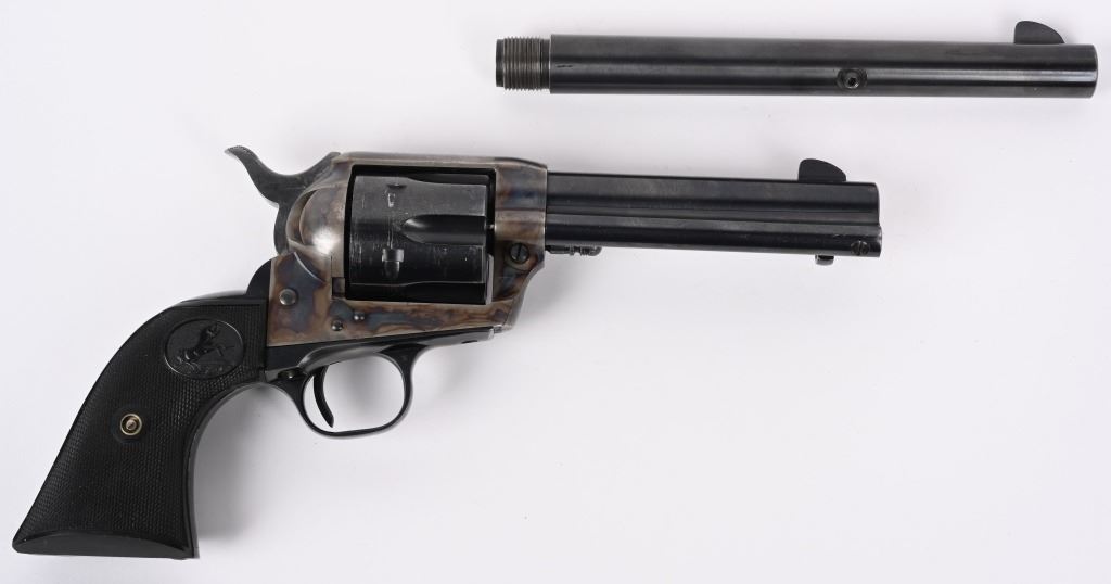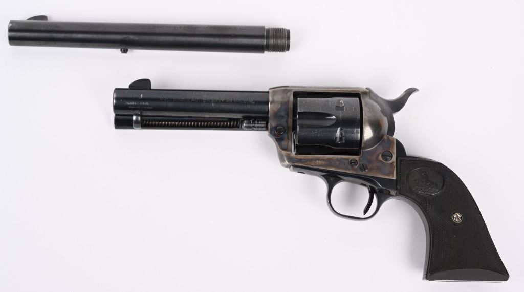 SERIAL 12914SA. BARREL 4 3/4". CALIBER .38 SPECIAL MADE IN 1957. The gun sports the short barrel but also comes with a matching blue 38 barrel in 7 1/2" It either left with a 7 1/2" from factory and was changed or it left as is and he ordered the long barrel to switch it over and did not. Gun is typical blue and case color finish with black grips. Condition. Muzzle has a bit of wear and there are some light spherical lines on cylinder. The extra barrel also has just a hint of wear on muzzle. Both bores are excellent. Action fine, Retains nearly all the case colors and blue screws. Grips are near mint. C&R