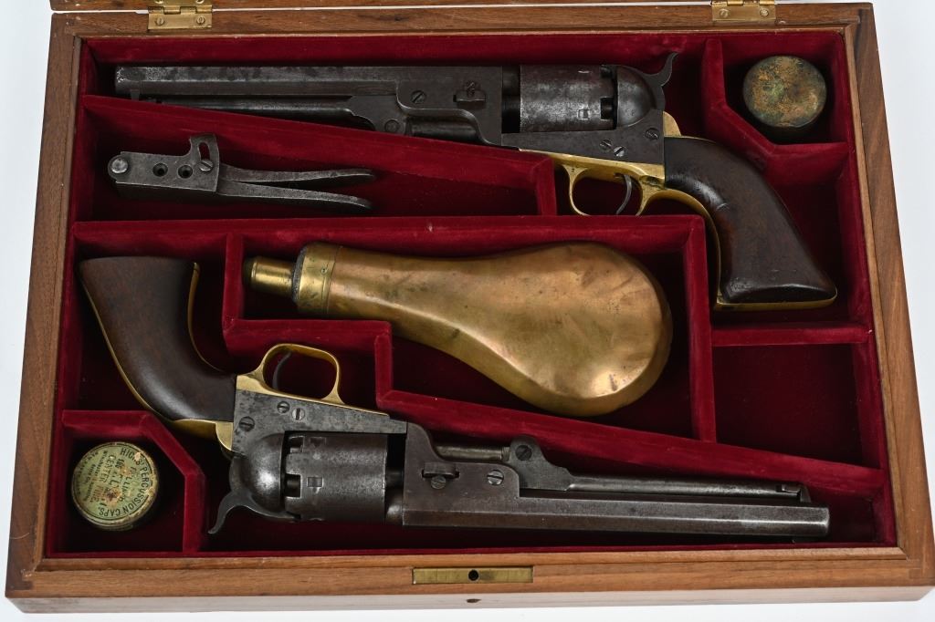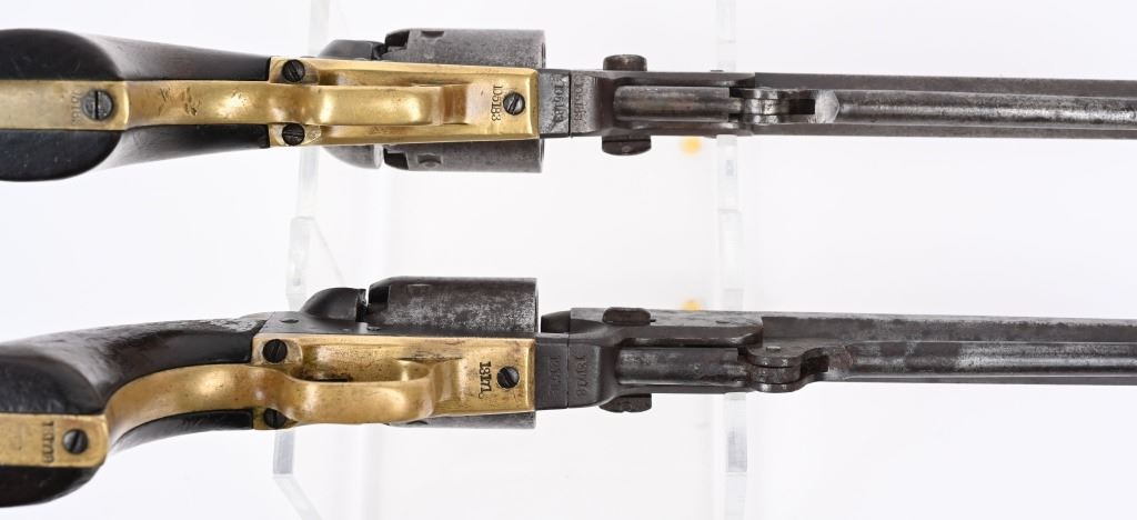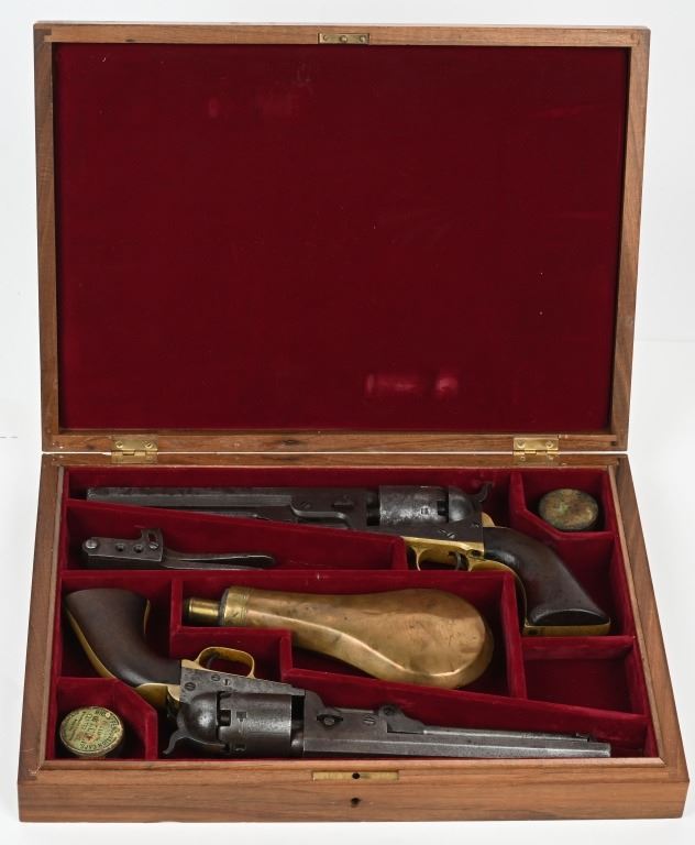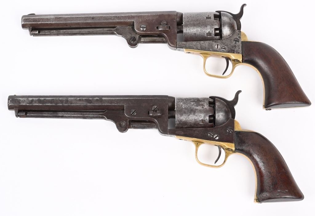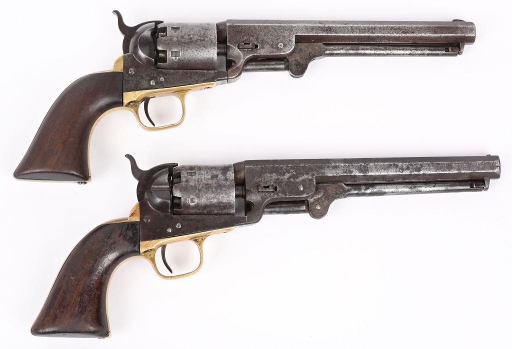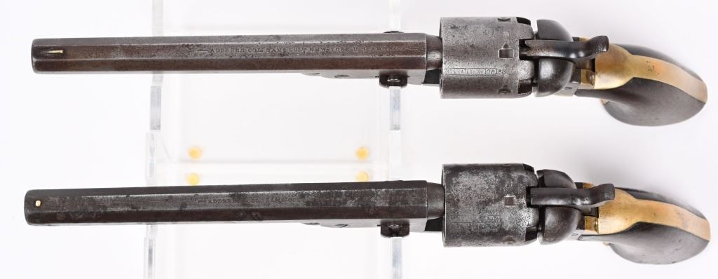 A. SERIAL 105183. MADE IN 1861 with NEW YORK address. Condition. No original finish. All matching numbers including post except wedge. Naval scene on cylinder is partially visible but faint. Gun is a smooth gray patina with a sharp bore and functions properly. One piece walnut grips are excellent. B. SERIAL 131718. All matching numbers including wedge but cylinder number hard to rear but visible numbers appear correct. Condition. No finish. Dark gray with areas of deep dark brown. Cylinder scene partially visible. One piece walnut grips are very good. Bore is sharp but there is residue spotting. Indexes correctly but spongy hammer at full cock. Both guns employ an octagon barrel, brass trigger guard and back strap. Comes in modern case with flask that has some dents, two cap tins and a Colt marked bullet mold. ANTIQUE