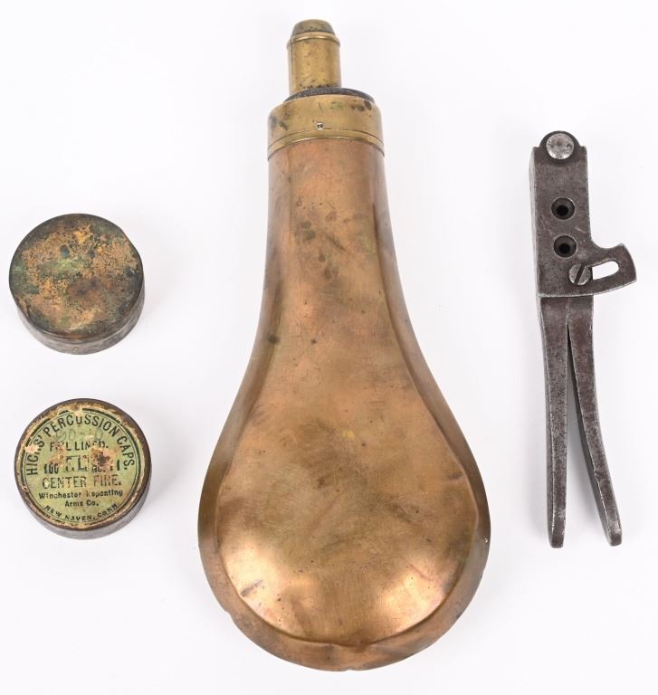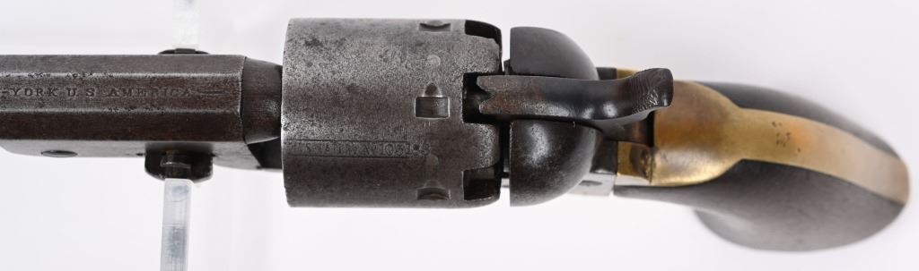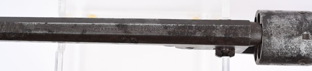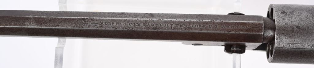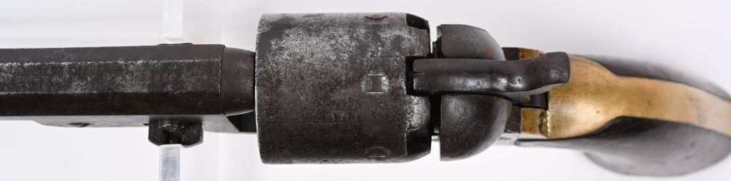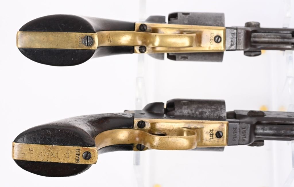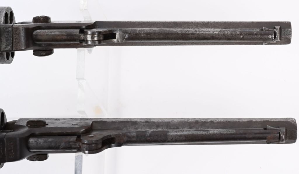 A. SERIAL 105183. MADE IN 1861 with NEW YORK address. Condition. No original finish. All matching numbers including post except wedge. Naval scene on cylinder is partially visible but faint. Gun is a smooth gray patina with a sharp bore and functions properly. One piece walnut grips are excellent. B. SERIAL 131718. All matching numbers including wedge but cylinder number hard to rear but visible numbers appear correct. Condition. No finish. Dark gray with areas of deep dark brown. Cylinder scene partially visible. One piece walnut grips are very good. Bore is sharp but there is residue spotting. Indexes correctly but spongy hammer at full cock. Both guns employ an octagon barrel, brass trigger guard and back strap. Comes in modern case with flask that has some dents, two cap tins and a Colt marked bullet mold. ANTIQUE