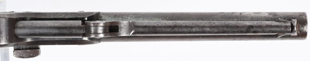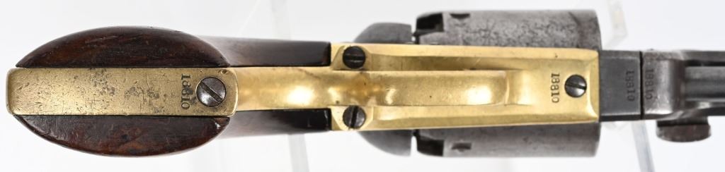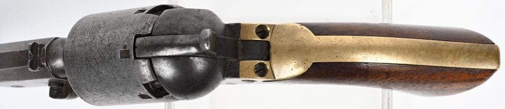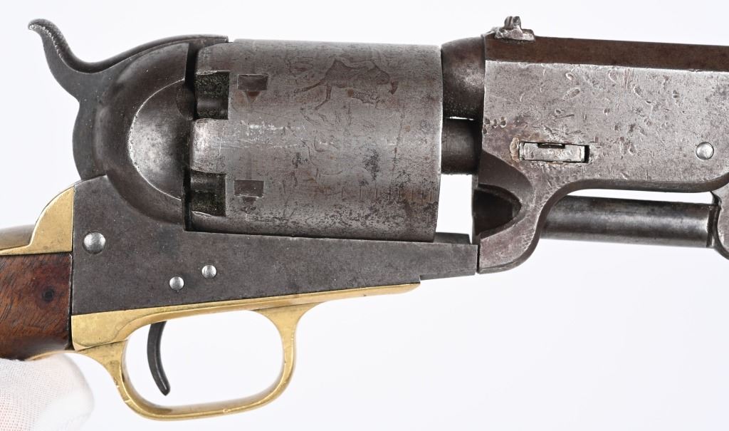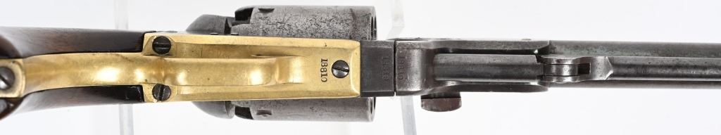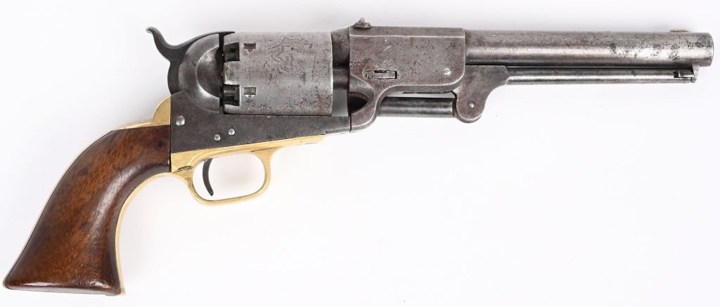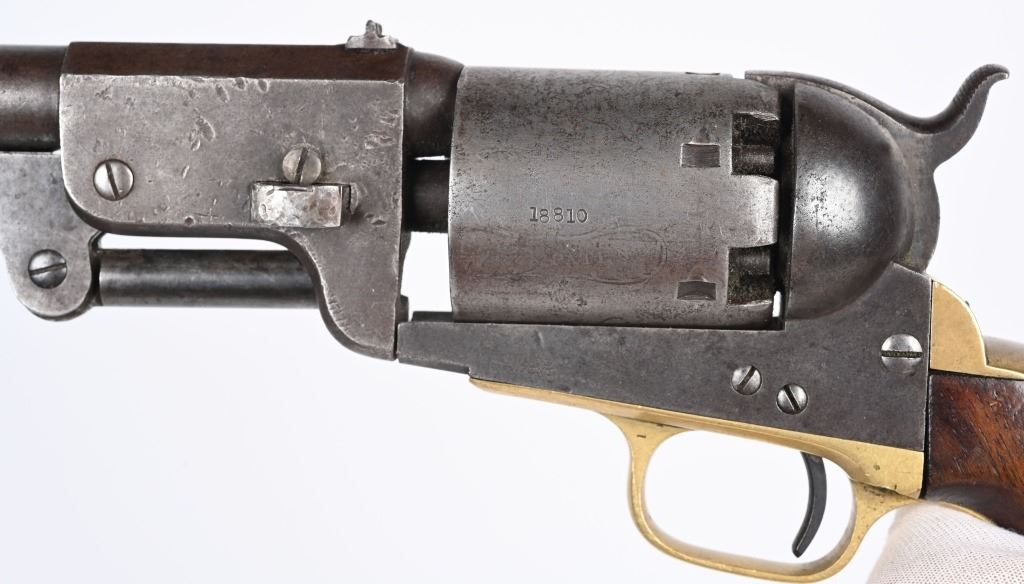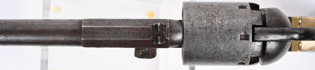 SERIAL NUMBER 18810 BARREL 8" CALIBER .44 BLACK POWDER MANUFACTURED 1860. One of the rarest of all Colt production revolvers is the 3rd Model Colt Dragoon (Horse pistol) with 8" barrel. Produced at the tail of regular production an estimated 200 examples were produced. These civilian sold revolvers were quickly absorbed with examples going South as well as to American South West. Produced with a case color frame hammer and loading lever and blue finished barrel and cylinder. The large cylinder is roll engraved with the famed "Ranger & Indian" fighting scene with U,S,M,R, & COLT'S PATENT marking by W.L. Ormsby. These enormous horse pistols weighed 4 pounds, 2 oz, and were prized possessions. This example is found to be all matching with barrel, cylinder, frame, wedge, trigger guard, loading lever, back strap and one piece grips all being properly numbered. Single line New York Address on top of barrel and a drift adjustable rear sight install as is found on the later London examples. CONDITION. Good with revolver having toned to a pleasant chocolate patina with crisp legends and mostly visible cylinder scene. Grips remain full sized with slight material loss a toe from use. The gain twist bore is very fine with small areas of corrosion. The German silver blade front sight is slightly lowed to facilitate for installed rear sight alignment. The brass grip straps have toned to a mellow mustard. The action operates properly and locks up solidly. This is a very fine example of the Rare 8" Dragoon with a estimated 200 ever produced. ANTIQUE