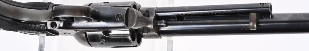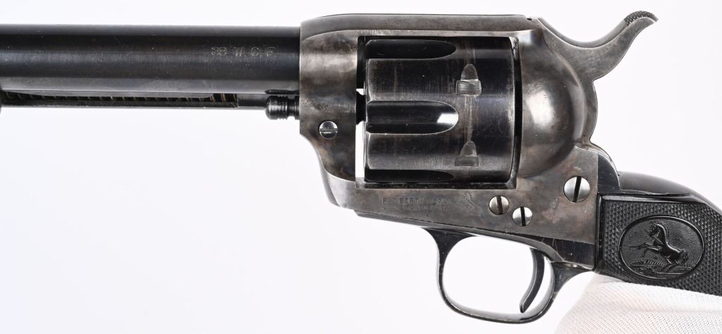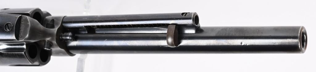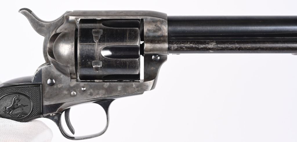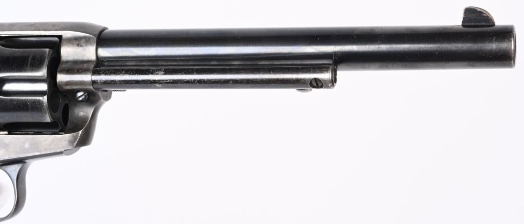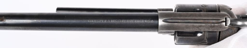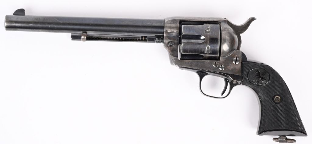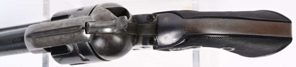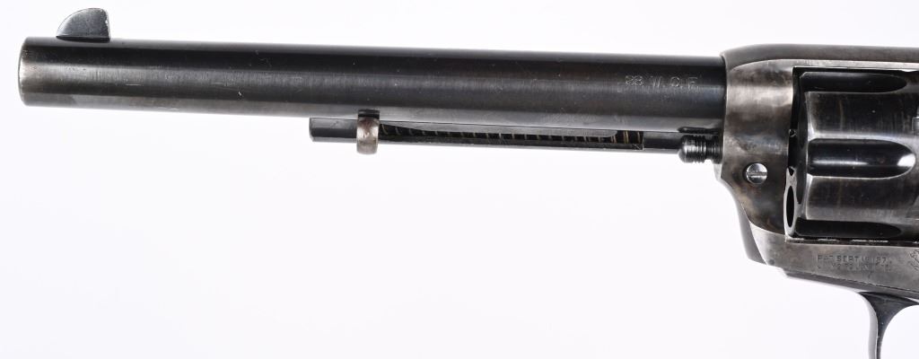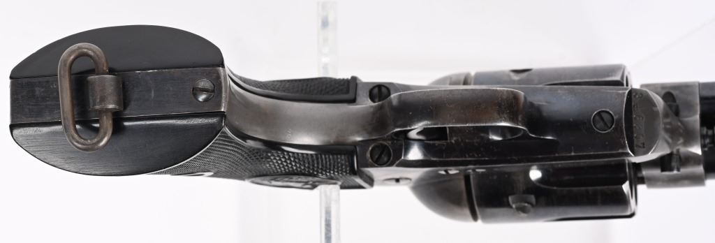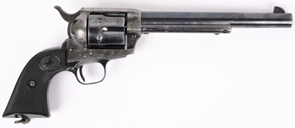 SERIAL 346807. BARREL 7 1/2". CALIBER 38-40. MADE 1903. Fine Colt is hard to find caliber with this barrel length. Standard blue and case finish with case color hammer. Butt has a period lanyard ring. Inside grips frame has serial number stamped twice as well as assembly number 477. Standard two line patent date on frame with pony. Gutta percha grips are etched 807. Condition. Barrel has some light muzzle and handling wear. Front sight proper heigth. Cylinder retains about 75% blue with overall high edge wear and circumference lines. Screw heads are thinning. Straps are mostly patina. Grips are excellent. Bore is sharp and bright. Action indexes and locks up correctly. Frame shows abut 20% color with balance patterned out. Grips are near mint. C&R