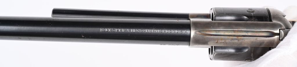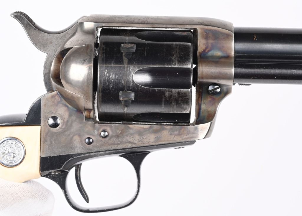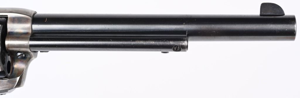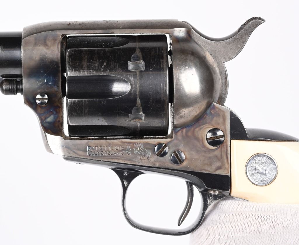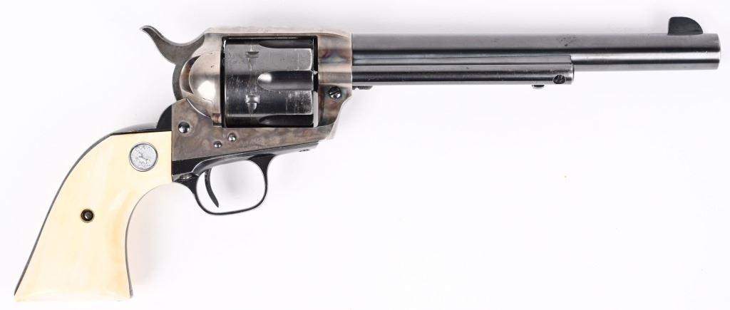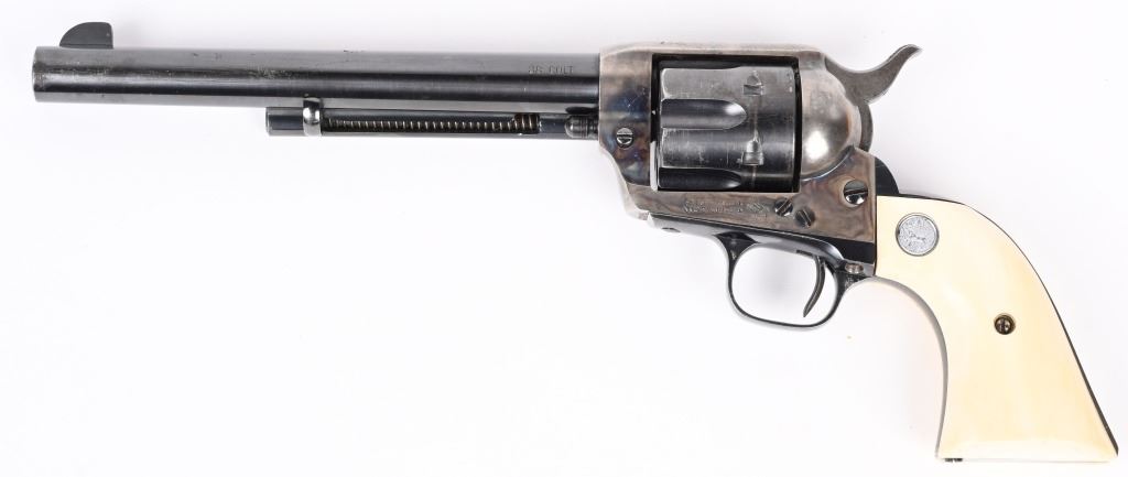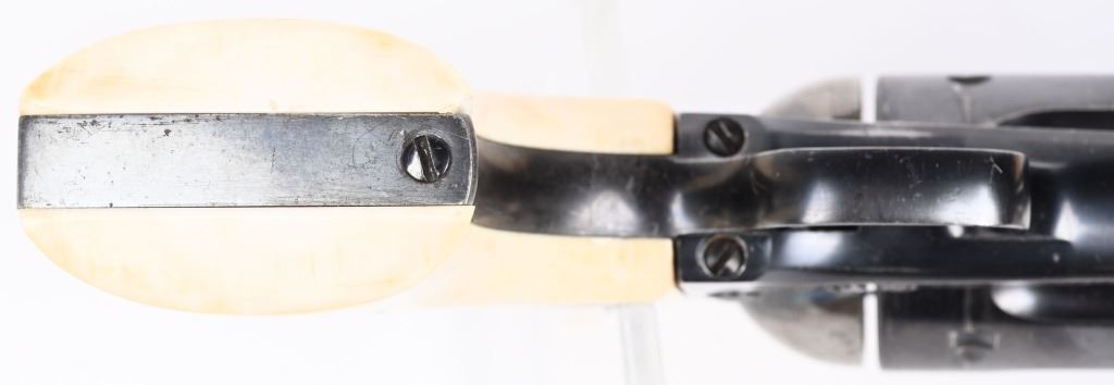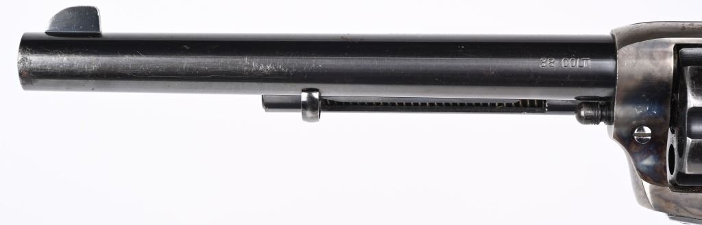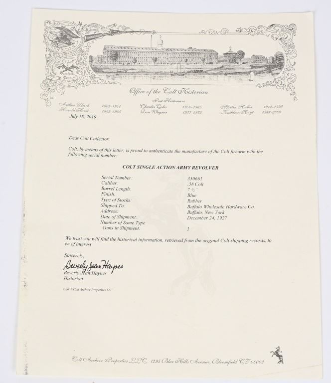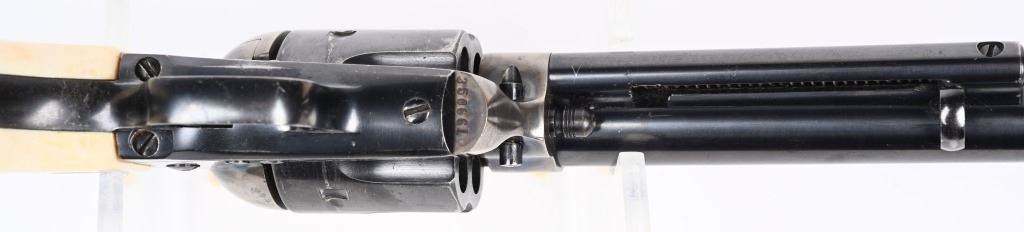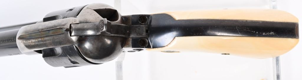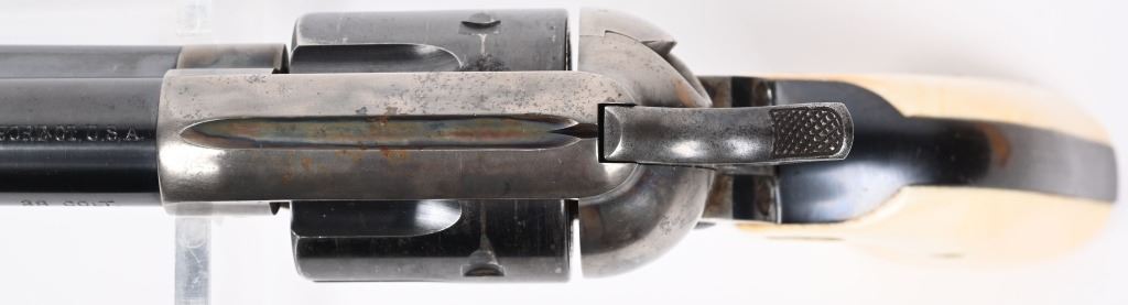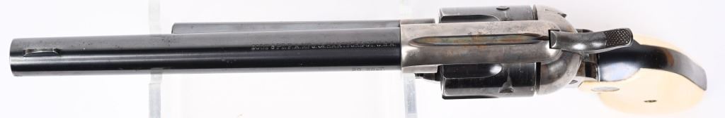 SERIAL 350661. BARREL 7 1/2". CALIBER .38 COLT. Letter states shipped as blue to Buffalo Wholesale Hardware Buffalo NY December 24, 1927 in one gun shipment. One of the harder to find cartridges as it was also chambered for the Model 1877, a much smaller gun as well as the swing out Army Navy series so very few were ordered in the Single Action. Standard blue and case finish and now sporting silver medallion two piece ivory grips. Condition. Very fine. Barrel and ejector housing retain at least 95% blue with light wear at muzzle and minor thinning and handling. Cylinder has some circumference rings and high edge wear. Straps are tinning but both still retain at least 75% finish. Hammer and frame retain about 75% case color with some fading. Grips are excellent. Strong rifling with bright grooves. Action is tight. C&R