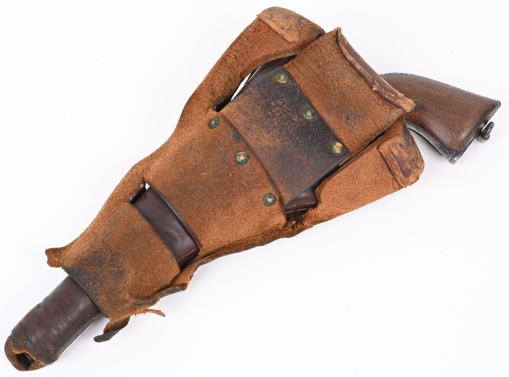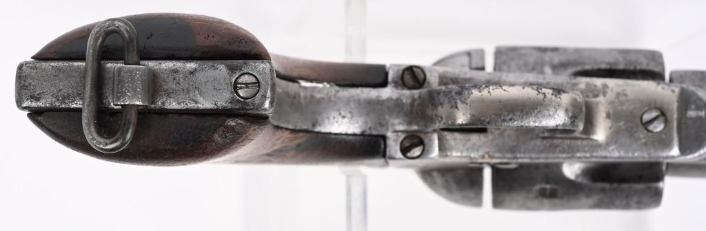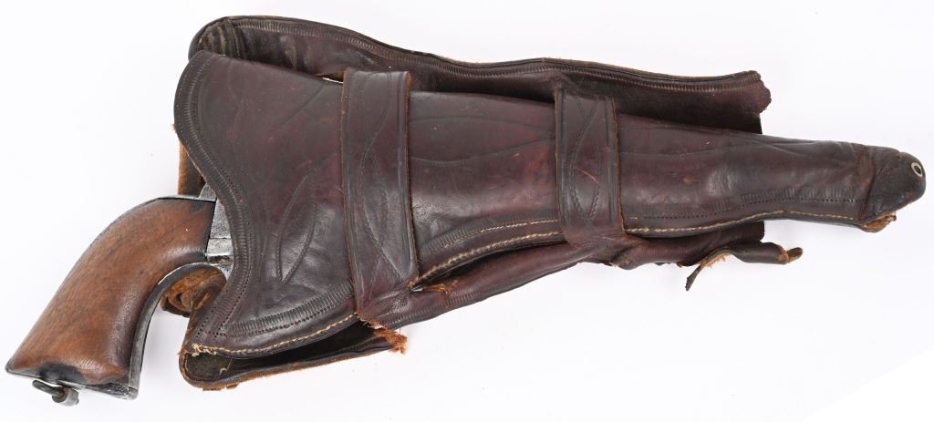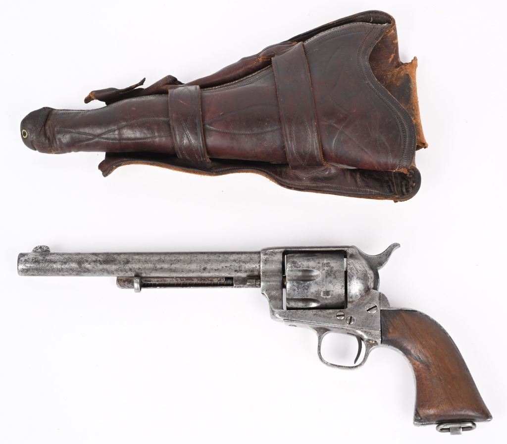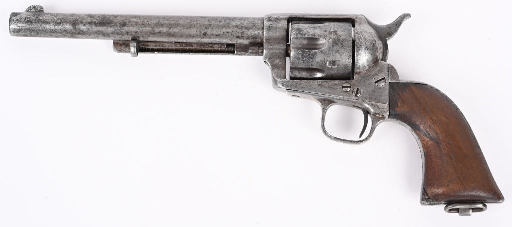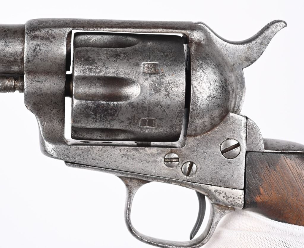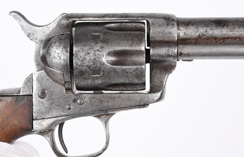 SERIAL 213. BARREL 7 1/2". CALIBER .44 RF. Only 1,863 Single Action Army revolvers were chambered in this caliber. The 44 rimfire series was introduced in 1875 and they were serial numbered in their own range of 1 to 1,863..Most were shipped to the Mexico border states and Mexico and almost all of them show the kind of wear one would expect and this example is indicative of that hard use. You can see the serial number on frame and trigger guard and can read the number "1" on backstrap. No visible barrel stamp or on frame. Looks like all the correct parts with one piece walnut grips and lanyard ring. Barrel has not been stretched. Cylinder indexes but does not lock in place. Condition. Fair. Signs of some old re-nickel. Grips are chipped. Metal is gray patina with freckling. Rifling is strong but pitted. Comes in a period tooled high quality 1880's unmarked holster that has bottom of skirt worn but a good western look. ANTIQUE