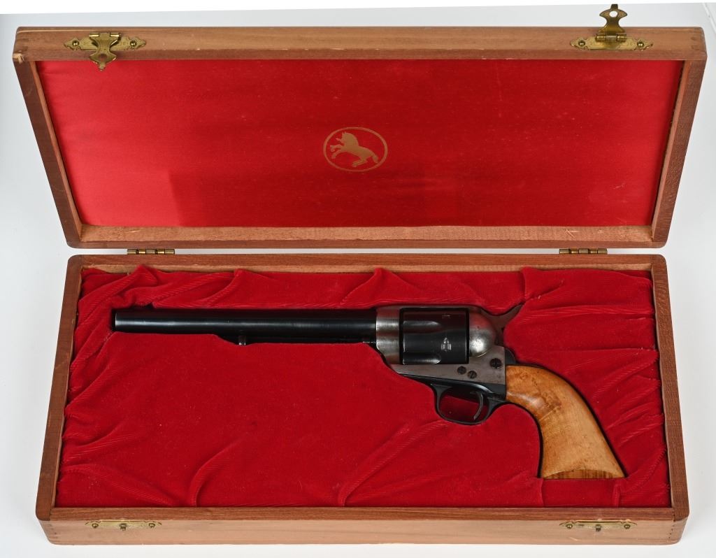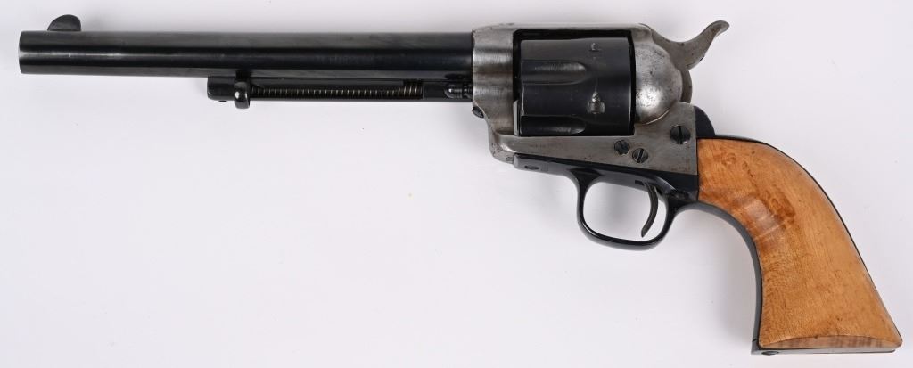 SERIAL 16148. BARREL 7 1/2". CALIBER 45 COLT. MADE 1875 Early standard revolver with blue and case color finish that was refinished at one time. Only one line of patent date visible on frame. Barrel address is readable with exception of "Colts" The barrel was replaced with a DFC inspected cavalry barrel with proof P and serial numbered. Matching numbers on frame, trigger guard and partial on back strap with plugged lanyard hole. Grips are one piece maple. Cylinder number not visible but correct with removable bushing. The case colors on hammer and frame are gone and now just gun metal indicting it was never re-colored but was cleaned at one time. Solid 95 % of reapplied blue remains. Rifling is strong but frosted. Action indexes and locks up fine. Grips are near mint. Comes in Colt case. ANTIQUE