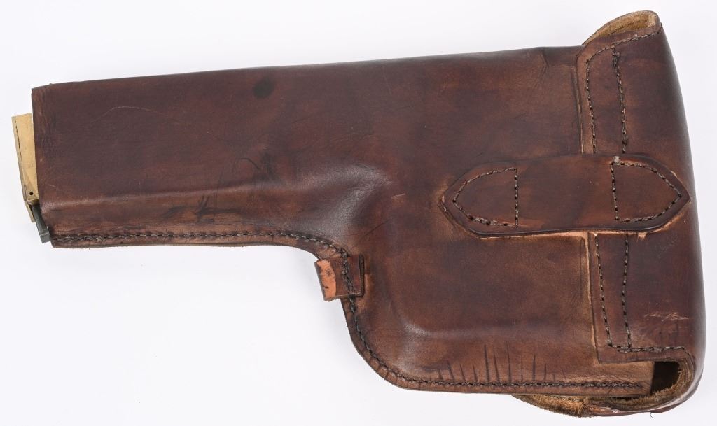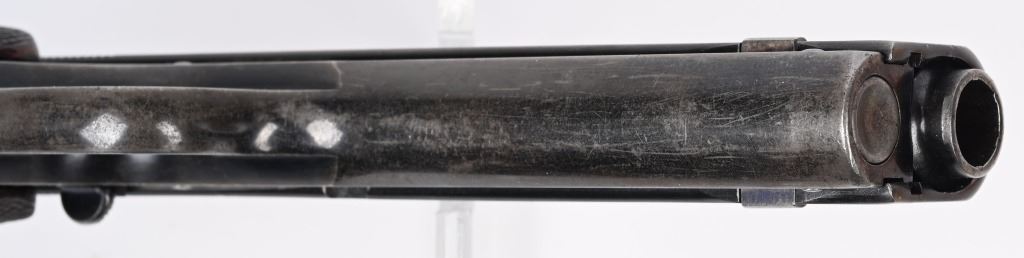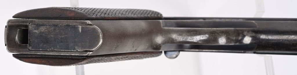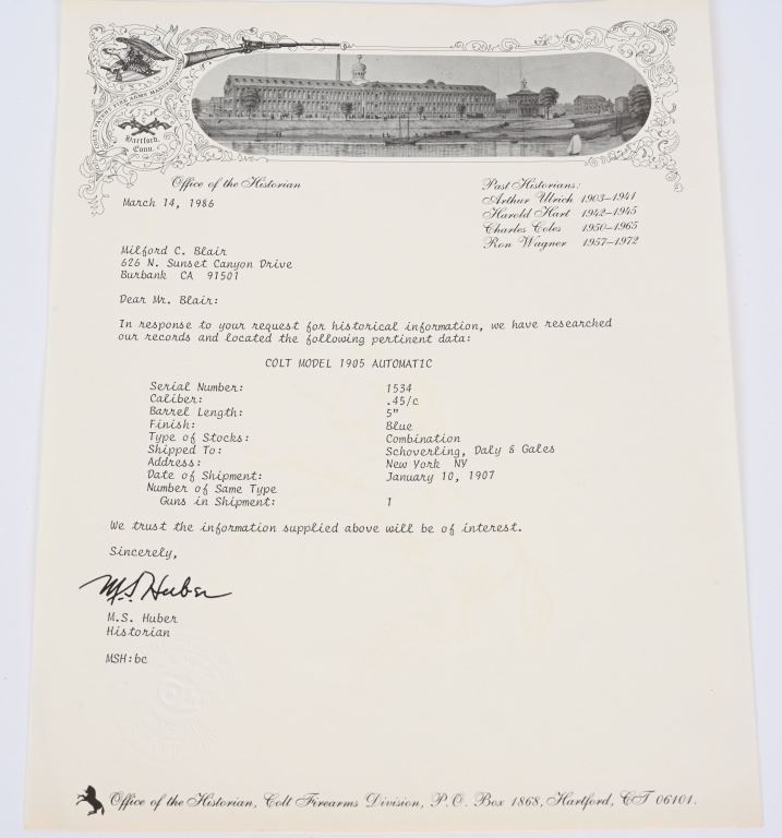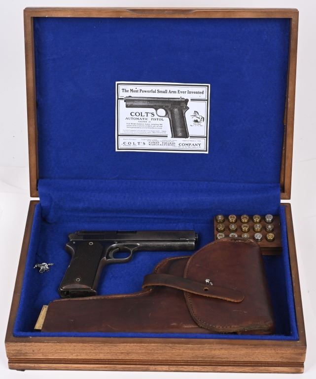 SERIAL NUMBER 1534 BARREL 5" CALIBER .45 ACP MANUFACTURED 1907. Produced as the first production 45 Colt automatic pistol and documented by the factory as having been shipped in 1907 to Schoverling Daly & Gales New York NY with blue finish 5" barrel and Combination stocks,(indicating pistol was shipped with shoulder stock). Pistol is factory slotted at rear base of grip strap with 2 milled slots and a 1/2 moon dovetail for the locking link on the stock. Pistol has been equipped by previous collector with a recreation of the Colt Shoulder stock / holster. CONDITION, Good with the pistol retains 50% blue finish with losses on slide and grips straps from carry. Bore is strong with darkness in grooves. Grips are very fine with moderate wear and a small crack at top right screw. Recreated holster / stock has supple leather and solid stitching. Attaching iron fits pistol but fails to lock into place. An extremely rare example of an American Shoulder stocked pistol. Comes in Display case with factory letter. C&R