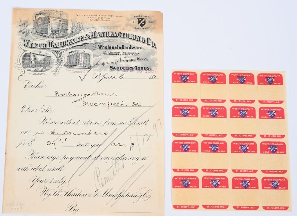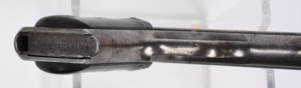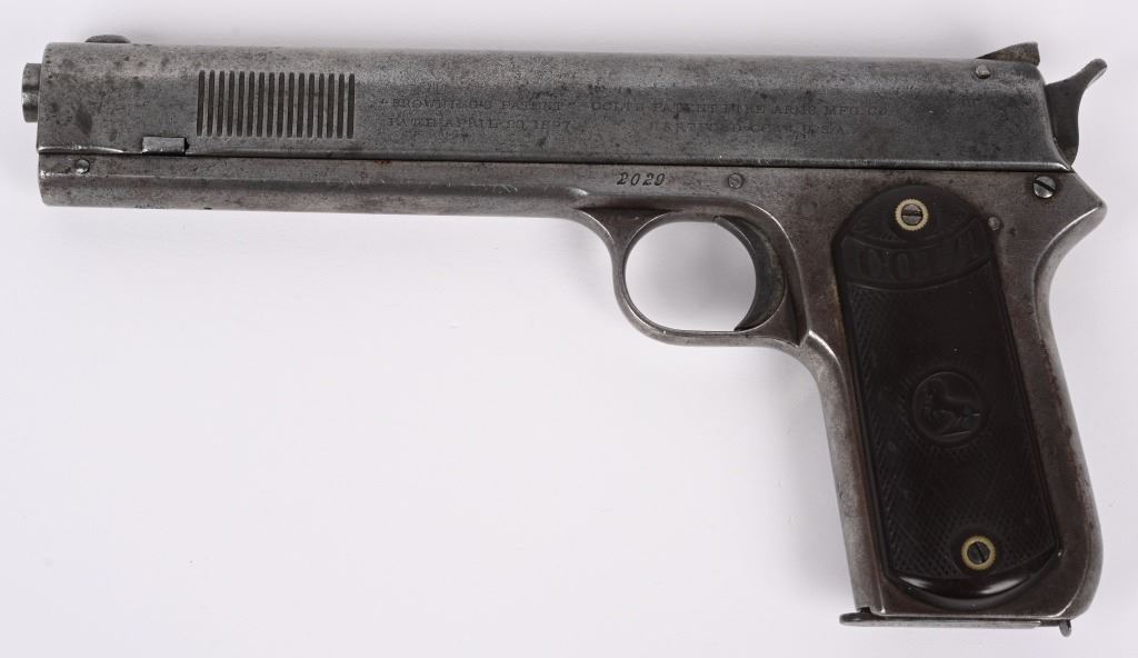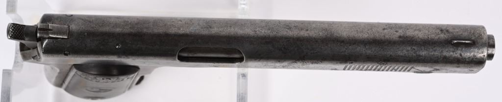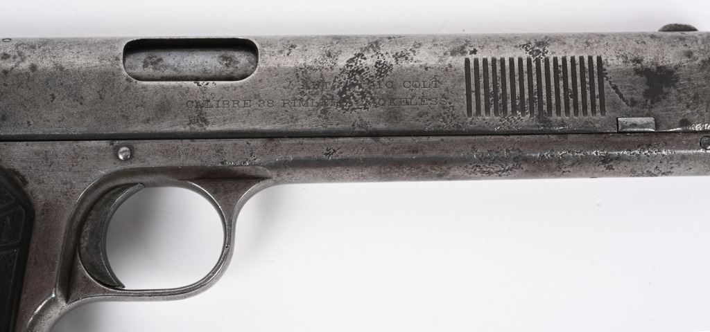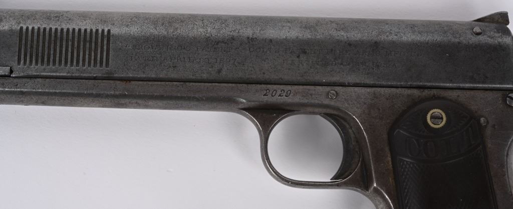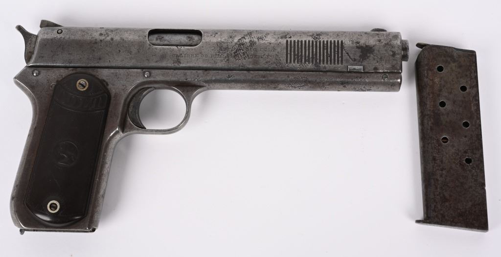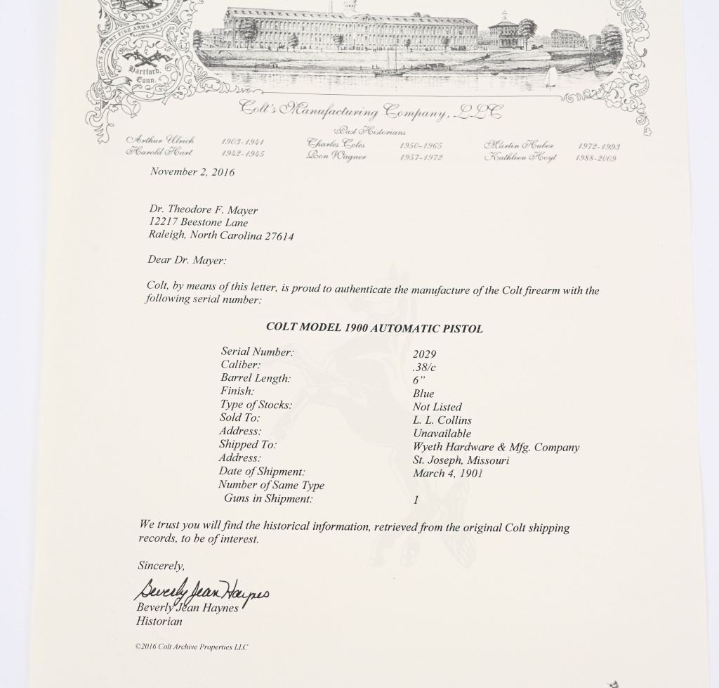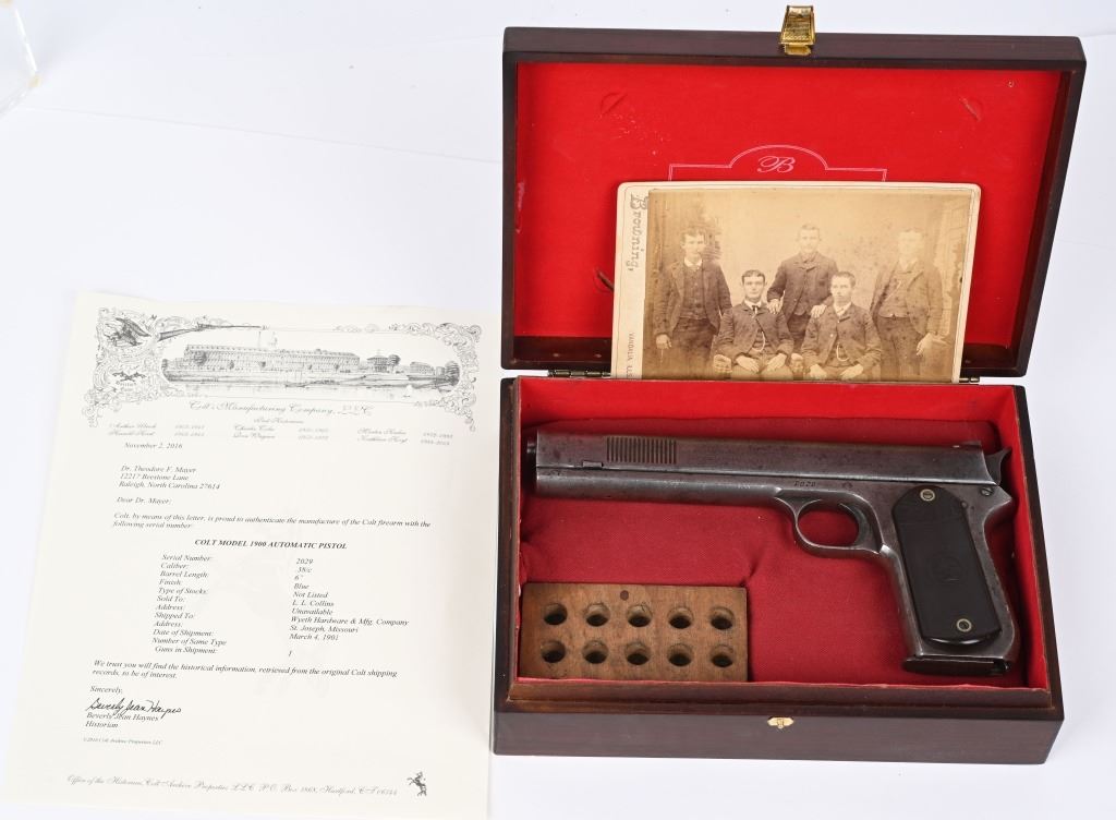 SERIAL NUMBER 2029 BARREL 6" CALIBER .38 COLT AUTO MANUFACTURED 1901. Factory letter indicates pistol was shipped with blue finish 6" barrel and grips not listed. Sold to to Mr. L.L. Collins and factory shipped to Wyeth Hardware & Mfg. Company St, Joseph MO. in a single gun shipment. Previous owner has done extensive research into Mr Collins who was a practicing Attorney and has also obtained examples of circa, 1900 Wyeth Hardware sales invoices and paperwork. pistol retains the fully functional sight safety mechanism , Checkered hard rubber Colt grips with Rampant Colt monograms. Slide has forward slide serration's and spur hammer. Matching numbers on slide and frame. CONDITION. Good as found with exterior finish having toned to dove grey with good bore with some oxidation in grooves. Action operates properly. Comers with paperwork, small display case and factory letter. C&R