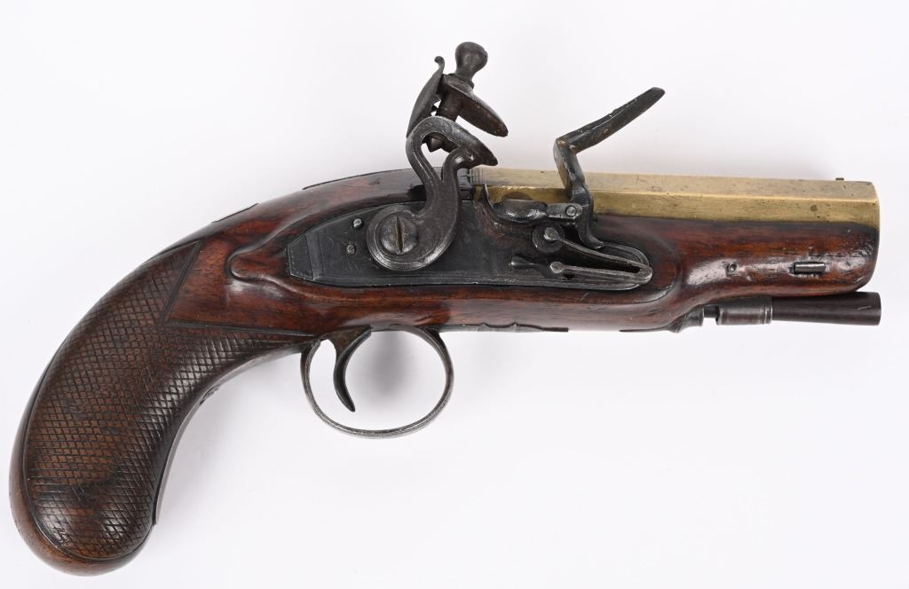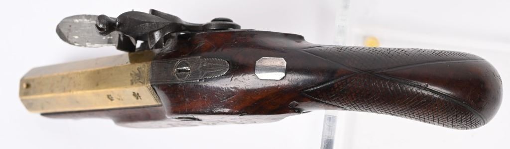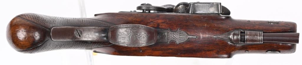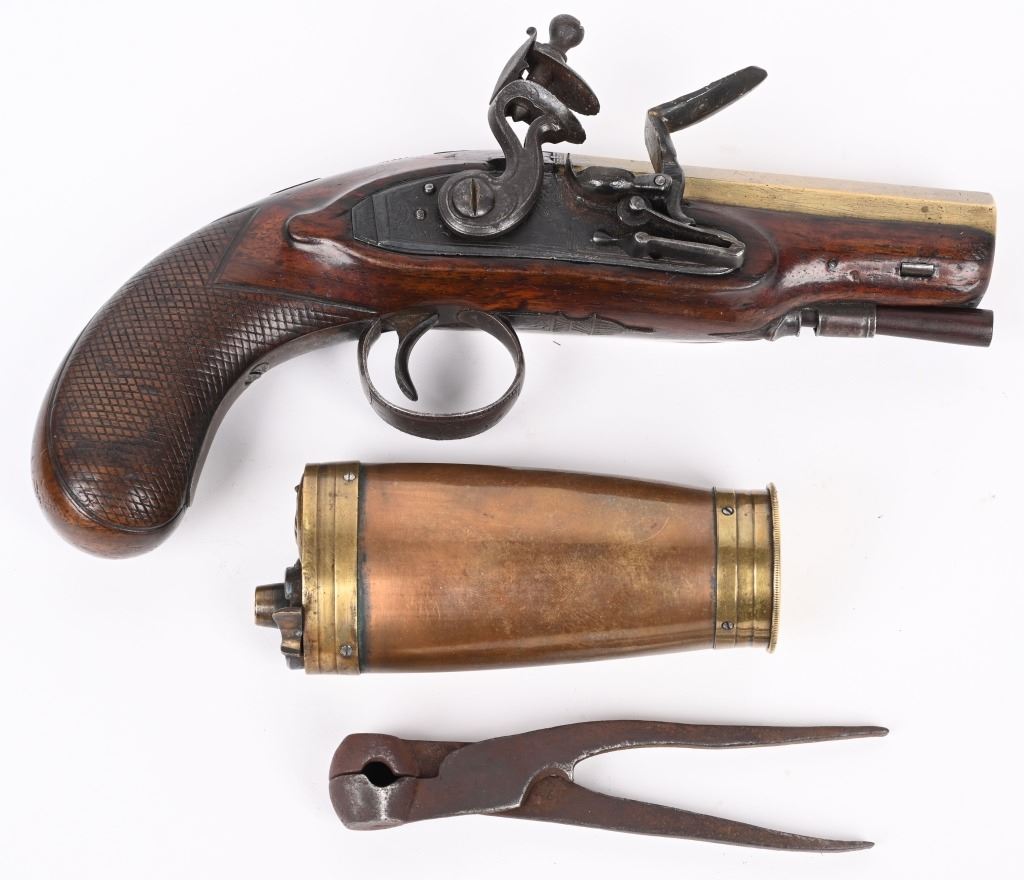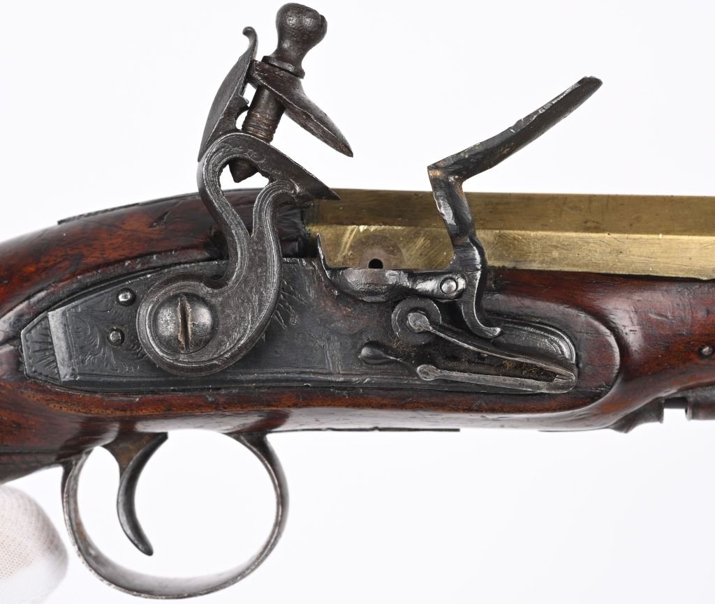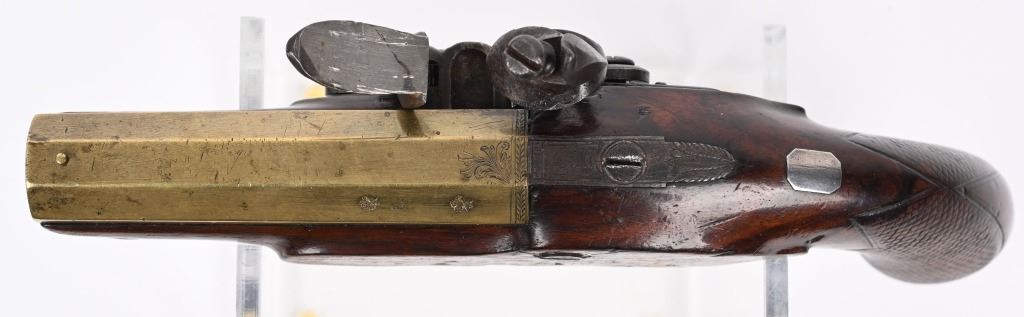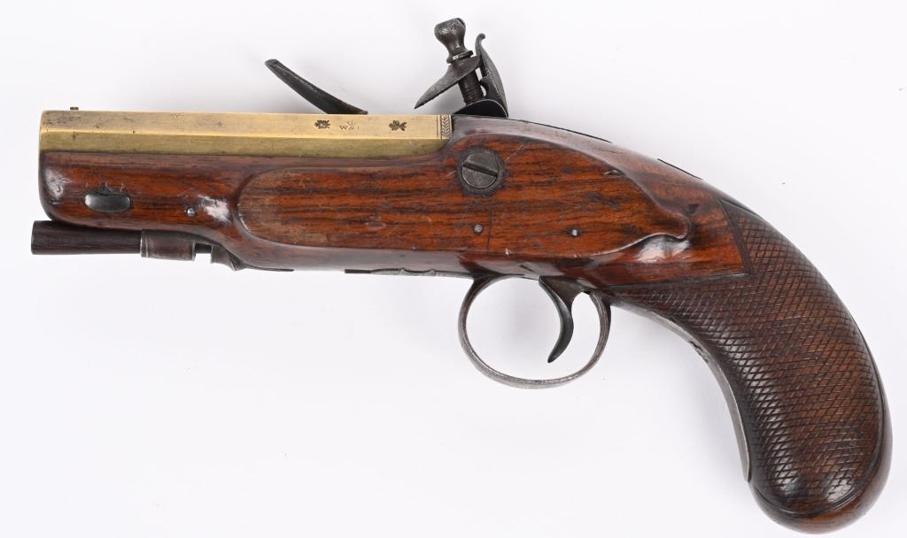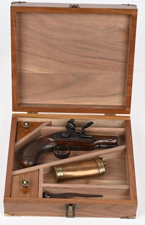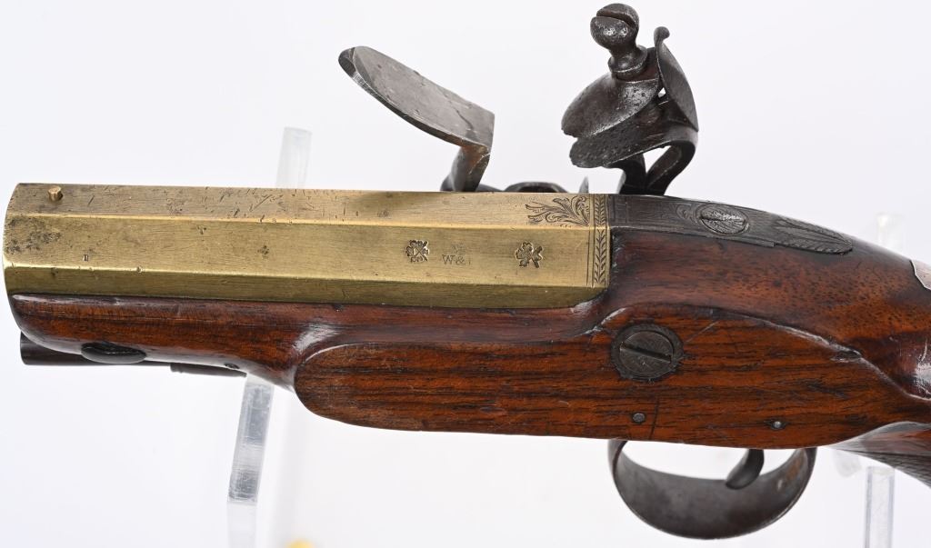 SERIAL NUMBER N/A BARREL 4" CALIBER 54 SMOOTHBORE MANUFACTURED CIRCA 1800. One piece walnut stock with checkered bag grip, ornate steel trigger guard and single loading rod rod guide. Octagon brass barrel with "W&I" crown proofs Pistol is housed in a partitioned walnut case with period mold with sprue cutter and English Ball & powder mechanical flask. CONDITION. Good with the stock being very good with some period of use impressions and bruises. The bore is good and the brass barrel has a mellow aged patina. The markings , proofs and engraving all are crisp. The case is contemporary. Flask is good with period oxidation. The mold is oxidized and remains with an uncleaned patina. ANTIQUE