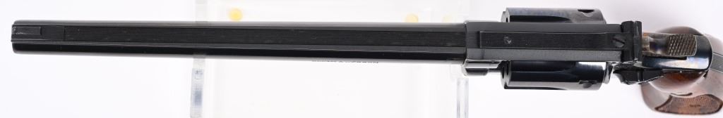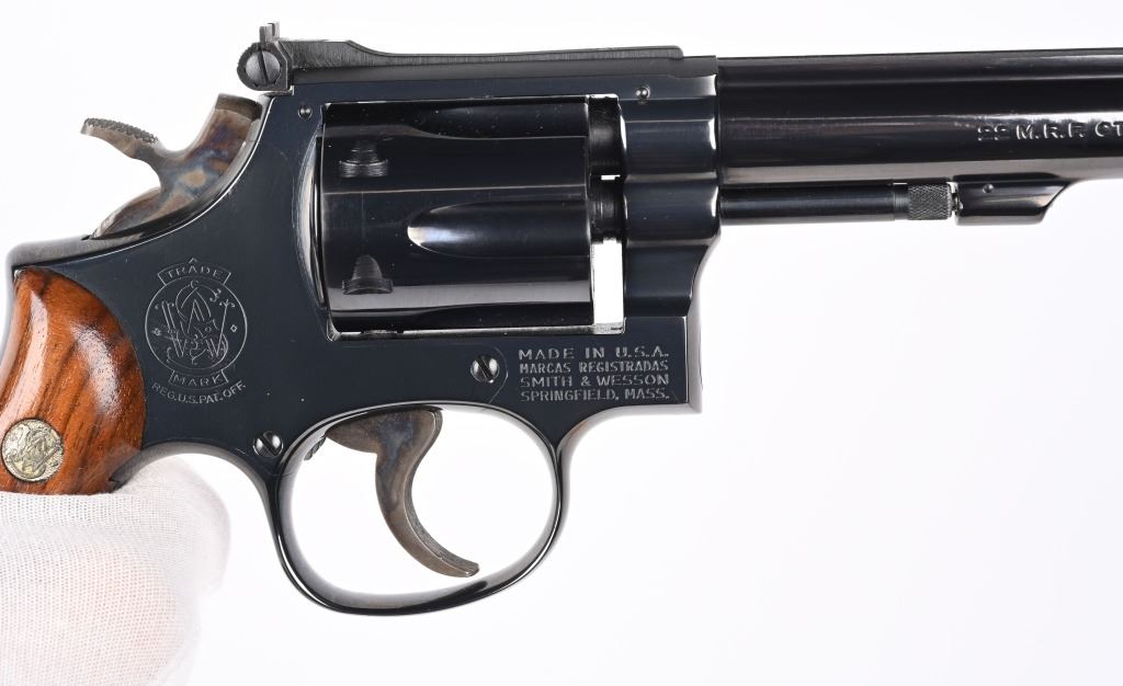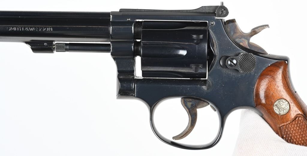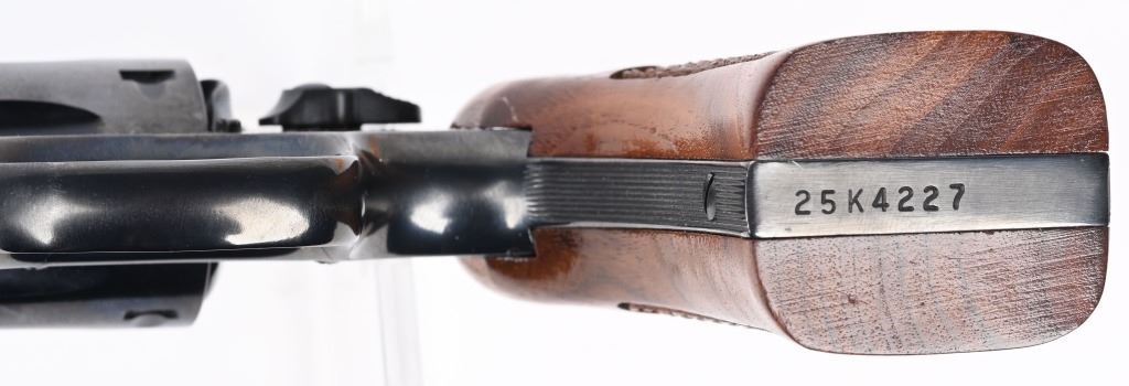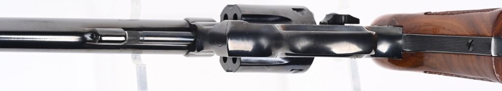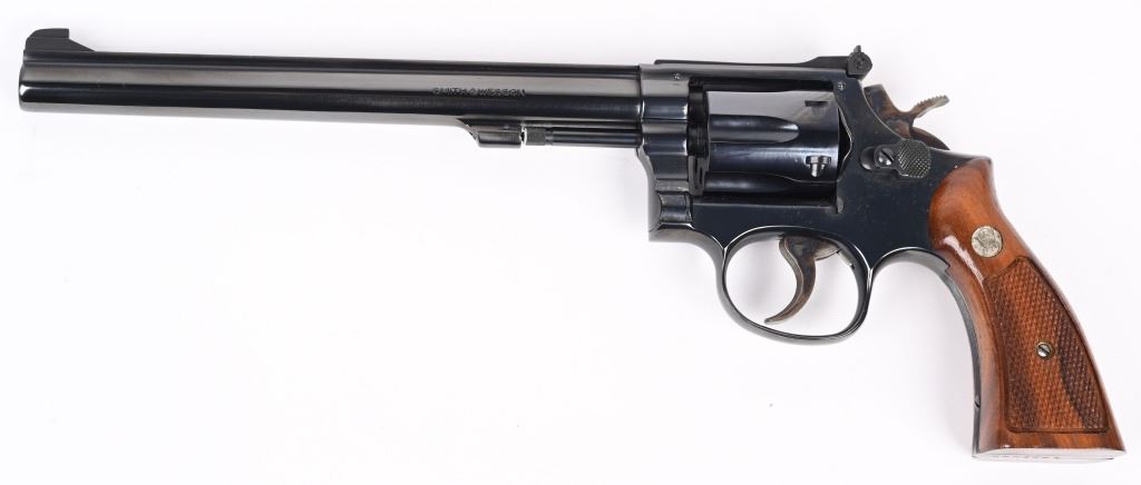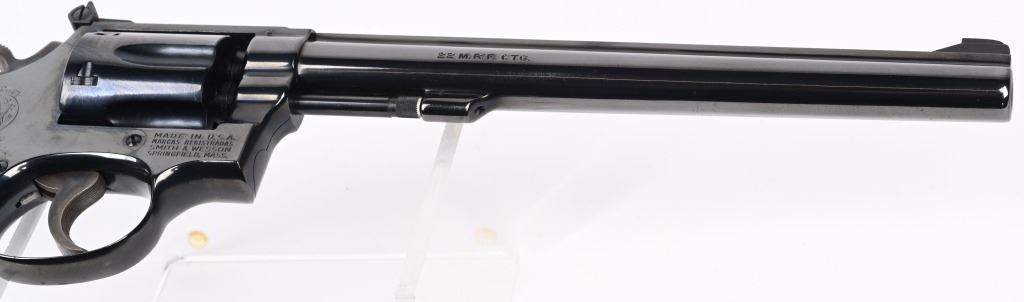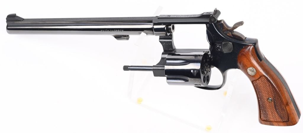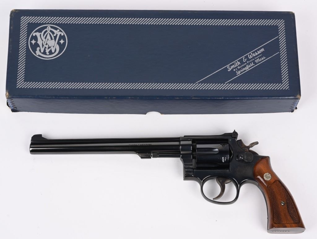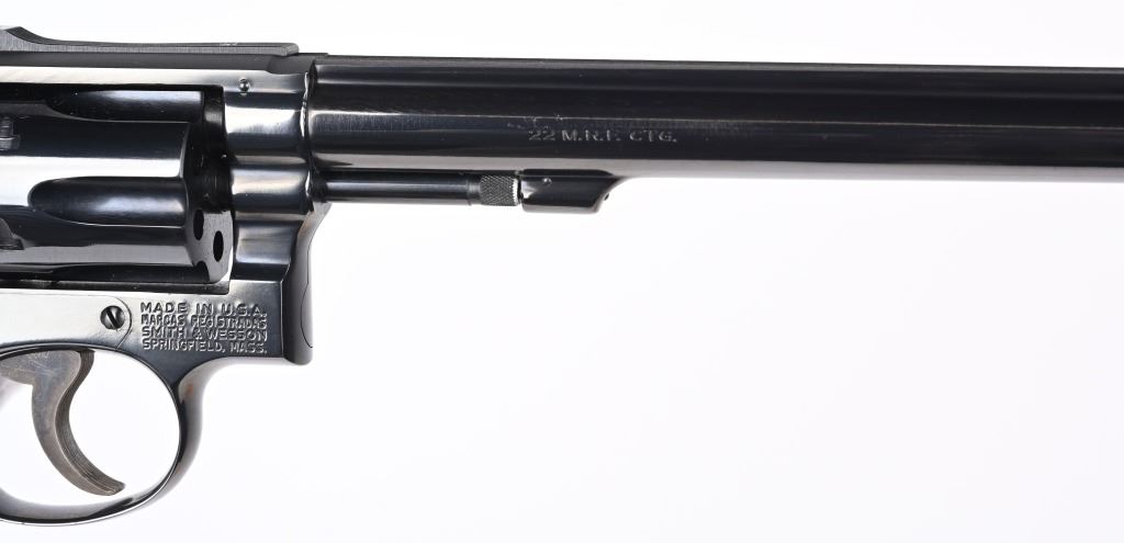 SERIAL 25K4227. BARREL 8 3/8". CALIBER .22 RIMFIRE MAGNUM. MADE IN 1978-79. Built on square butt K-frame, 3-screw, blue finish, case color hammer & trigger, target rear sight with checkered magna walnut grips. Comes in original matching box with some paperwork and tool bag. Condition. Cylinder faces shows no real burn marks, light drag line and handling only. MODERN