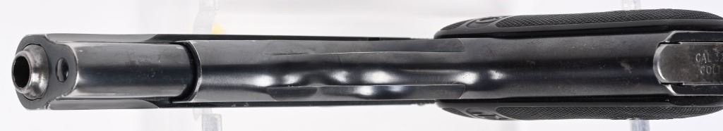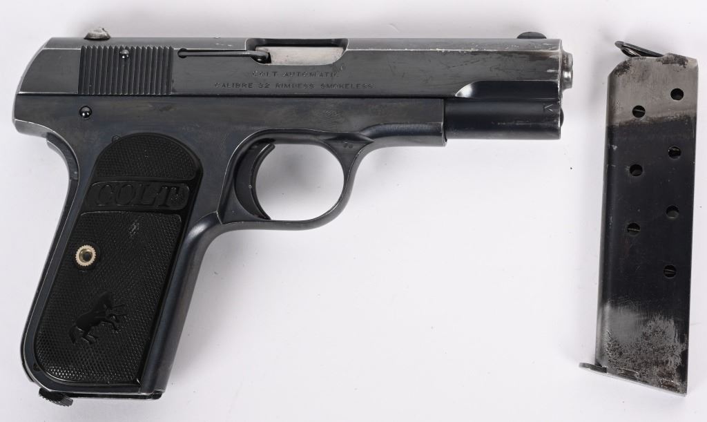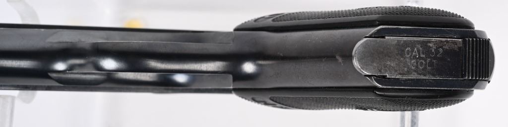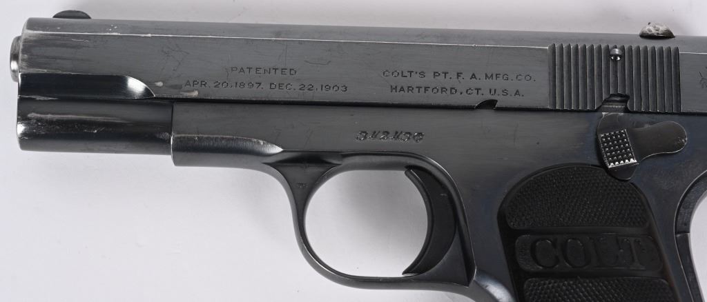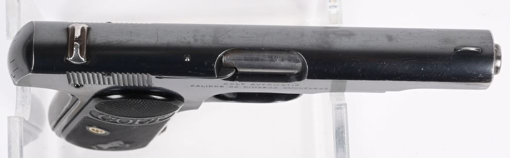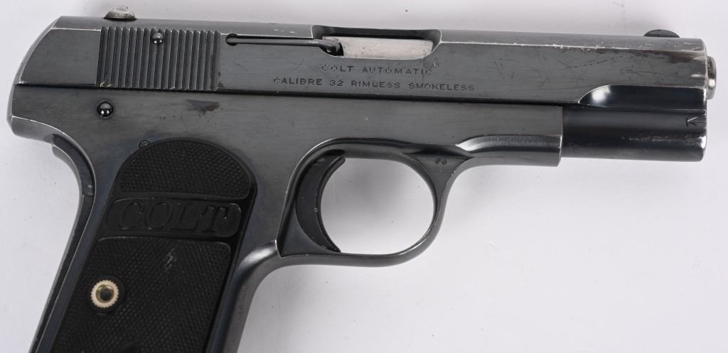 SERIAL NUMBER: 342436. BARREL: 3-3/4". CALIBER: .32 ACP. MANUFACTURED: 1920. Standard markings on the slide, with the rampant Colt pony behind the slide serration's (17 serration's). "VP" proof on the left side of the trigger guard. Blade front sight and u-notch rear. Factory Colt blue finish, over a high polish area. Original checkered hard rubber grips. Includes and original two tone blued steel magazine, marked, "CAL 32/COLT" on the bottom. CONDITION: metal is very good overall, with roughly 80% finish remaining. Some scratches and handling marks, in addition to a small patch of surface rust on the right side of the frame. Grips are solid, with a few minor scratches. Bore is frosted with good overall rifling. Mechanically good. Magazine has finish loss on the bottom, with some cleaned pitting. C&R