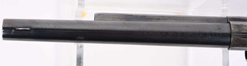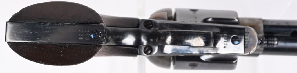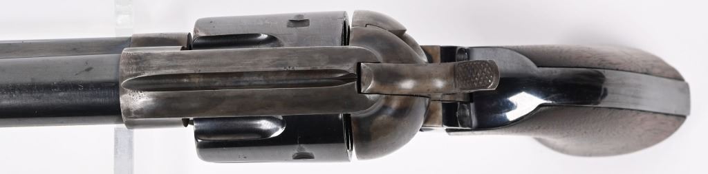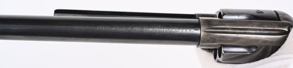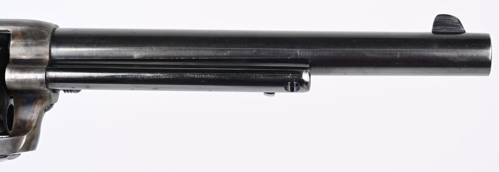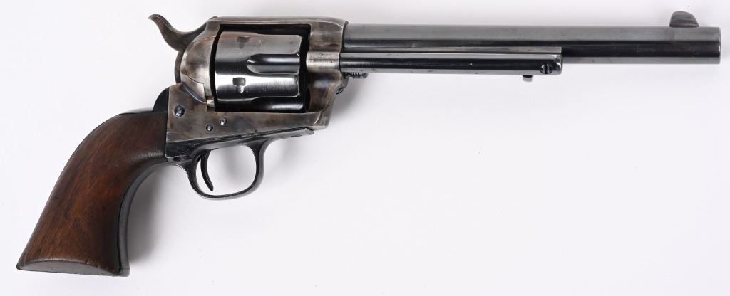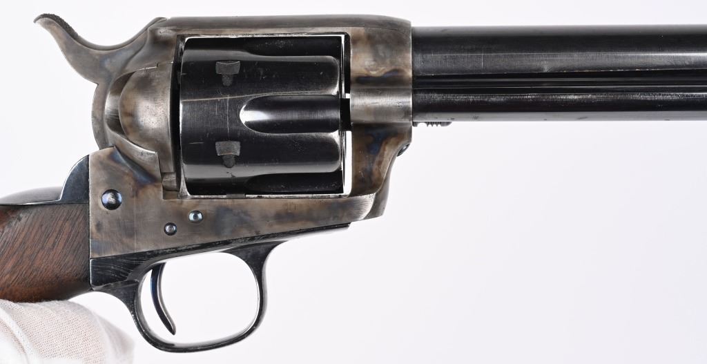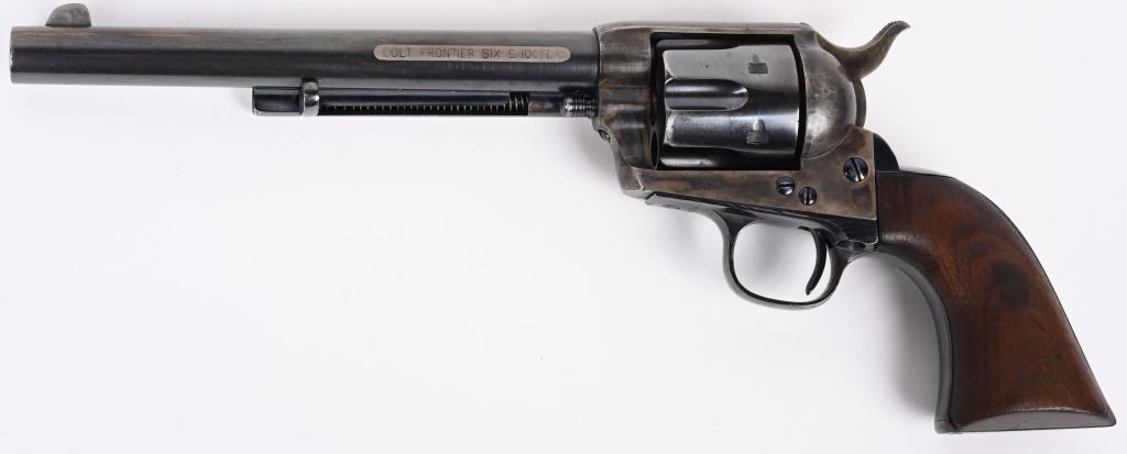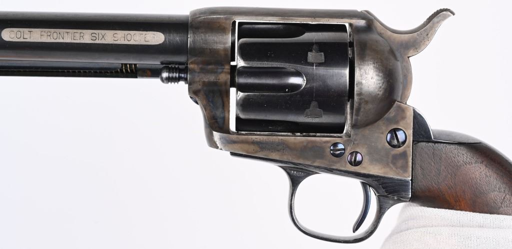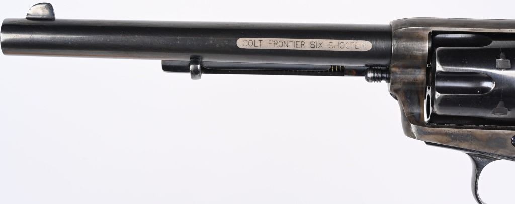 SERIAL 103136. BARREL 7.5". CALIBER 44-40. MADE IN 1884. Standard blue and case color single action. Etched panel reads COLT FRONTIER SIX SHOOTER. Trigger guard stamped .44 CF along with 44 under barrel. Matching serial number on frame, trigger guard, and back strap. Black powder screw in frame. One piece walnut grips. 3-line patent stamps on frame. Colt address one line on barrel. Condition. Gun was professionally restored to near new condition with proper case colors, proper blue, razor sharp legends, Action indexes and locks up like new. Bore is strong and clean. Grips are excellent but a hair shy in places. Gun has few minute areas of finish wear only. Brilliant etched panel. Solid 98% gun with most visible wear on cylinder high edges. Gorgeous gun. ANTIQUE