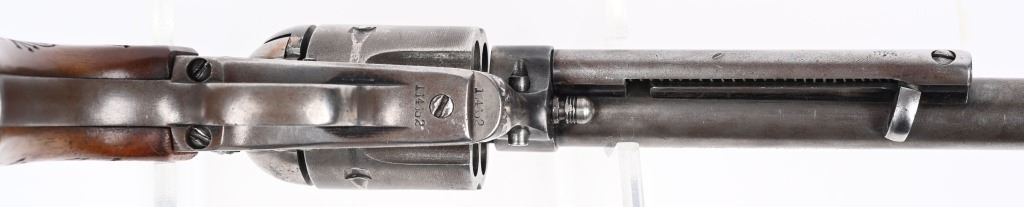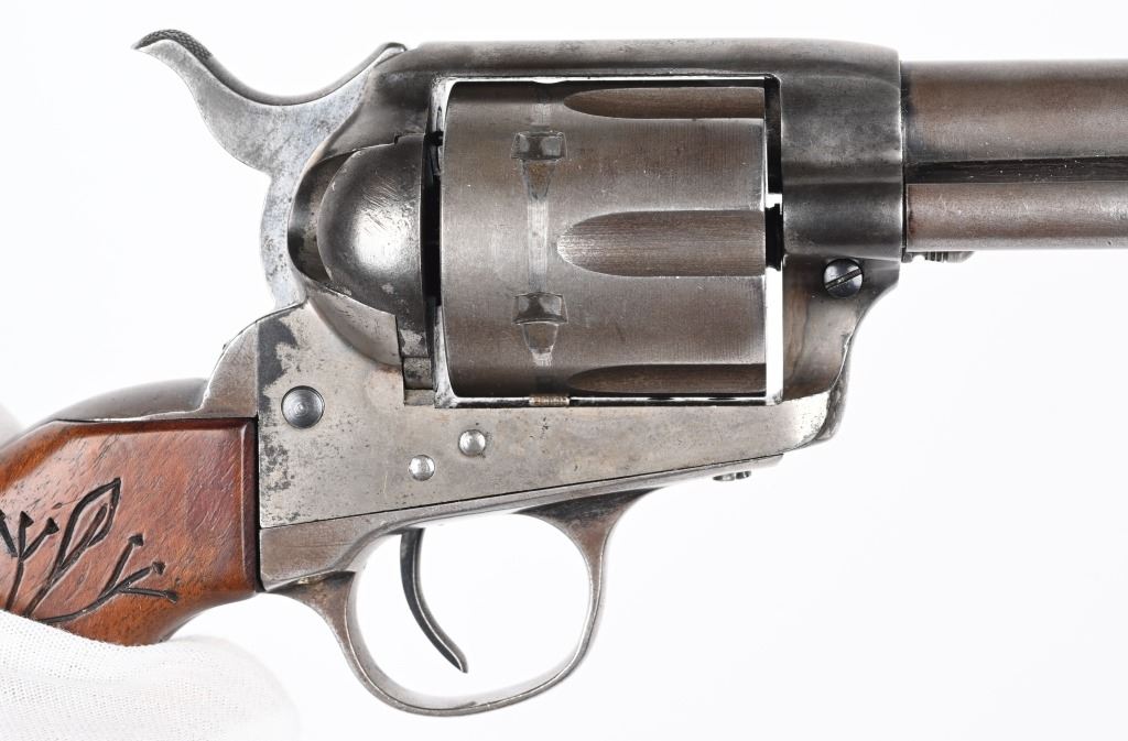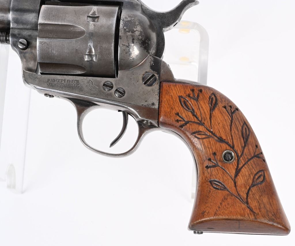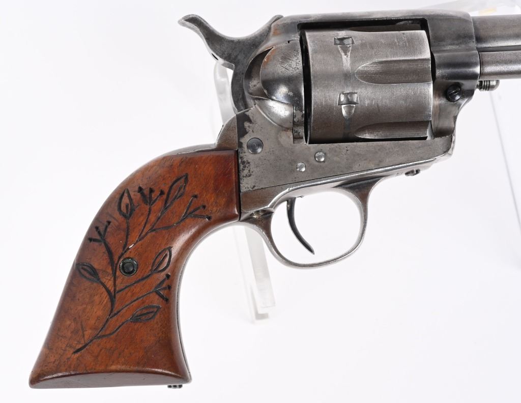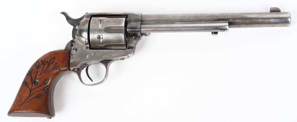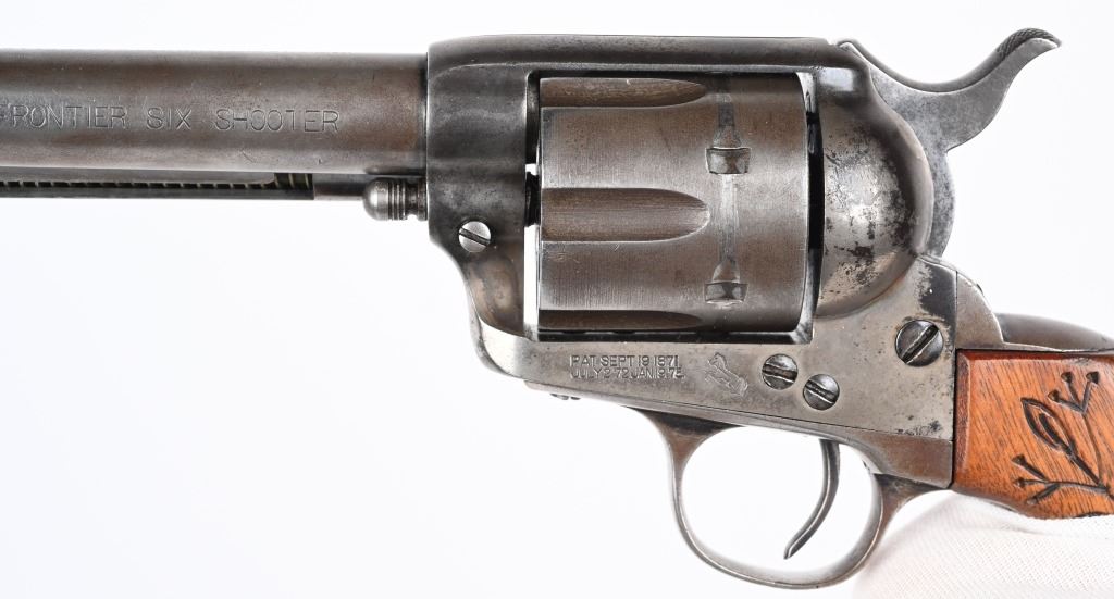 SERIAL 164352. BARREL 7.5". CALIBER 44-40. MADE IN 1896. Standard roll die SAA in blue / case color with replacement 2-pc grips. One line barrel address. Two line patent address on frame with Pony. Barrel roll die COLT FRONTIER SIX SHOOTER. Matching numbers on frame, trigger guard and back strap. Condition. Front sight shortened. Grips replaced. Hint of color on frame. Balance soft gray patina with sharp legends. Indexes and locks up tight but no half cock. Bore is crisp with light frosting. ANTIQUE