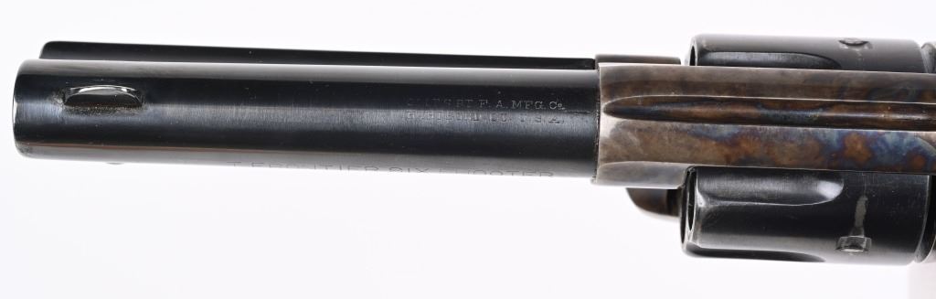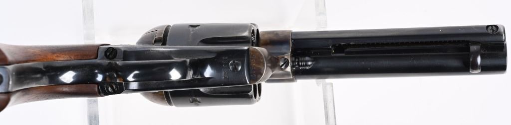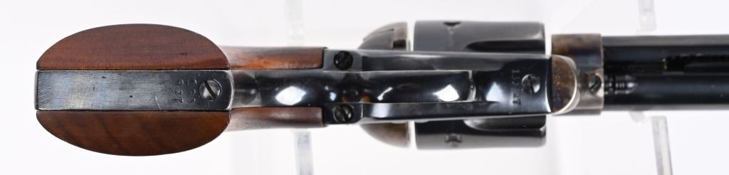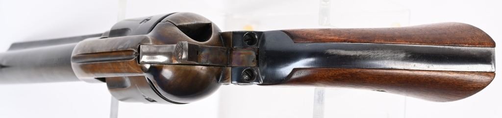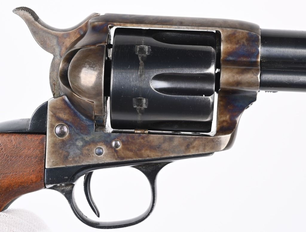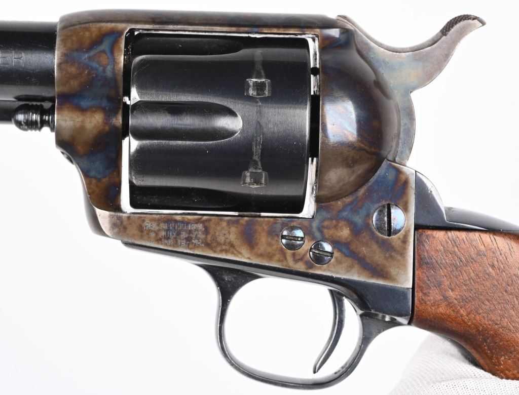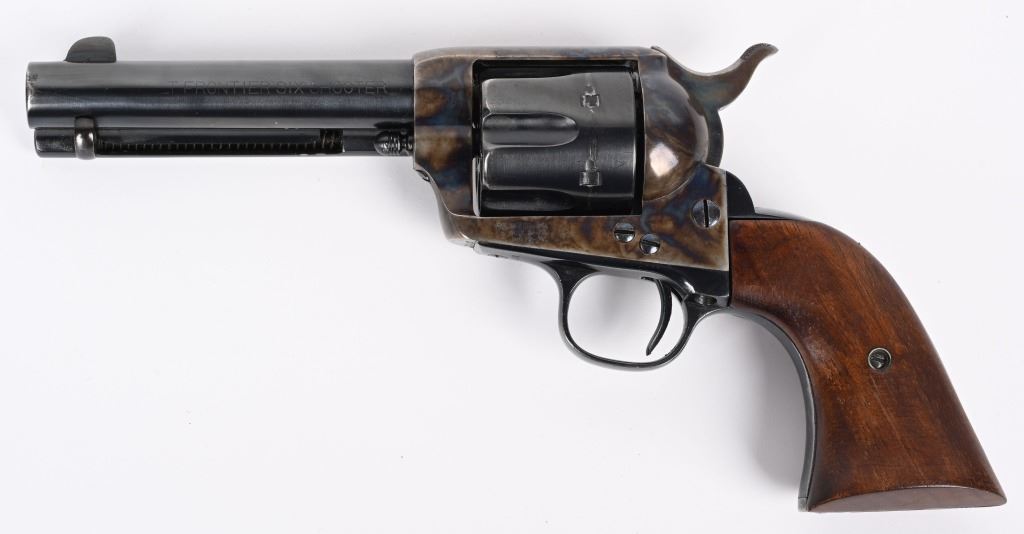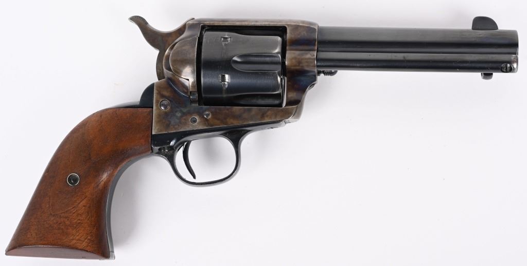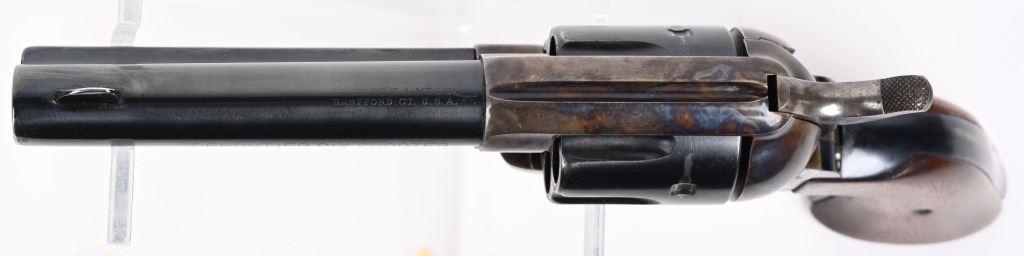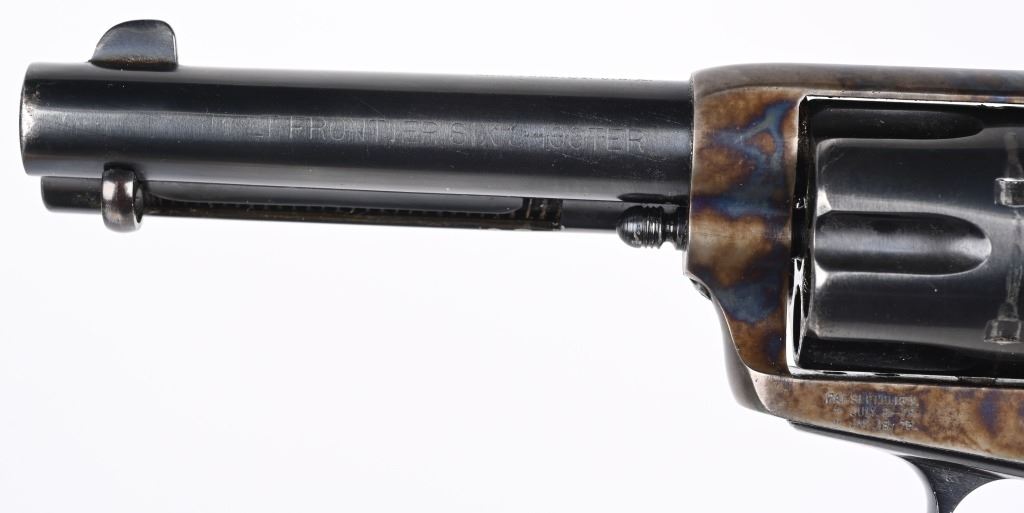 SERIAL 130827. CALIBER 44-40. BARREL 4 3/4". MADE IN 1890. Standard roll die SAA in blue / case color with replacement 2-pc grips. Two line barrel address. Three line patent address on frame. Barrel roll die COLT FRONTIER SIX SHOOTER. Matching numbers on frame, trigger guard and back strap. Condition. Expertly restored to near new condition with brilliant correct case colors and blue showing only light high edge wear at muzzle and cylinder Indexes and locks up tight with solid half cock. Bore is crisp. Sharp legends on frame. Barrel address good with a hint of thinning. Handsome early Frontier SAA. ANTIQUE