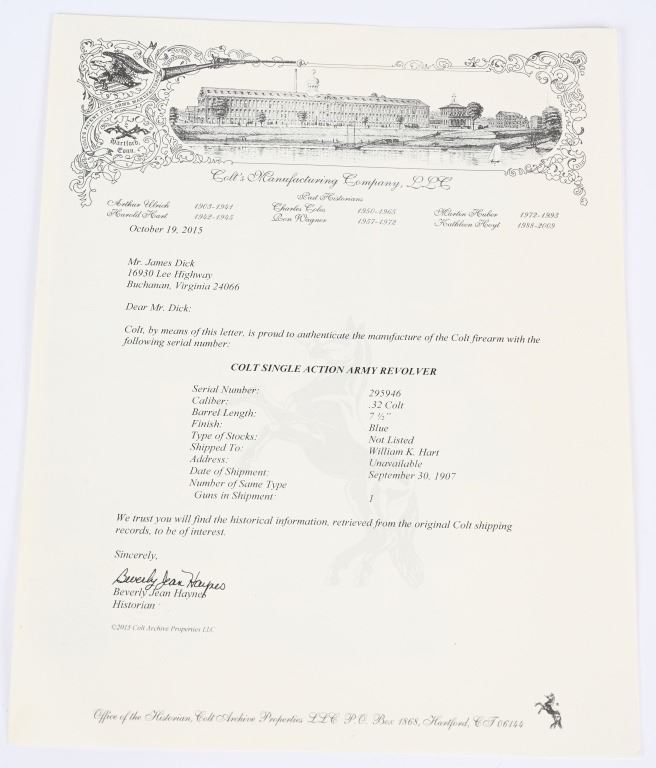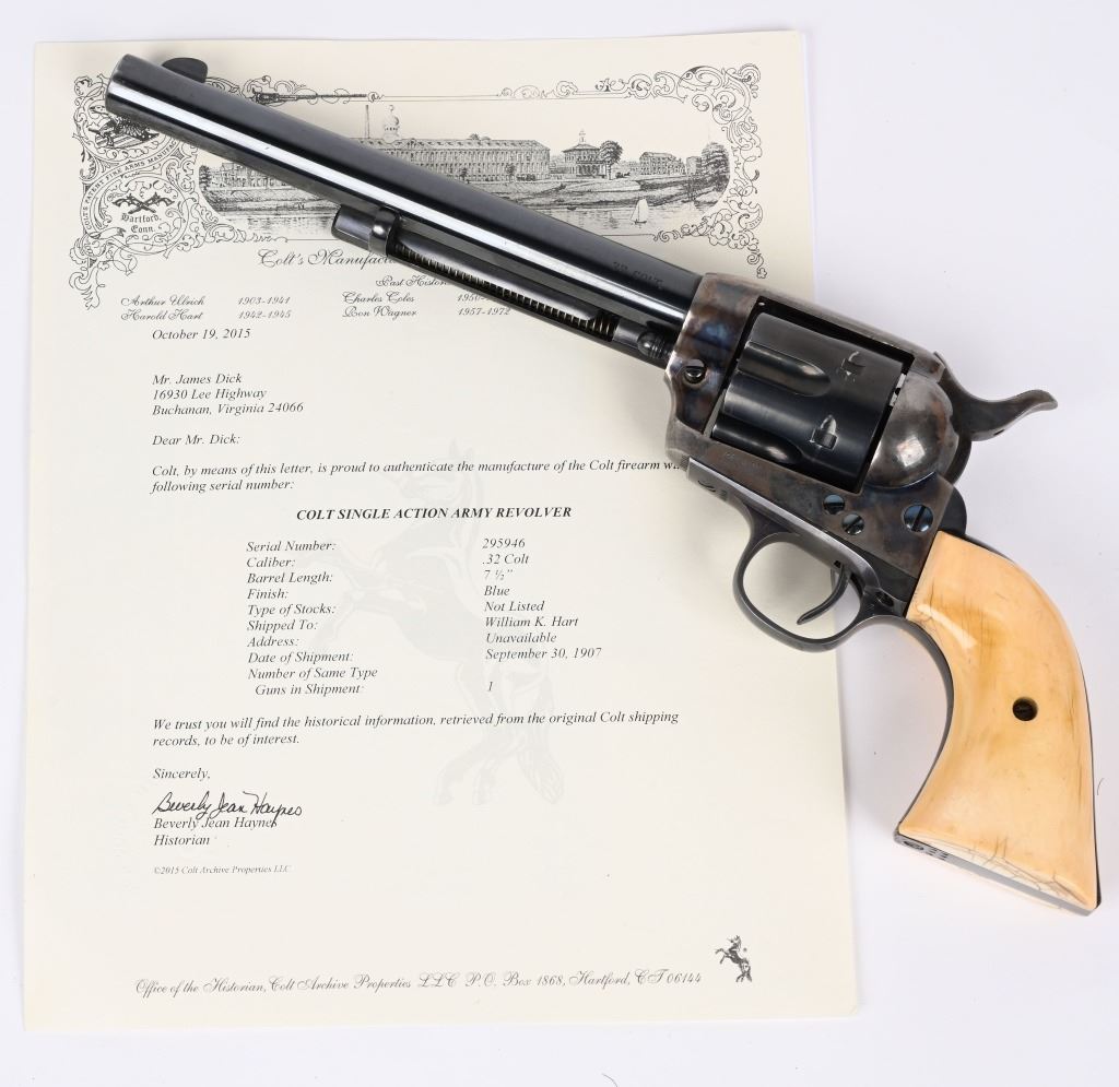 SERIAL 295946. BARREL 7.5". CALIBER .32 COLT. Matching numbers. Letter states guns shipped on 9-30-1907 in shipment of one to William K. Hart (no address) in .32 Colt with blue finish, grips not listed (now 2-piece aged ivories) Standard blue and case color finish, fire blue screws, one line barrel address, two line frame patent dates. One of the scarcer calibers as only 192 standard Peacemakers were ever made in this caliber. Comes in wood display case with letter. Condition. There is a hint of muzzle wear, a light drag line, some finish thinning on grip strap and back strap. Overall, solid 90% with bright case colors, bright blue on screws, stunning grips. Action indexes perfectly but no half cock. Bore is brilliant. Legends are sharp. C&R