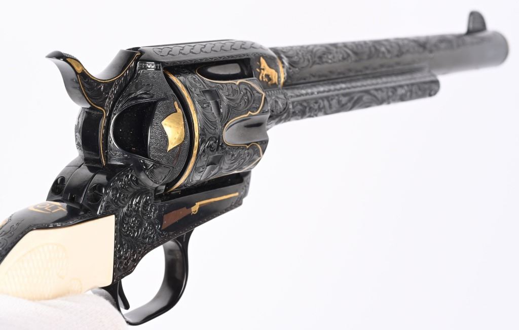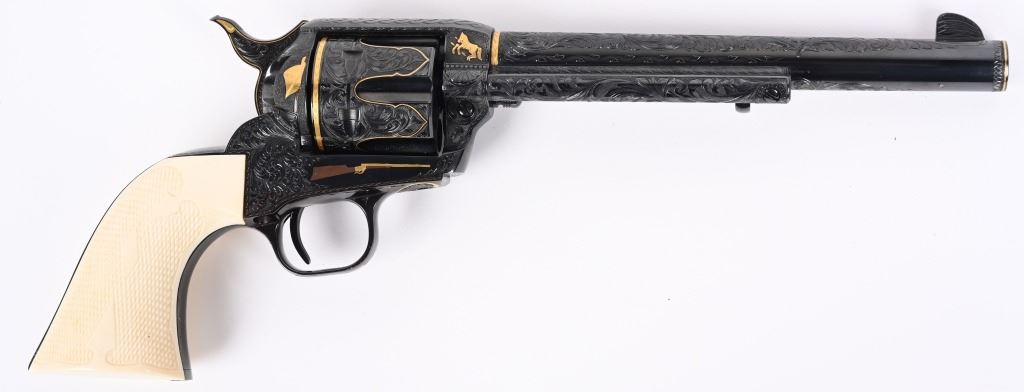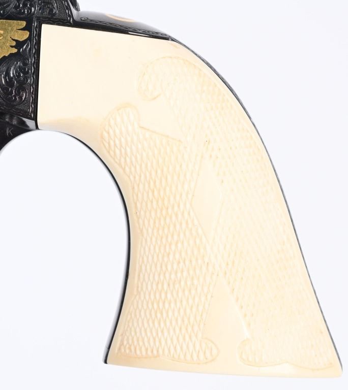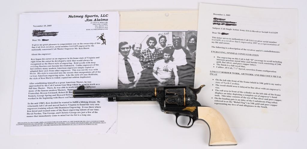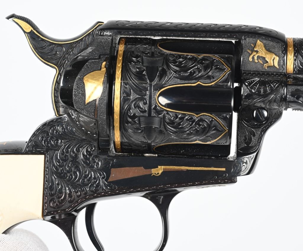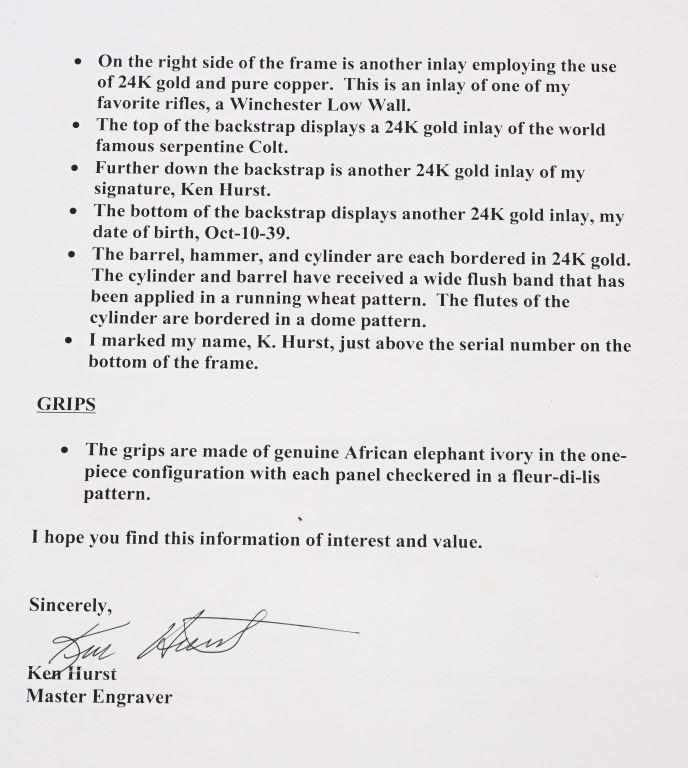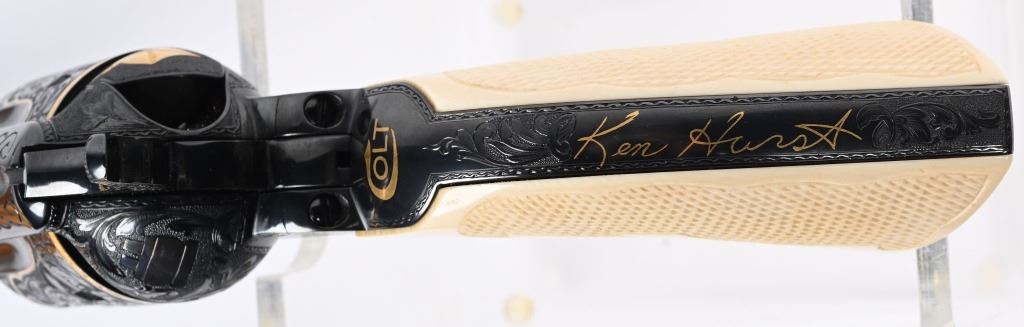 SERIAL NUMBER SA11439. BARREL 7.5". CALIBER .45 COLT. Letter from Hurst stating he engraved this gun in 1997 " as a representation of my life and career". Full D coverage in scroll with intricate precious metal inlay and border work of 24K gold, fine sliver and pure copper inlays. Left side has gold inlaid outline of his home state of N. Carolina. Finish is royal blue. Has the never seen screw less frame. Gate has inlaid southern flag, left side of frame has an inlaid gold Lo-Wall rifle (his favorite) , Raised gold pony on upper right side of frame Gold border on hammer, barrel, trigger guard, & cylinder. Ken Hurst a\utograph in gold on back strap with "Colt". There is a silver and copper inlay of engraving tools on front left frame roll. Gun is finished in full royal blue. Grips are hand checkered African Elephant ivory in fleur-de-lis pattern. Oct 10-39 in gold on butt (his birthday) The flute cylinders have gold wire dome pattern. Ken Hurst was a Colt master engraved and there is a 3-page letter from Jim Alaimo, former superintendent Colt Custom Shop detailing the work performed on this gun as well as Ken's history and accolades. Also comes with a copy of a 1979 of Colt engravers that includes Howard Dover, the largest group of in house master engravers at the same time. Condition. Near new as finished, shows literally no wear or use sans maybe a minor handling mark. Exquisite. MODERN