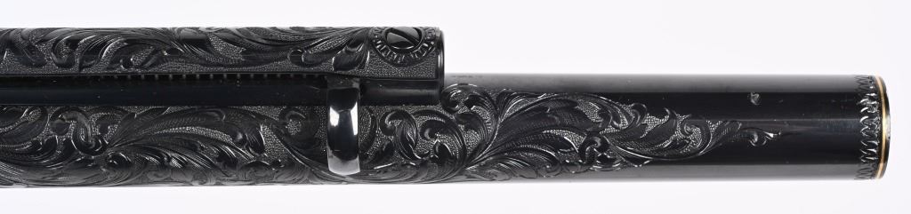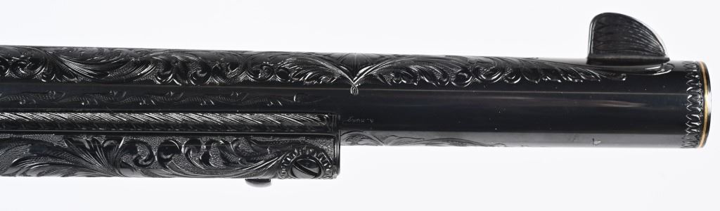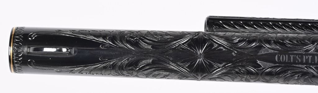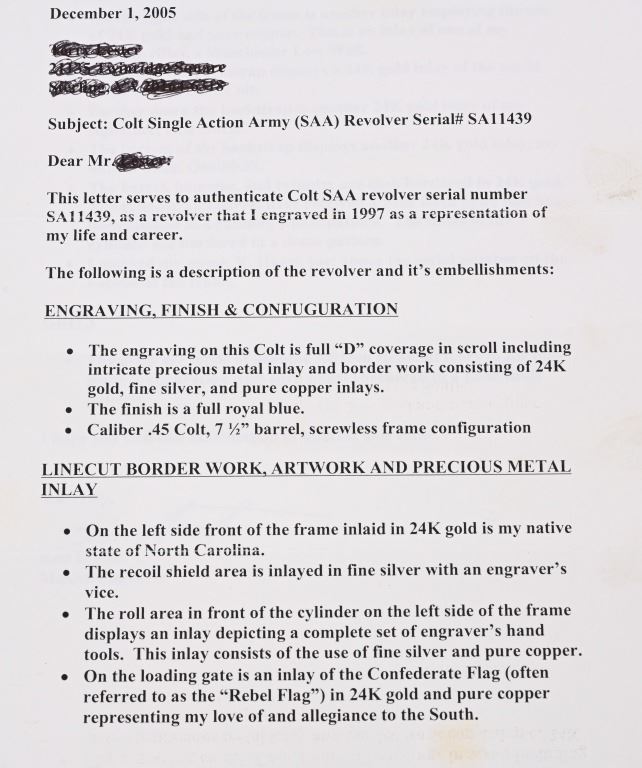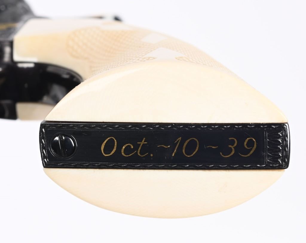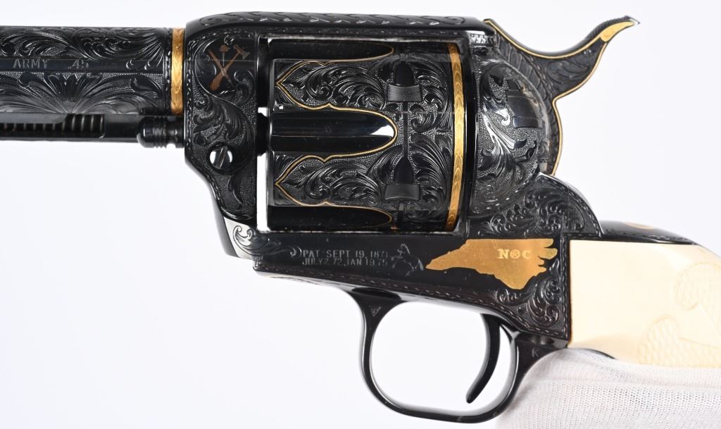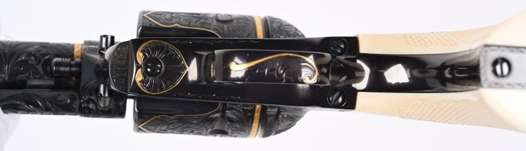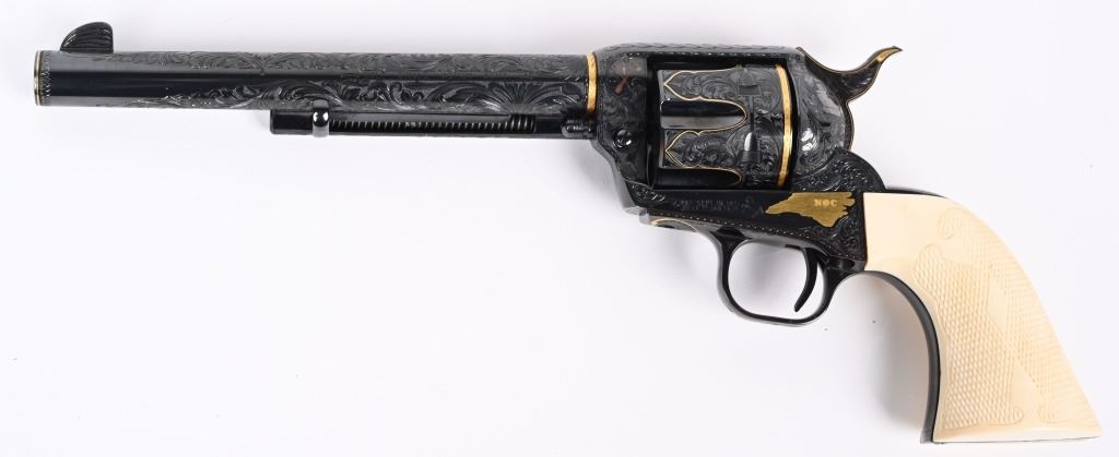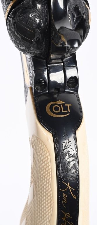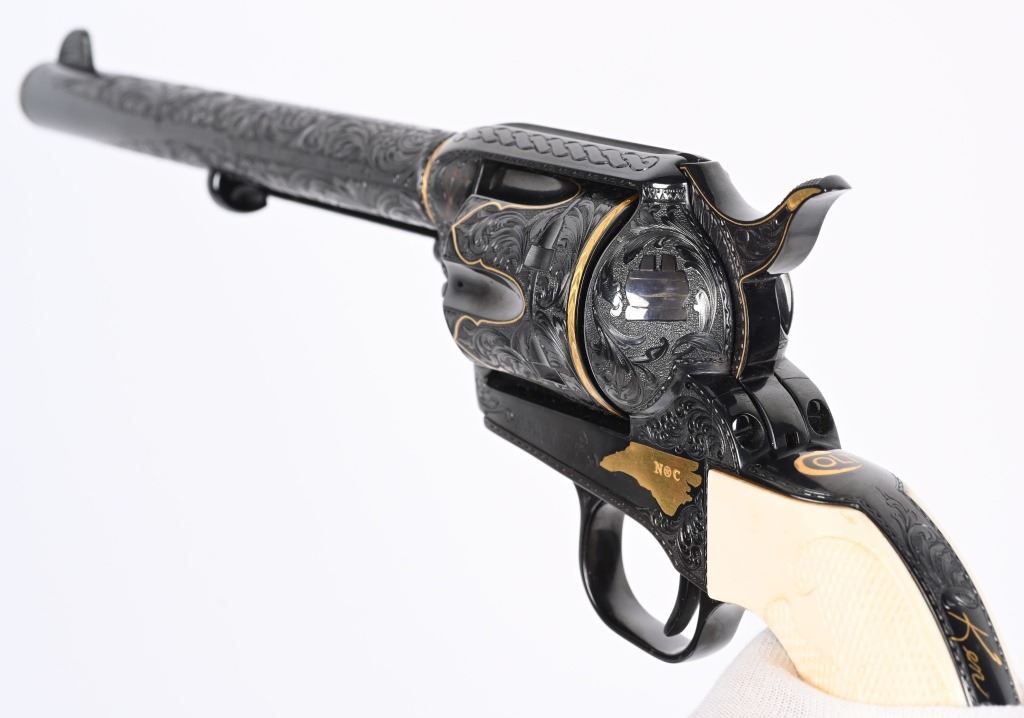 SERIAL NUMBER SA11439. BARREL 7.5". CALIBER .45 COLT. Letter from Hurst stating he engraved this gun in 1997 " as a representation of my life and career". Full D coverage in scroll with intricate precious metal inlay and border work of 24K gold, fine sliver and pure copper inlays. Left side has gold inlaid outline of his home state of N. Carolina. Finish is royal blue. Has the never seen screw less frame. Gate has inlaid southern flag, left side of frame has an inlaid gold Lo-Wall rifle (his favorite) , Raised gold pony on upper right side of frame Gold border on hammer, barrel, trigger guard, & cylinder. Ken Hurst a\utograph in gold on back strap with "Colt". There is a silver and copper inlay of engraving tools on front left frame roll. Gun is finished in full royal blue. Grips are hand checkered African Elephant ivory in fleur-de-lis pattern. Oct 10-39 in gold on butt (his birthday) The flute cylinders have gold wire dome pattern. Ken Hurst was a Colt master engraved and there is a 3-page letter from Jim Alaimo, former superintendent Colt Custom Shop detailing the work performed on this gun as well as Ken's history and accolades. Also comes with a copy of a 1979 of Colt engravers that includes Howard Dover, the largest group of in house master engravers at the same time. Condition. Near new as finished, shows literally no wear or use sans maybe a minor handling mark. Exquisite. MODERN