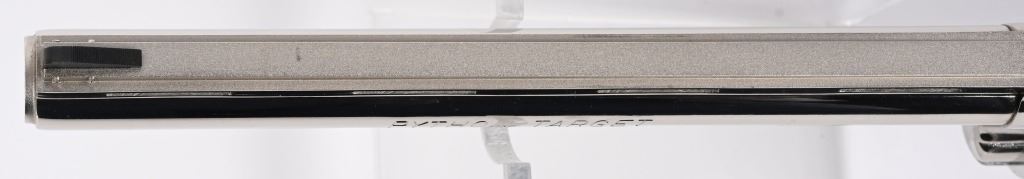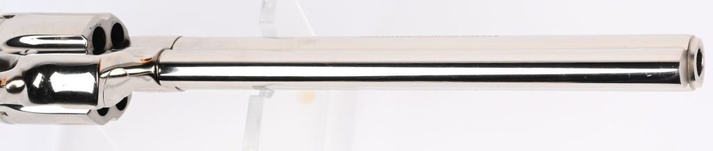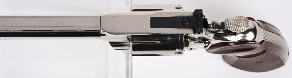 SERIAL K07070. BARREL 8". CALIBER .357 MAGNUM. MADE IN 1980. Scarce 38 Target , full nickel finish, target hammer, target rear sight, full vent rib and under lug, checkered walnut grips with gold medallion. Comes in styrofoam liner with paperwork. Condition. Shows signs having been lightly fired with ghost drag line and minor handling only. Bright bore. Very tough to find a nickel .38 target in near mint condition. Solid 99% plus condition. MODERN