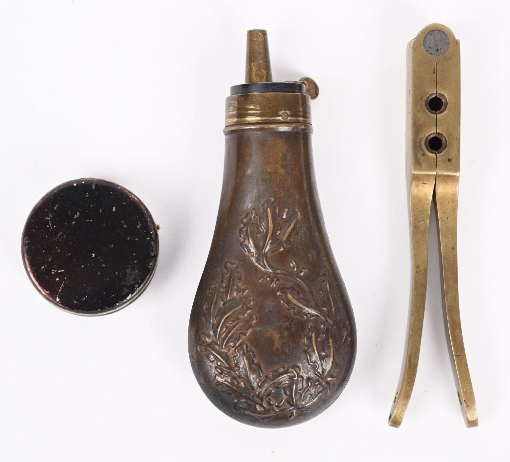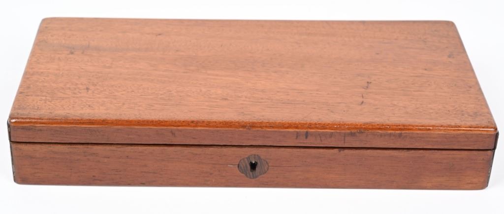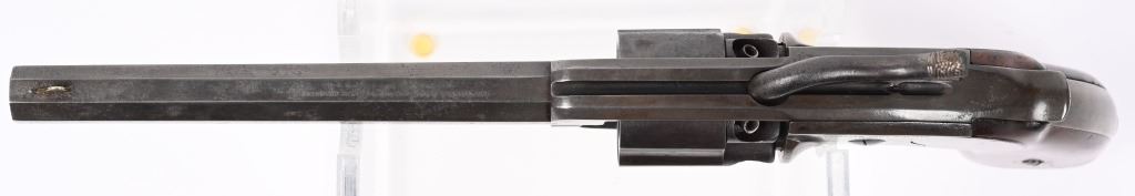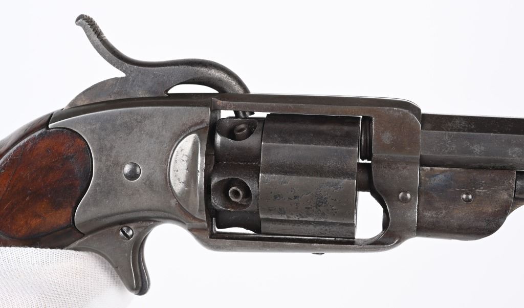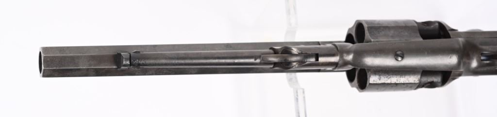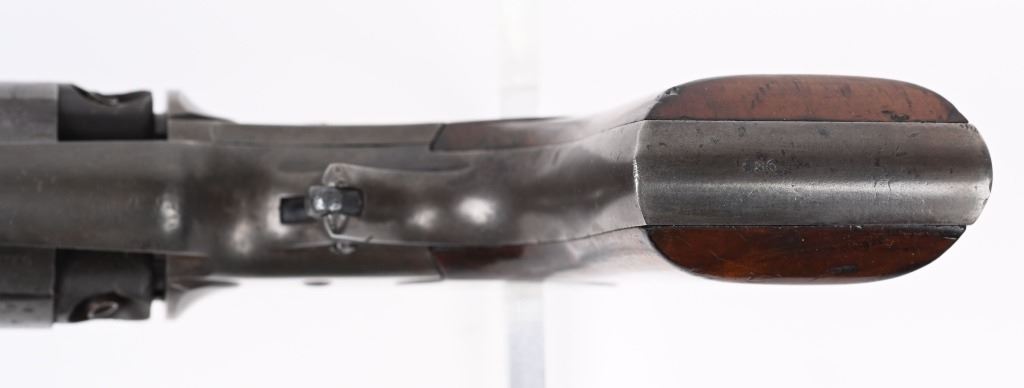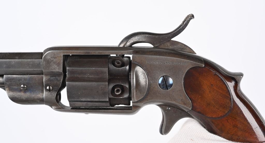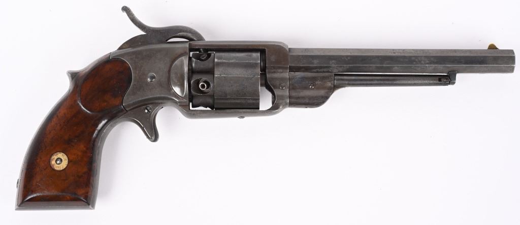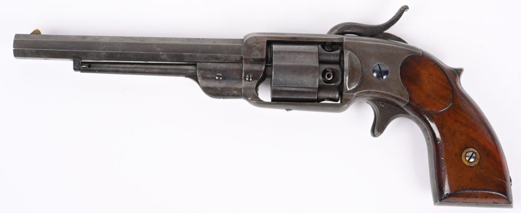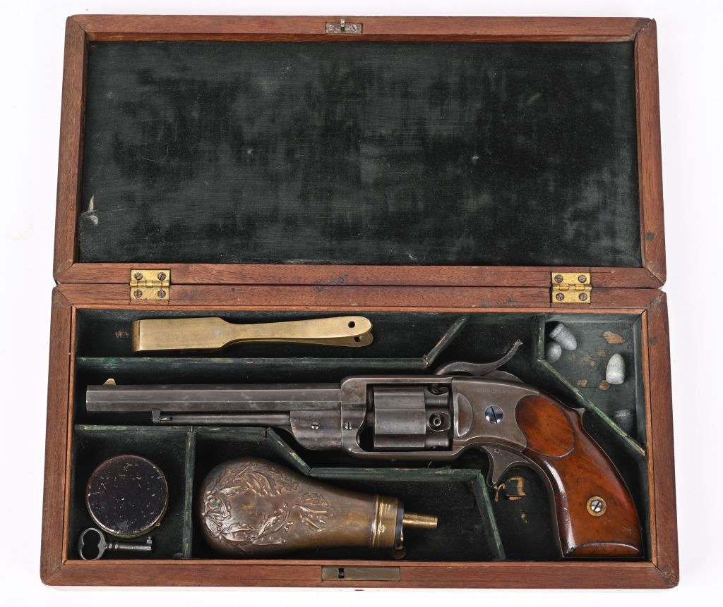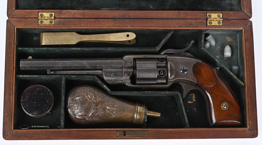 SERIAL NUMBER 436 BARREL 5 1/2" CALIBER .36 BLACK POWDER MANUFACTURED 1862-1863. With an extremely low production estimated at less than 500. Octagon barrel with fluted cylinder. Tall spur hammer located in center of top strap. 5 shot , brass blade front sight with spur trigger and 2 piece highly figured burl walnut grips with brass escutcheons. Revolver is cased in partitioned Hartford pattern case with floral embossed powder flask , cap tin with caps and partial label, bow legged brass dual cavity mold marked "KMH 4" and key. CONDITION. Fine with exterior having toned to a mixed blue / plum patina. Bore is very fine with sharp rifling. Action operates properly. Some small amounts of light pitting on top barrel flat obscuring barrel address and a small area of pitting on one side of cylinder. Grips are excellent. Action operates properly. Case is excellent with solid partitions and good green velvet lining. Mold is very fine. Cap tin is excellent and flask is very good and functions properly. ANTIQUE