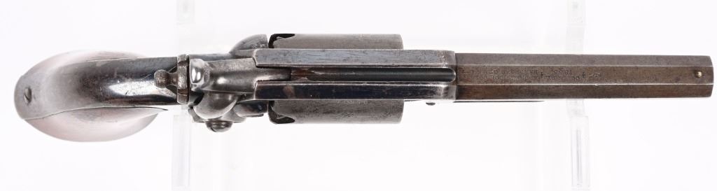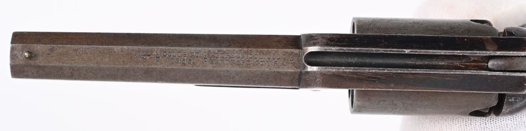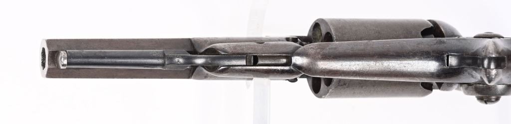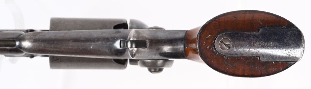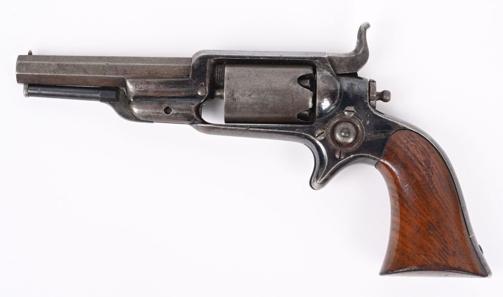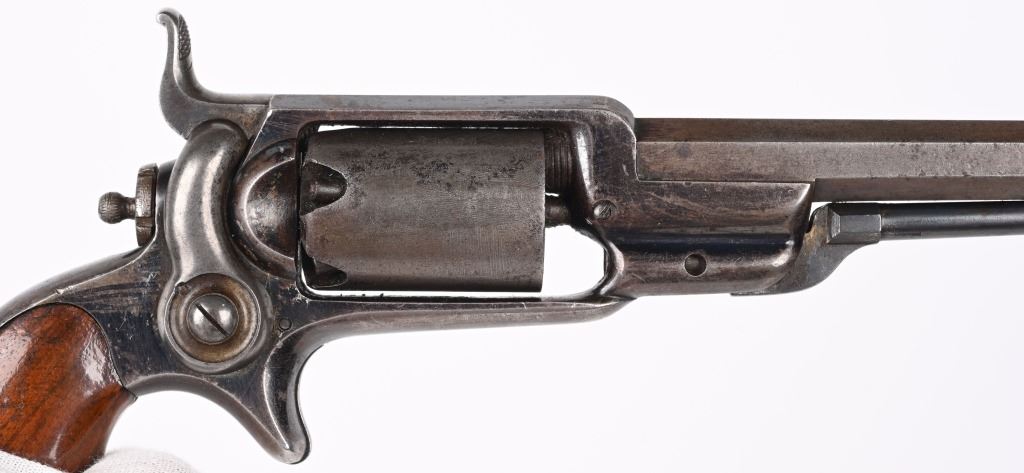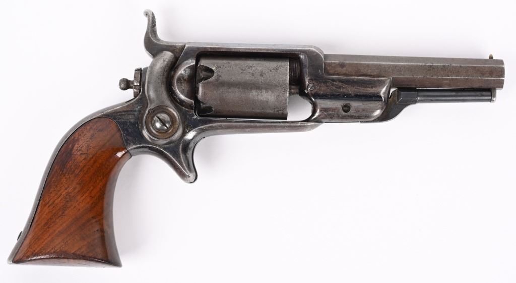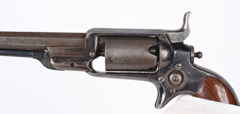 SERIAL NUMBER 14214 BARREL 3 1/2" CA;IBER 28 CAL, BLACK POWDER MANUFACTURED 1856. Full octagon barrel with Pointing finger motif and 2 line Colt's address. Round cylinder is embellished with the W.L. Ormsby Cabin & Indian fight cylinder scene. Serial numbered on underside of barrel , side of cylinder and butt of grip. One piece varnished walnut grips. Earliest example of a solid frame revolver from Colt with integral top strap. Designed by Superintendent and later President of Colt Firearms Elisha Root. CONDITION, Very fine with action operating properly and having a fine bore and chambers. Grips are very fine with most all finish remaining. Exterior retains 30% blue with balance having toned to a plum color. ANTIQUE