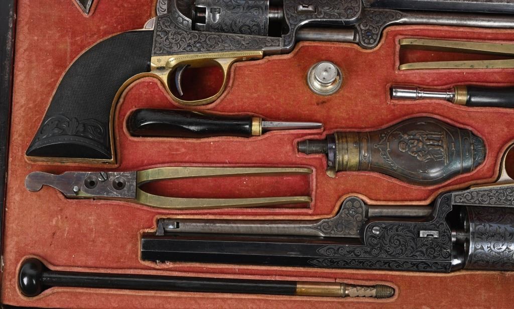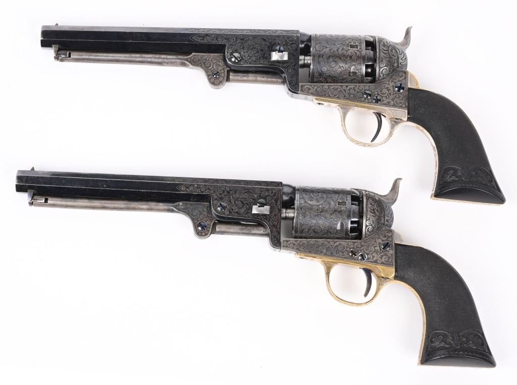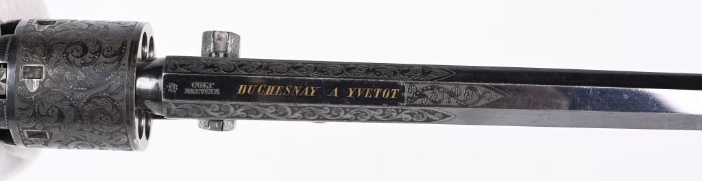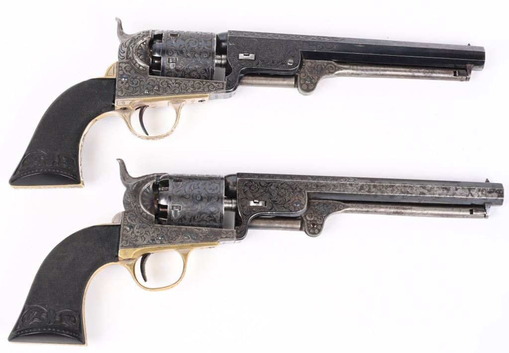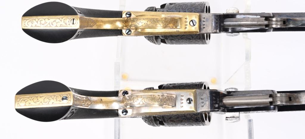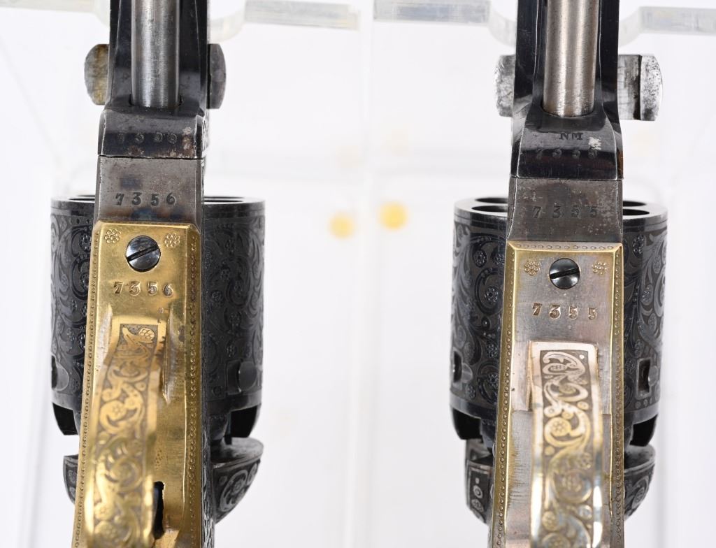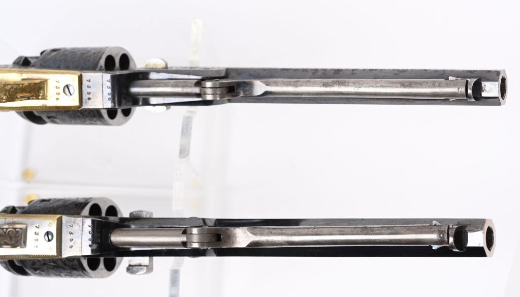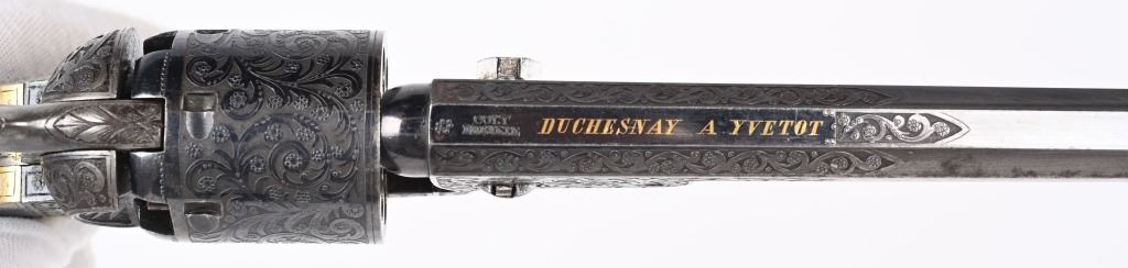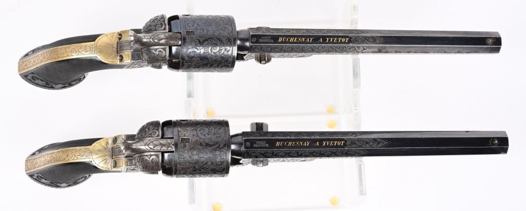 SERIAL NUMBERS, 7355 / 7356 BARREL 7 1/2" (BOTH) CALIBER .36 BLACK POWDER MANUFACTURED CIRCA 1860. Believed to be the finest known cased matched pair of Belgian Brevete Colt Navy revolvers to exist. Deeply scroll and vine engraved with case color frames and brilliant high polish blue barrels and cylinders with silver washed trigger guards and backstrap. Finely checkered ebony one piece grips with elaborate relief carving at base. Gold inlaid on top flat of barrel "DUCHESAY A YNETOT" Belgian proofed at rear edge of cylinder and marked "COLT BREVETE" at rear of barrel forward of forcing cone. Consecutive serial numbered revolvers are elaborately displayed in a French fitted red velvet lined case with all accessories. These revolvers are a recent discovery and not previously offered. These Brevete Colt pattern revolvers were known to be offered to the south during the United States Civil War and some were not able to be delivered due to the blockade by the United States Navy. CONDITION. Very fine with most all blue finish remaining with some finish loss on left side of barrel. All accessories are very fine, Case is excellent. ANTIQUE