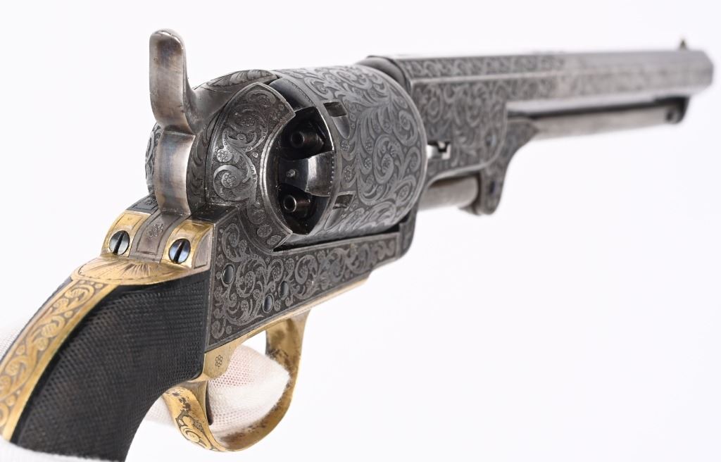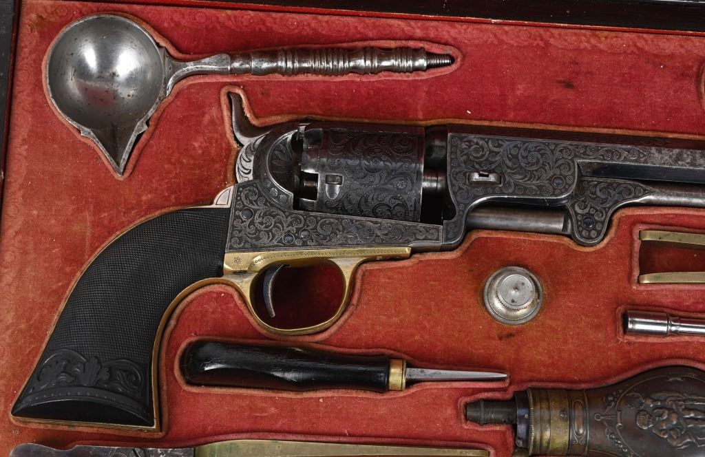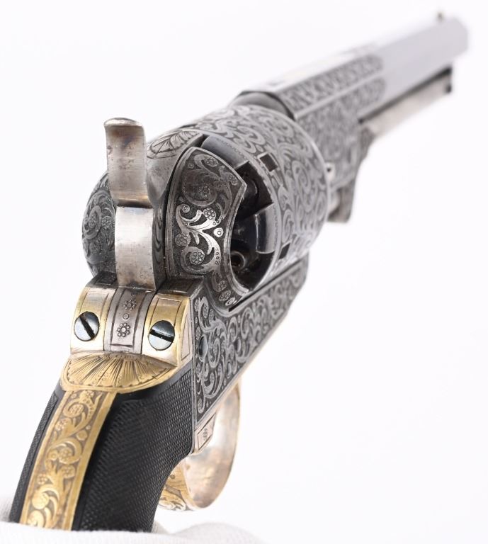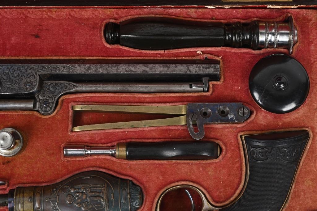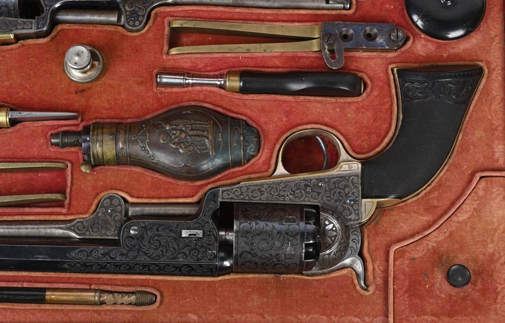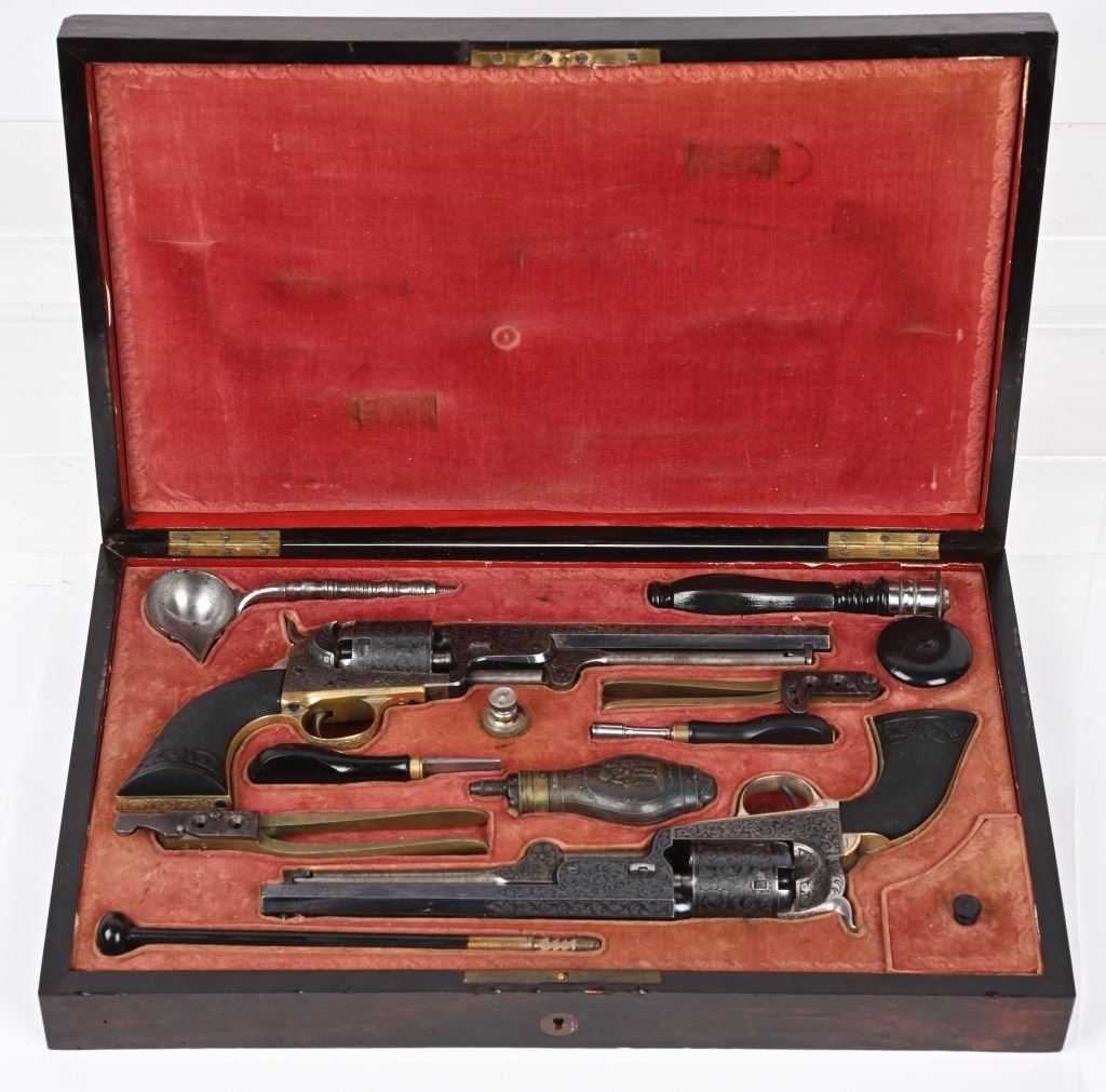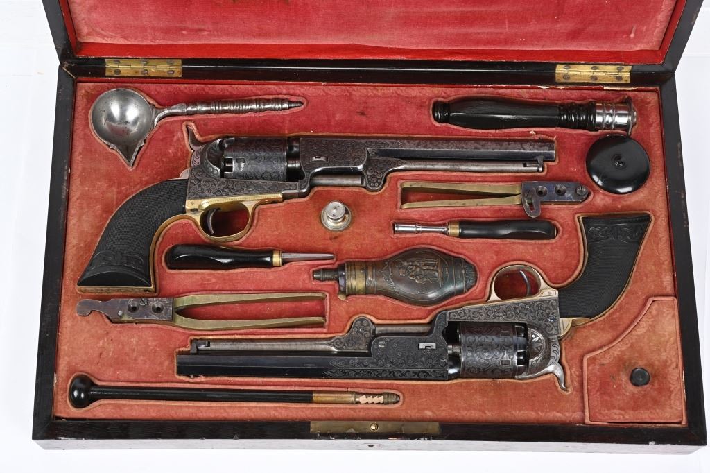 SERIAL NUMBERS, 7355 / 7356 BARREL 7 1/2" (BOTH) CALIBER .36 BLACK POWDER MANUFACTURED CIRCA 1860. Believed to be the finest known cased matched pair of Belgian Brevete Colt Navy revolvers to exist. Deeply scroll and vine engraved with case color frames and brilliant high polish blue barrels and cylinders with silver washed trigger guards and backstrap. Finely checkered ebony one piece grips with elaborate relief carving at base. Gold inlaid on top flat of barrel "DUCHESAY A YNETOT" Belgian proofed at rear edge of cylinder and marked "COLT BREVETE" at rear of barrel forward of forcing cone. Consecutive serial numbered revolvers are elaborately displayed in a French fitted red velvet lined case with all accessories. These revolvers are a recent discovery and not previously offered. These Brevete Colt pattern revolvers were known to be offered to the south during the United States Civil War and some were not able to be delivered due to the blockade by the United States Navy. CONDITION. Very fine with most all blue finish remaining with some finish loss on left side of barrel. All accessories are very fine, Case is excellent. ANTIQUE