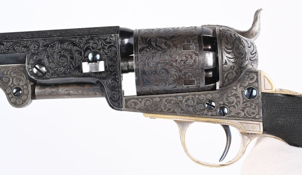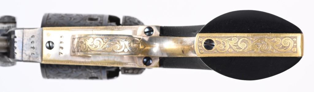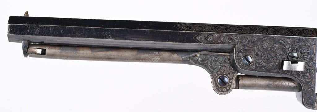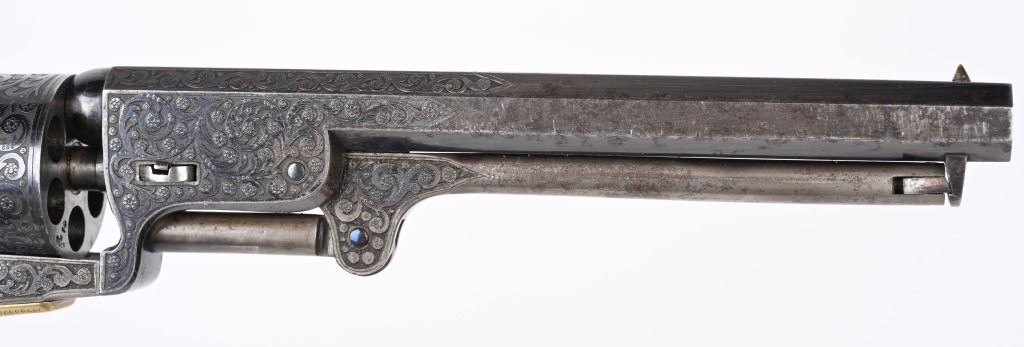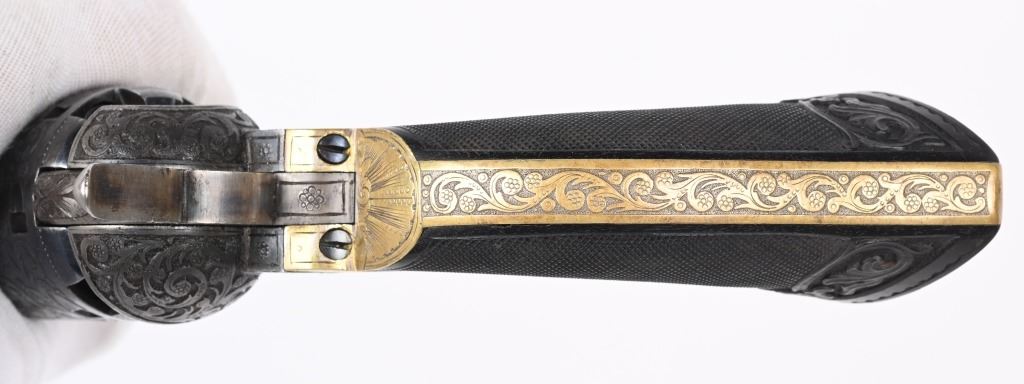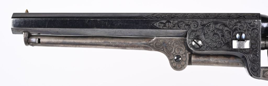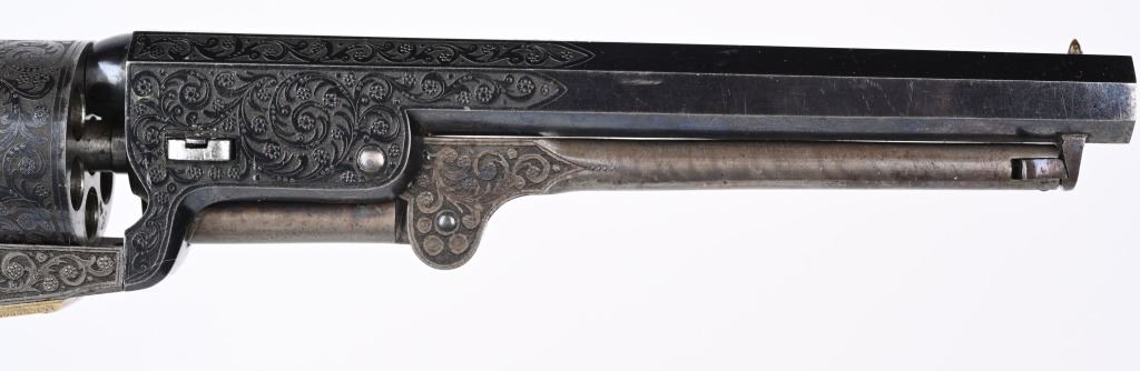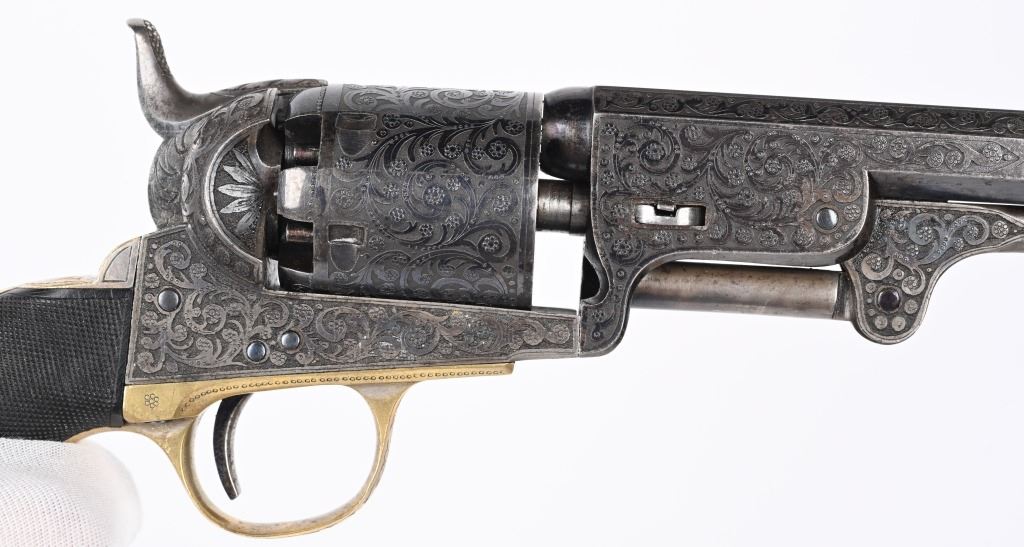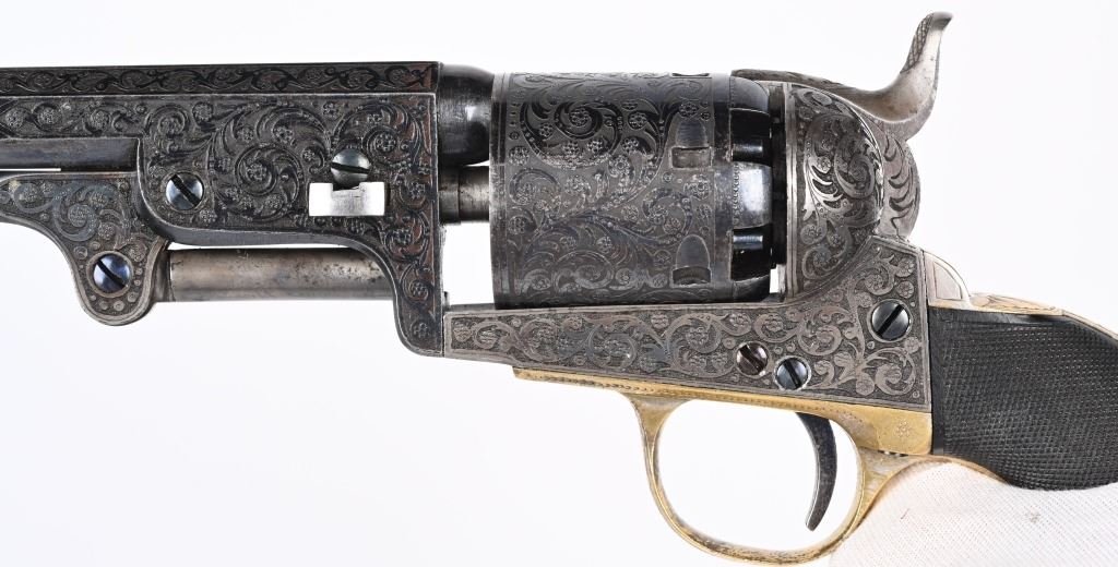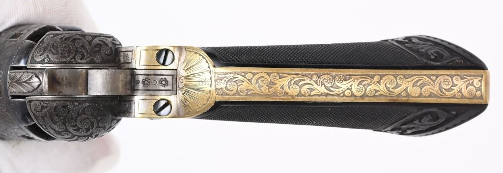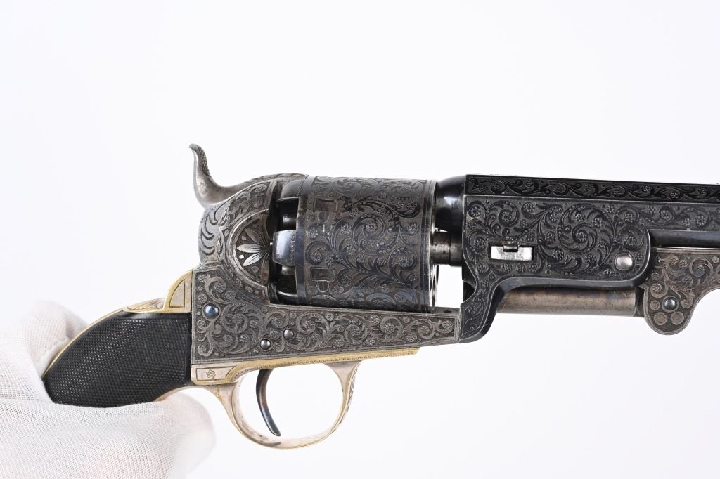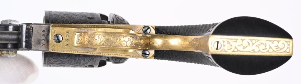 SERIAL NUMBERS, 7355 / 7356 BARREL 7 1/2" (BOTH) CALIBER .36 BLACK POWDER MANUFACTURED CIRCA 1860. Believed to be the finest known cased matched pair of Belgian Brevete Colt Navy revolvers to exist. Deeply scroll and vine engraved with case color frames and brilliant high polish blue barrels and cylinders with silver washed trigger guards and backstrap. Finely checkered ebony one piece grips with elaborate relief carving at base. Gold inlaid on top flat of barrel "DUCHESAY A YNETOT" Belgian proofed at rear edge of cylinder and marked "COLT BREVETE" at rear of barrel forward of forcing cone. Consecutive serial numbered revolvers are elaborately displayed in a French fitted red velvet lined case with all accessories. These revolvers are a recent discovery and not previously offered. These Brevete Colt pattern revolvers were known to be offered to the south during the United States Civil War and some were not able to be delivered due to the blockade by the United States Navy. CONDITION. Very fine with most all blue finish remaining with some finish loss on left side of barrel. All accessories are very fine, Case is excellent. ANTIQUE
